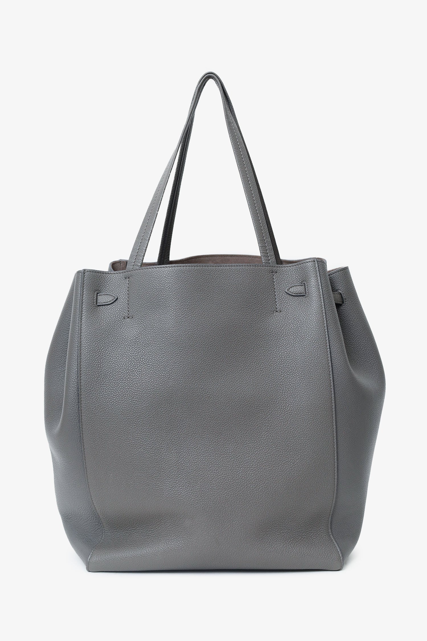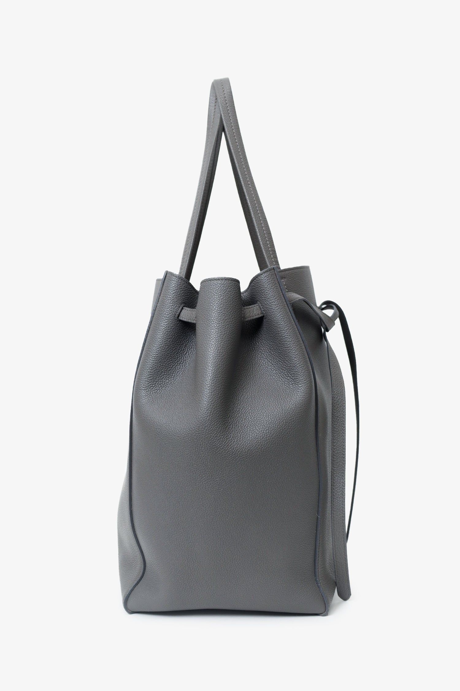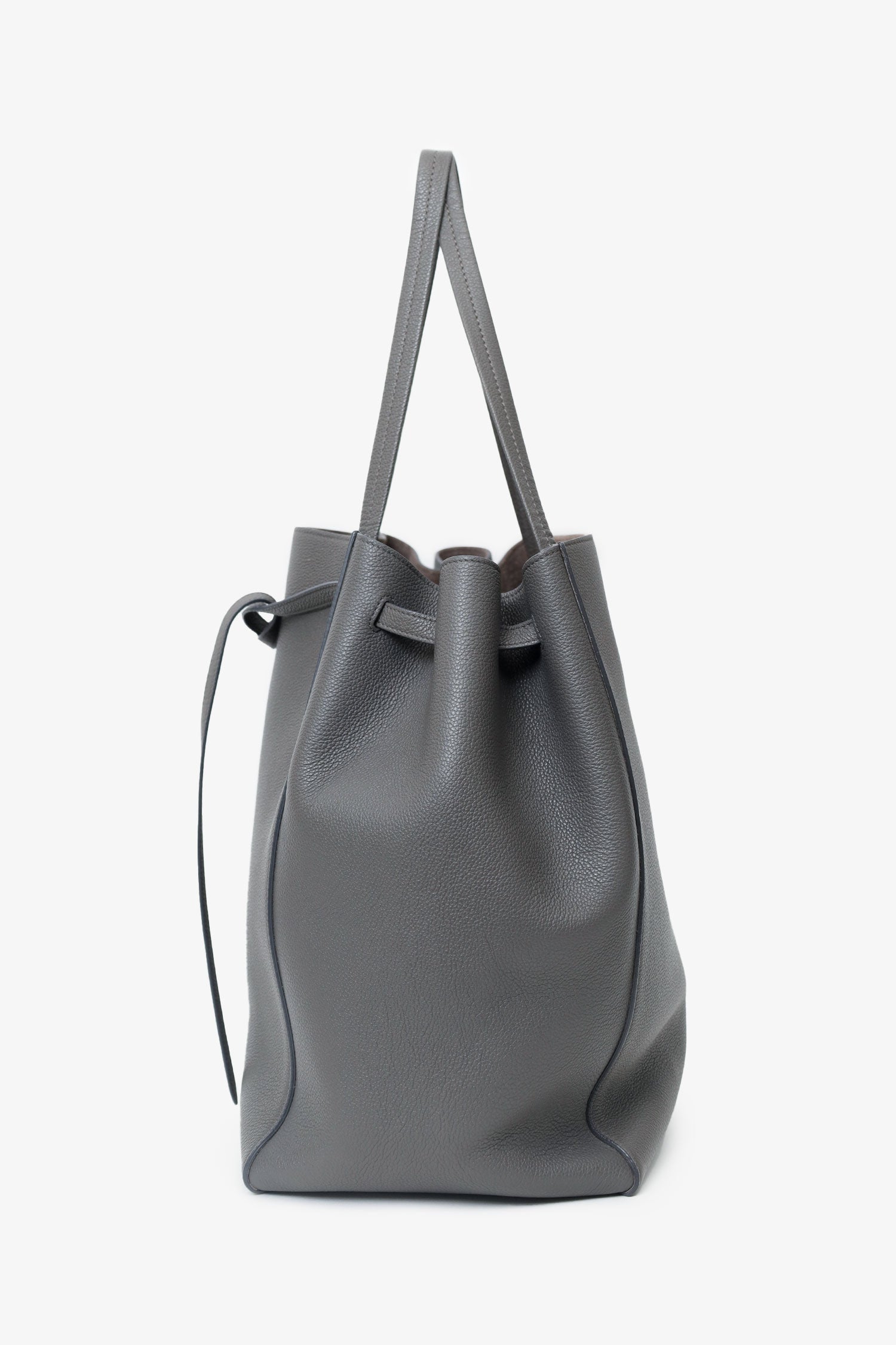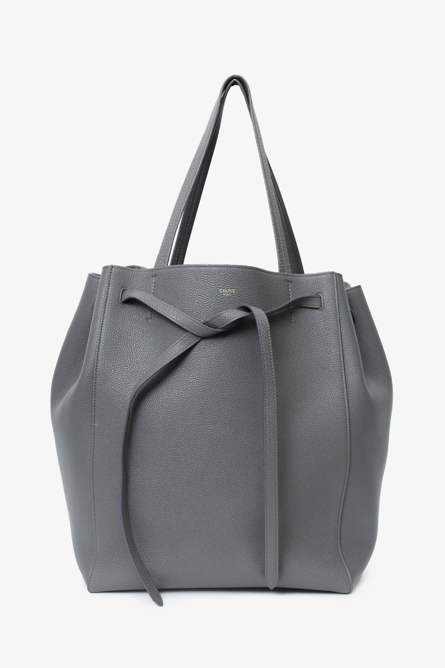 Refresh availabilityCeline Grey Leather Medium Tassel Phantom Cabas Tote. Top open with drawstring closure. Twin top handles. Suede-lined interior. 3 interior pockets; 1 zip, and 2 slip. Gold-tone hardware. Tonal stitching.