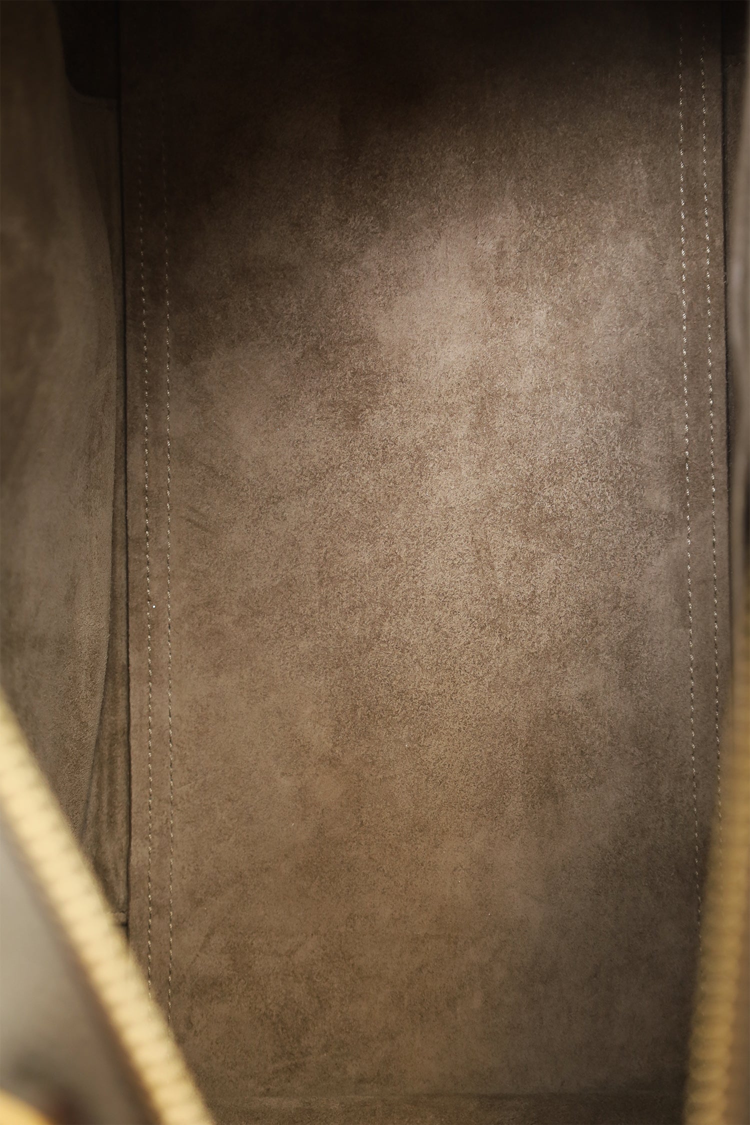 Refresh availabilityCeline Khaki Green Leather Ring Bag. Top zip closure. Twin straps. Snap-button closure on top side exterior. Front exterior slip pocket. Protective studs on bottom. Suede-lined interior. 3 interior pockets; 1 zip and 2 slip. Gold-tone hardware. Tonal stitching.