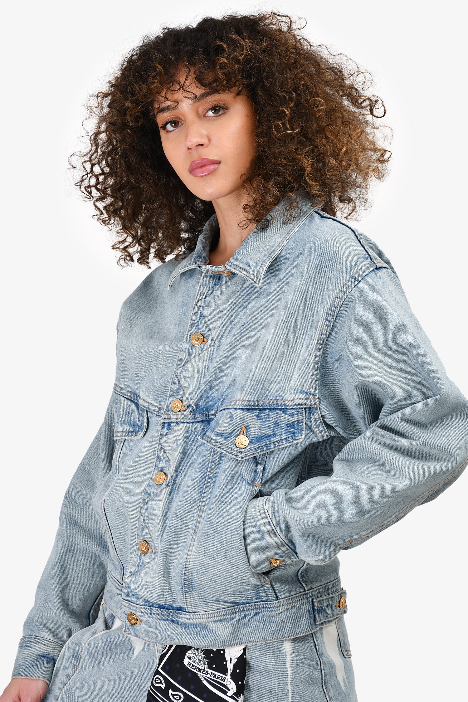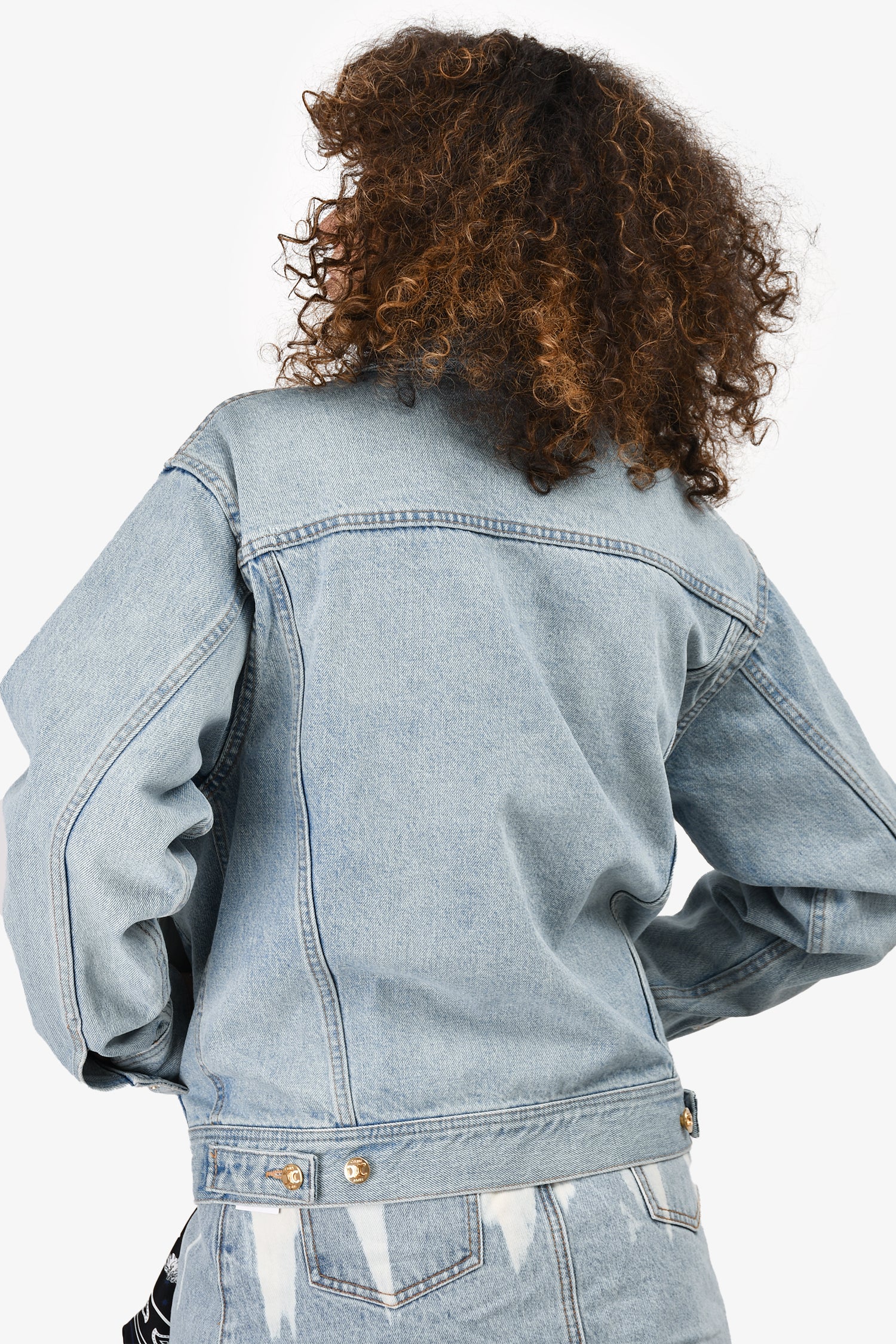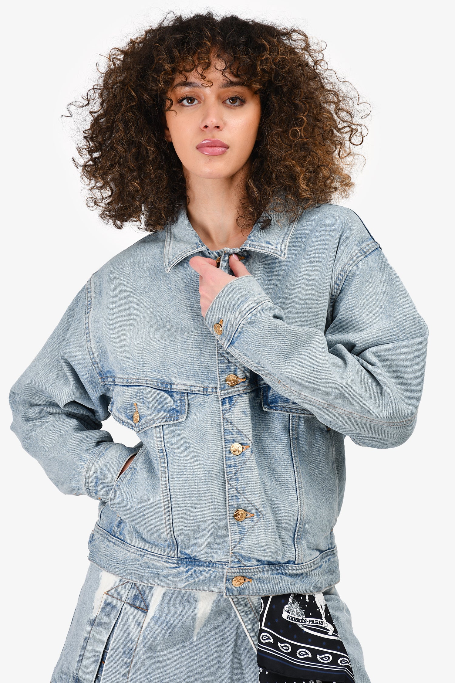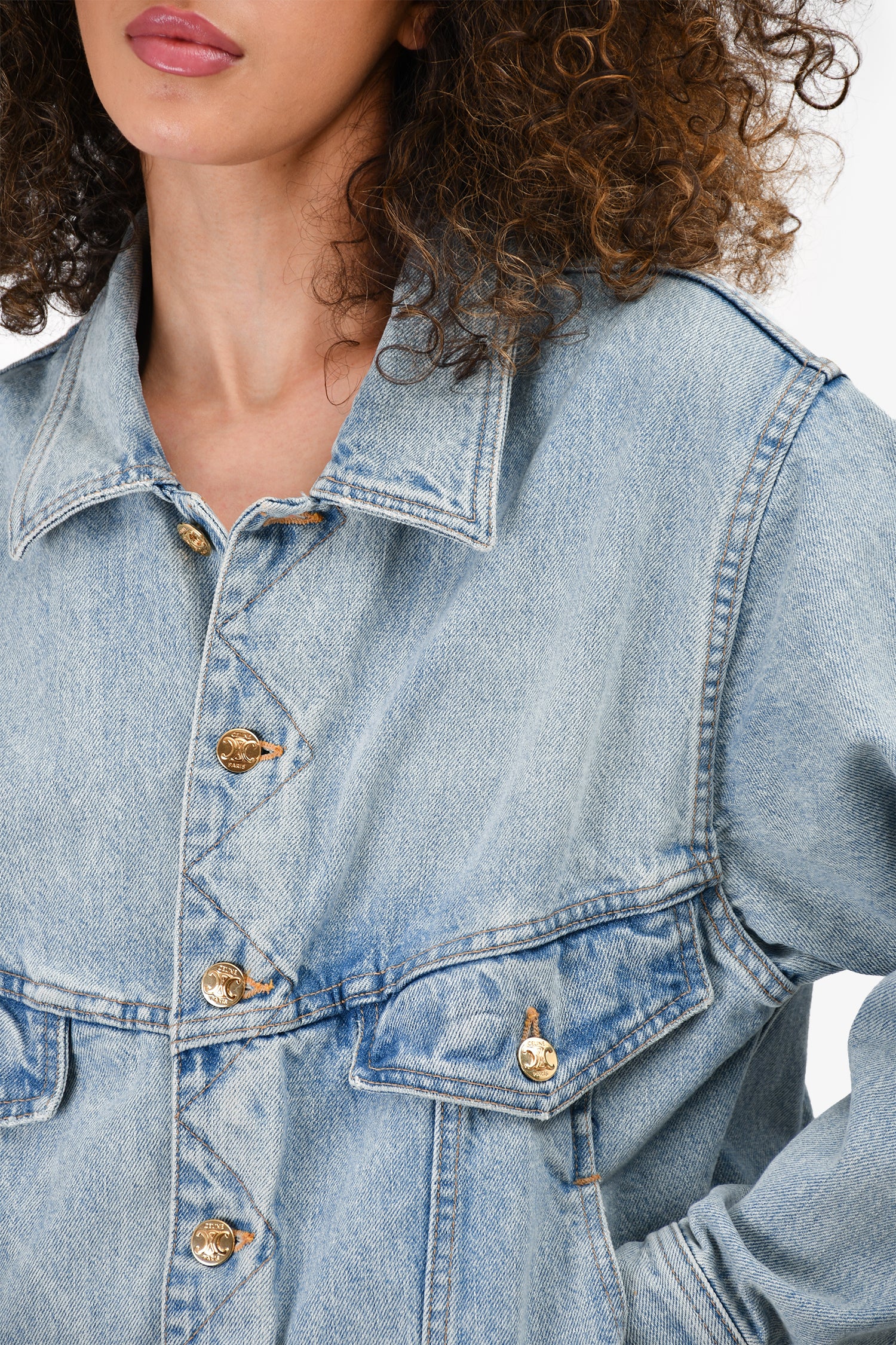 Refresh availabilityCeline Light Wash Triomphe Button Denim Jacket. Front button-up closure. Front pockets. Gold-tone hardware. Contrast stitching.