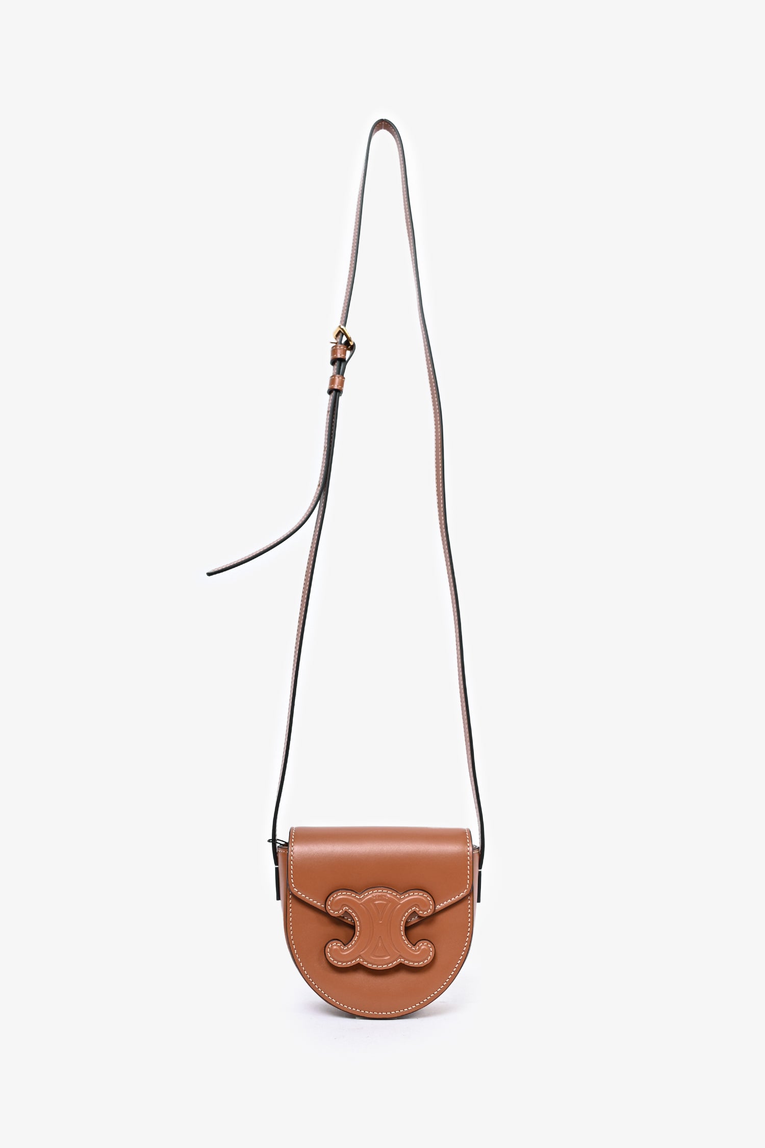 Refresh availabilityCeline Mini Brown Leather Besace Triomphe Crossbody Bag. Front fold-over flap with push button closure. Open interior. Adjustable strap. Gold-tone hardware.