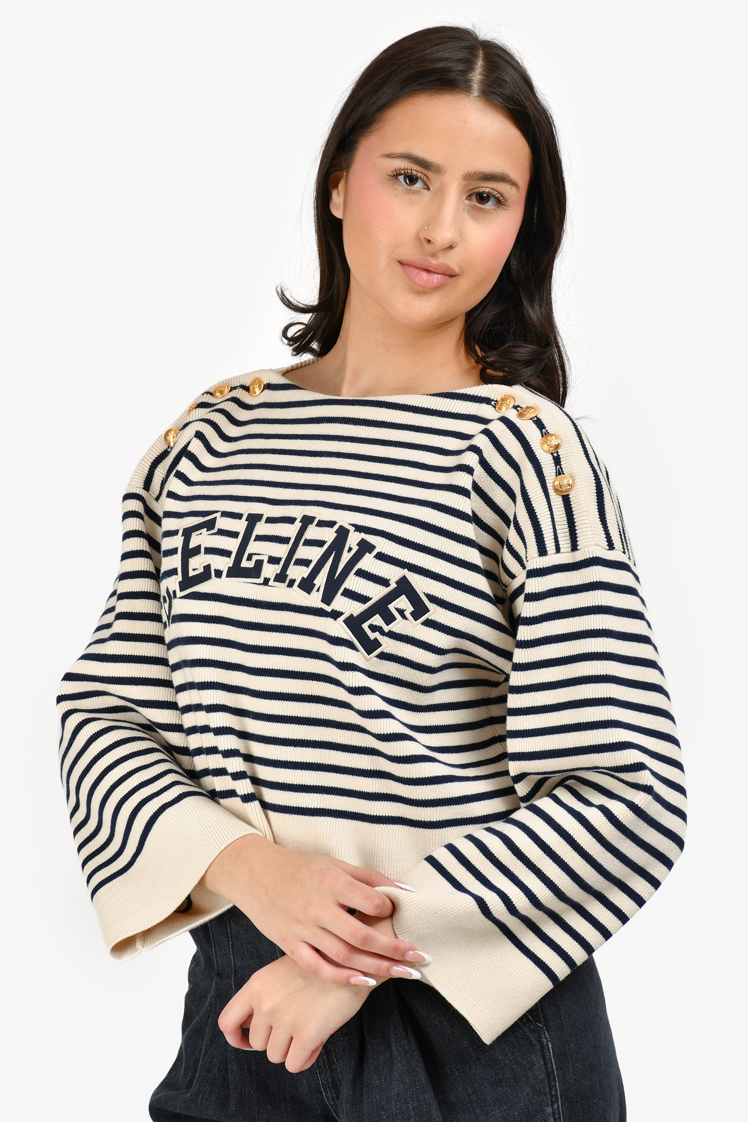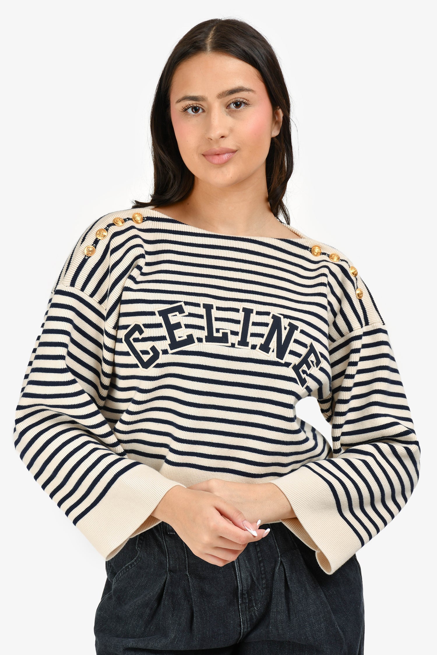 Refresh availabilityCeline Navy/Cream Striped Logo Boatneck Sweater. Gold-tone button detail on the neckline. Embroidered logo on the front. Unlined. Tonal stitching.