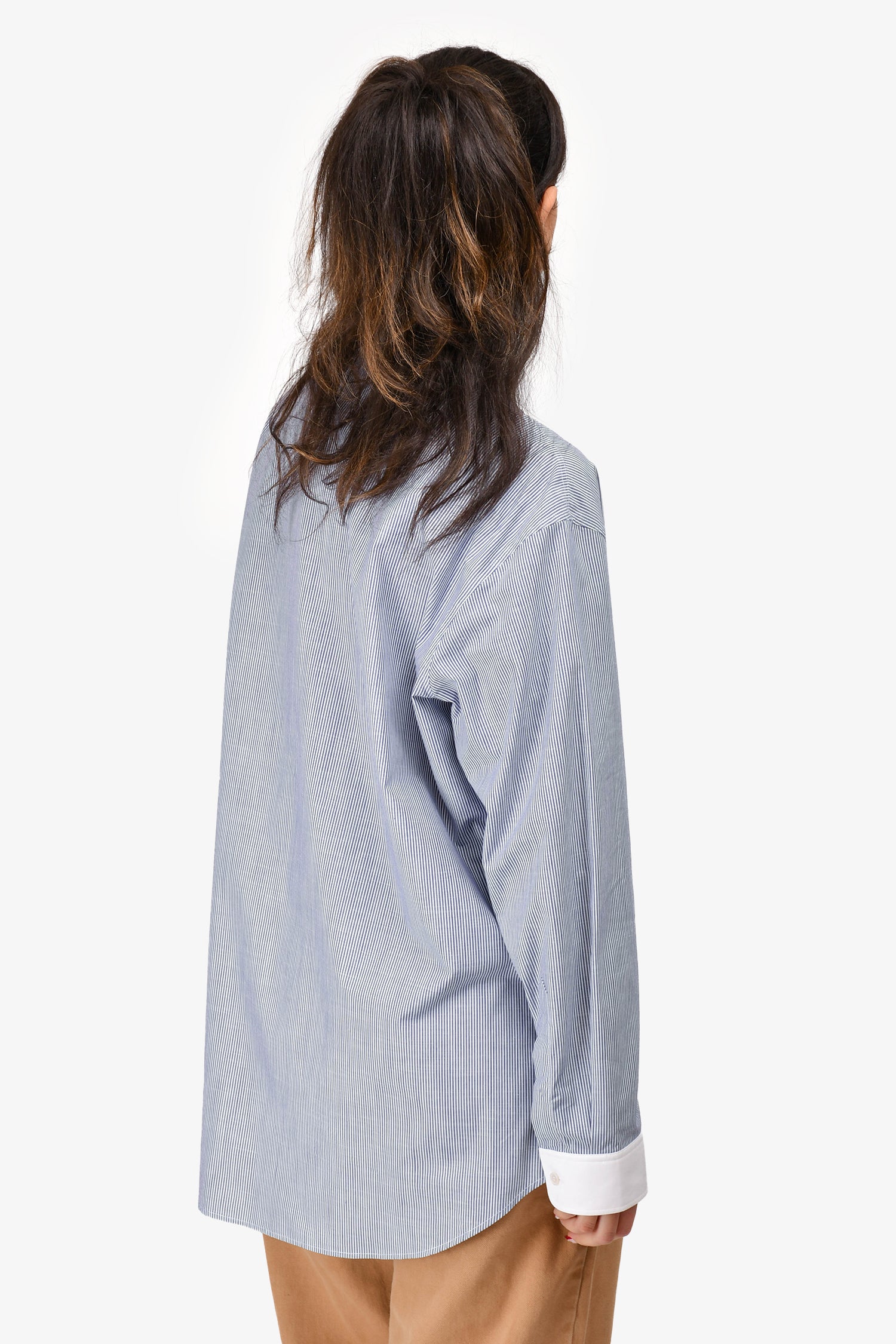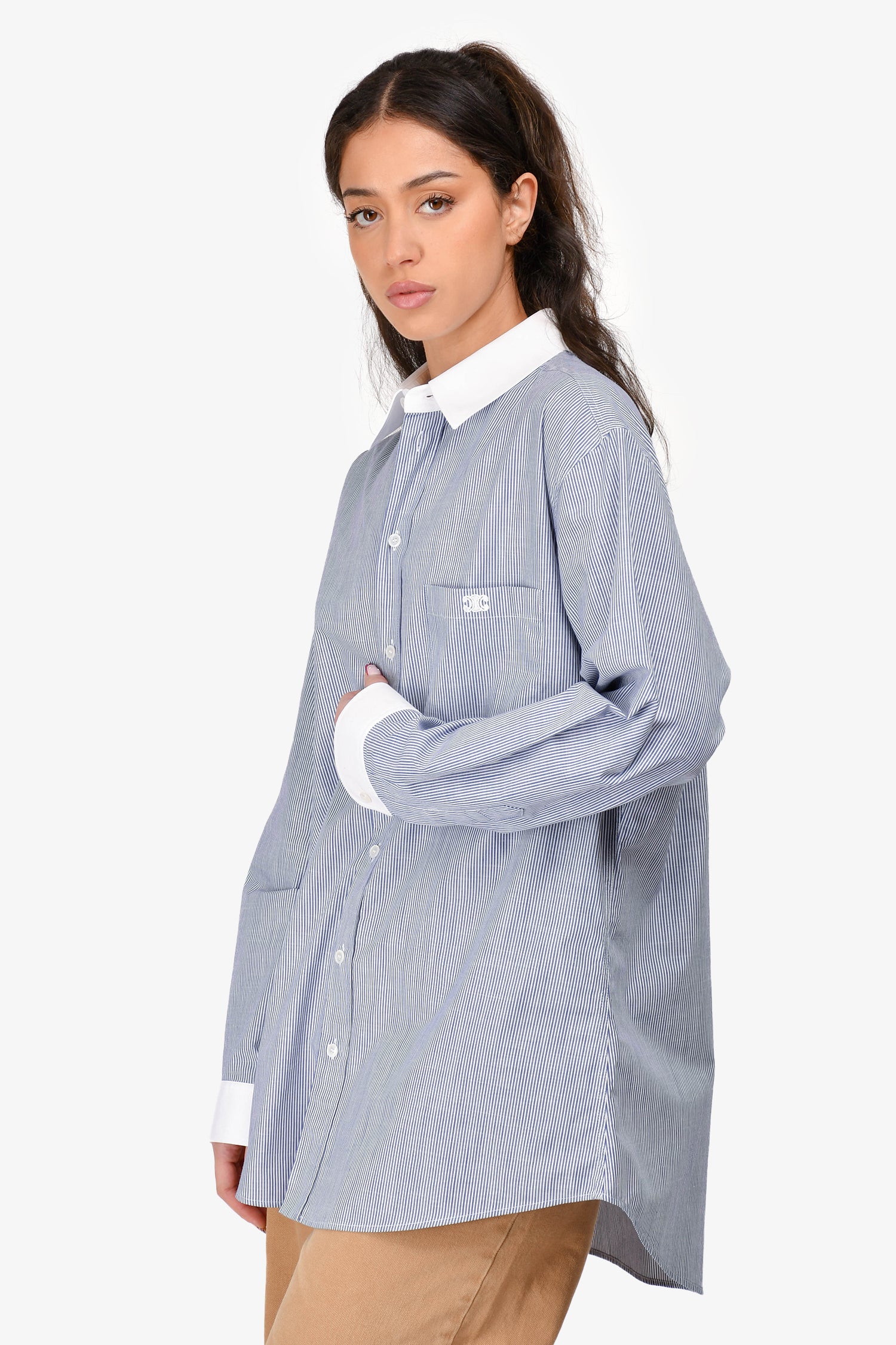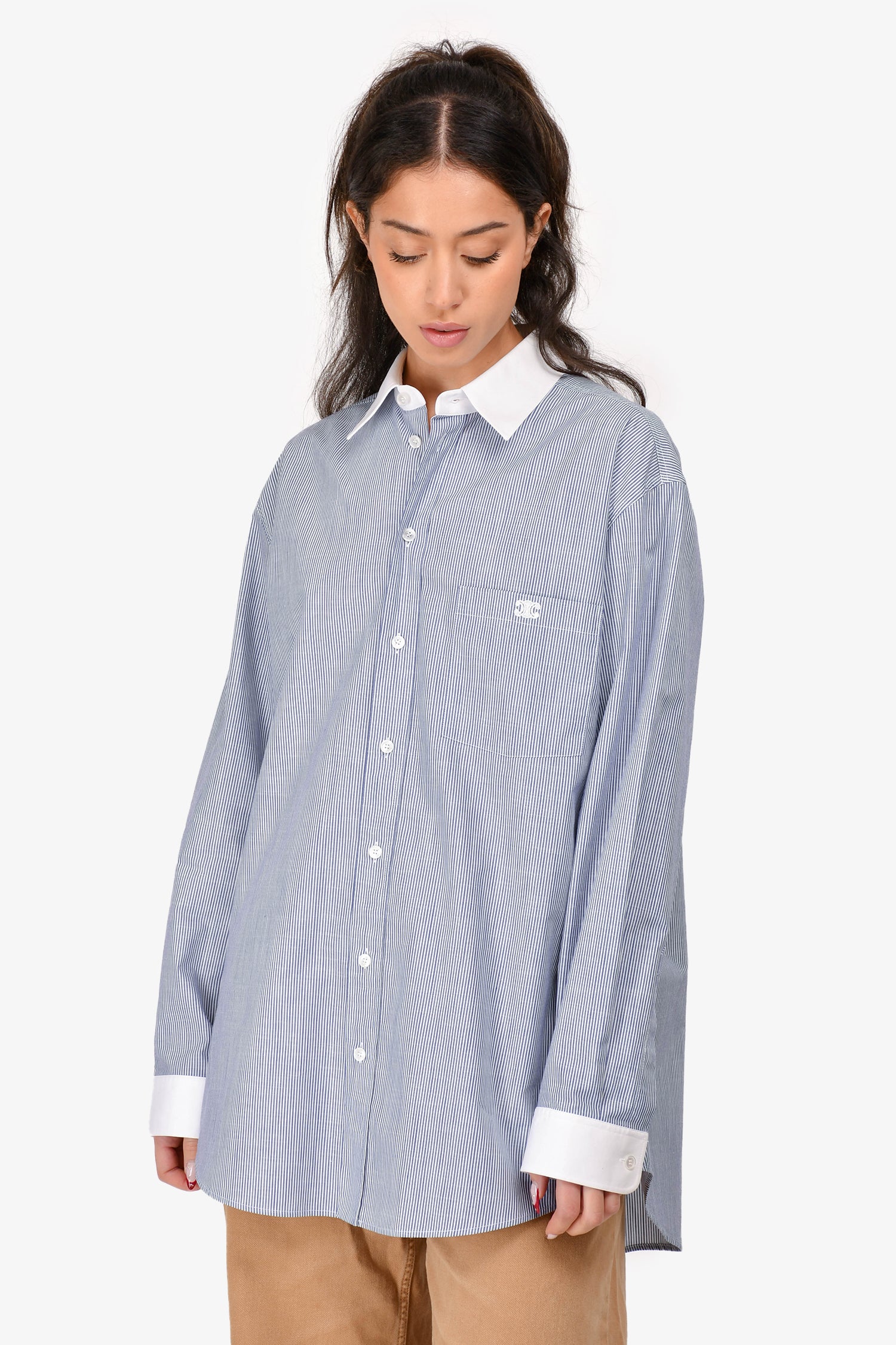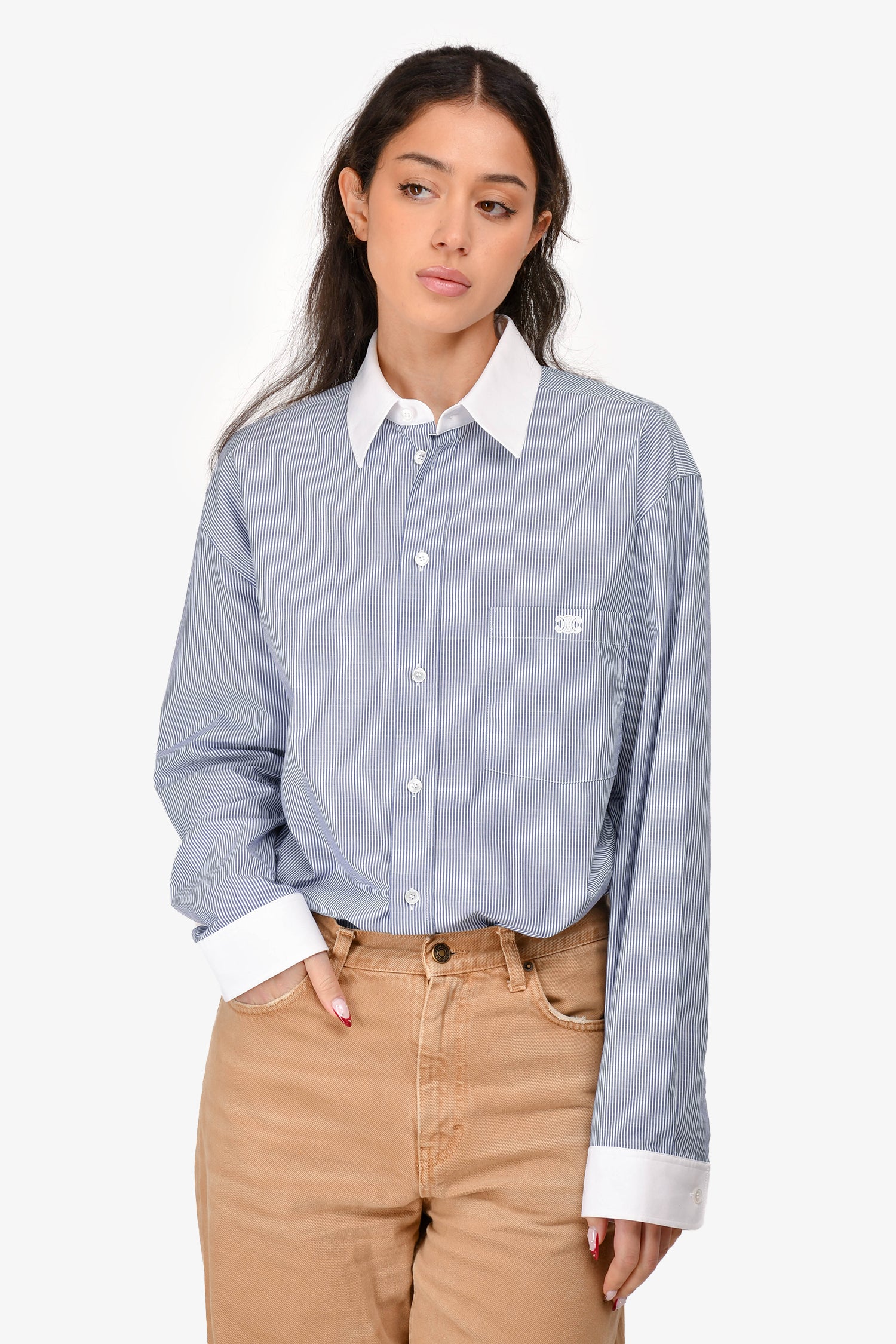 Refresh availabilityCeline Navy/White Striped Logo Embroidered Button-Up Shirt. Single breast pocket with embroidered Triomphe logo. Two-tone design with contrast collar and cuffs. Buttoned cuffs. Tonal stitching.