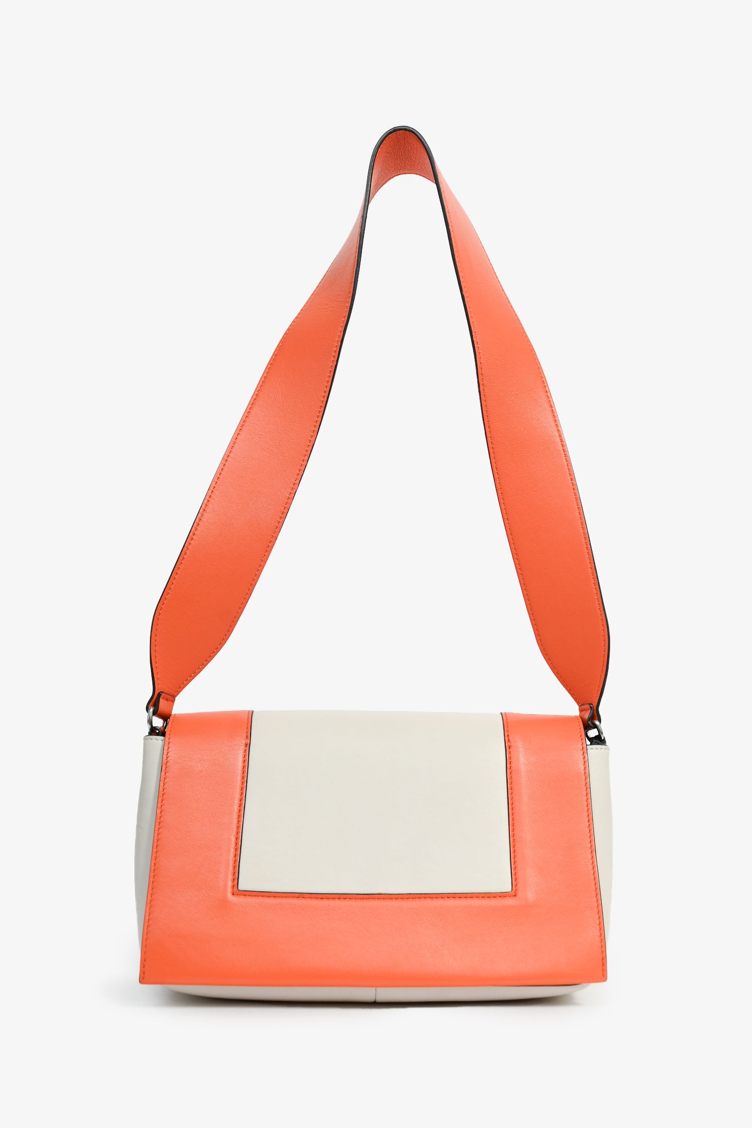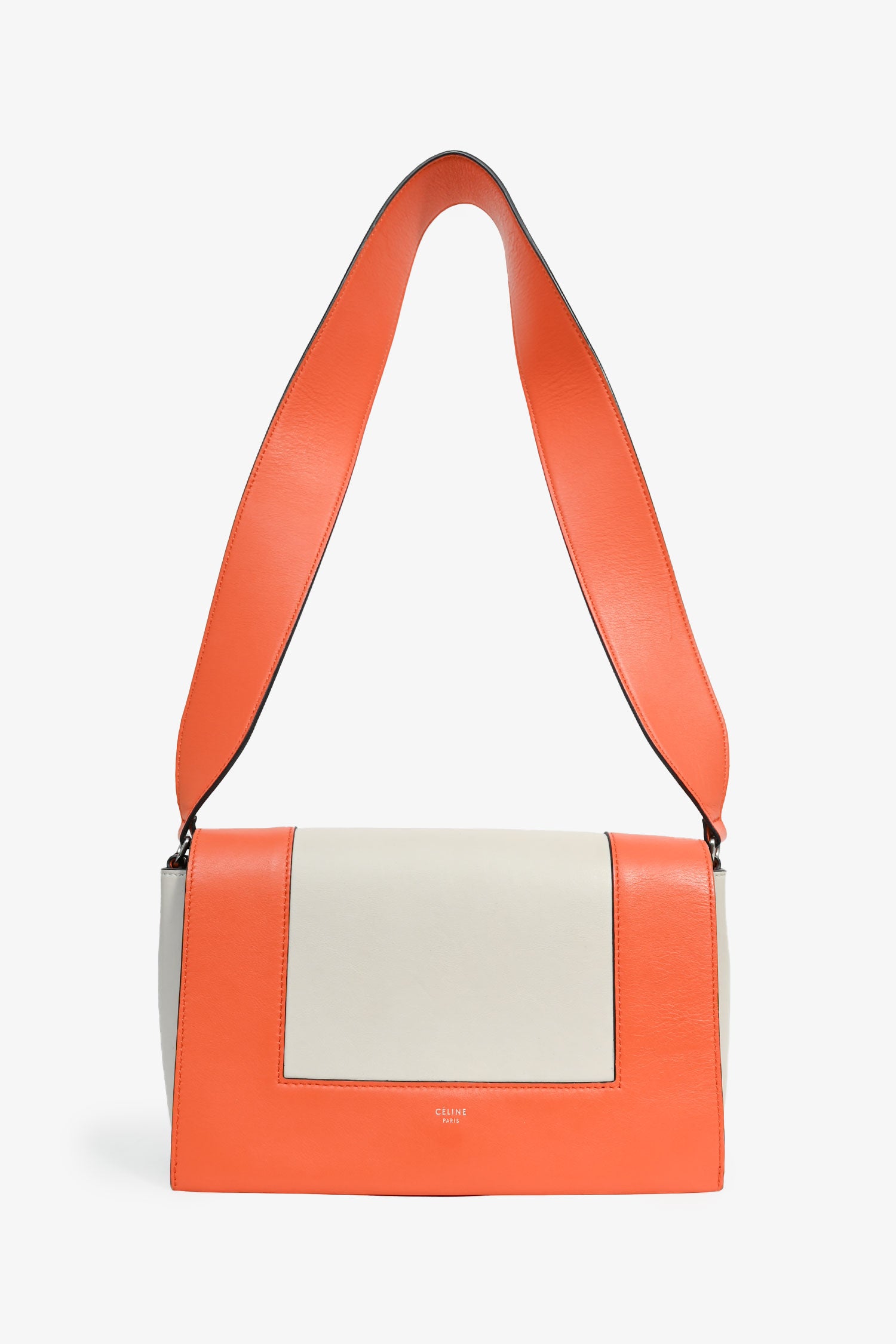 Refresh availabilityCeline Orange/Grey Leather Leather 'Frame' Shoulder Bag. Front fold-over flap with magnetic slide-in closure. Two compartments and a middle zip pocket compartment. Silver-tone hardware. Tonal stitching.