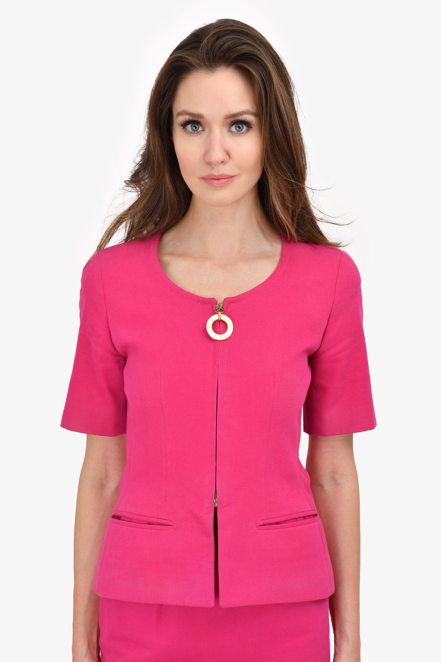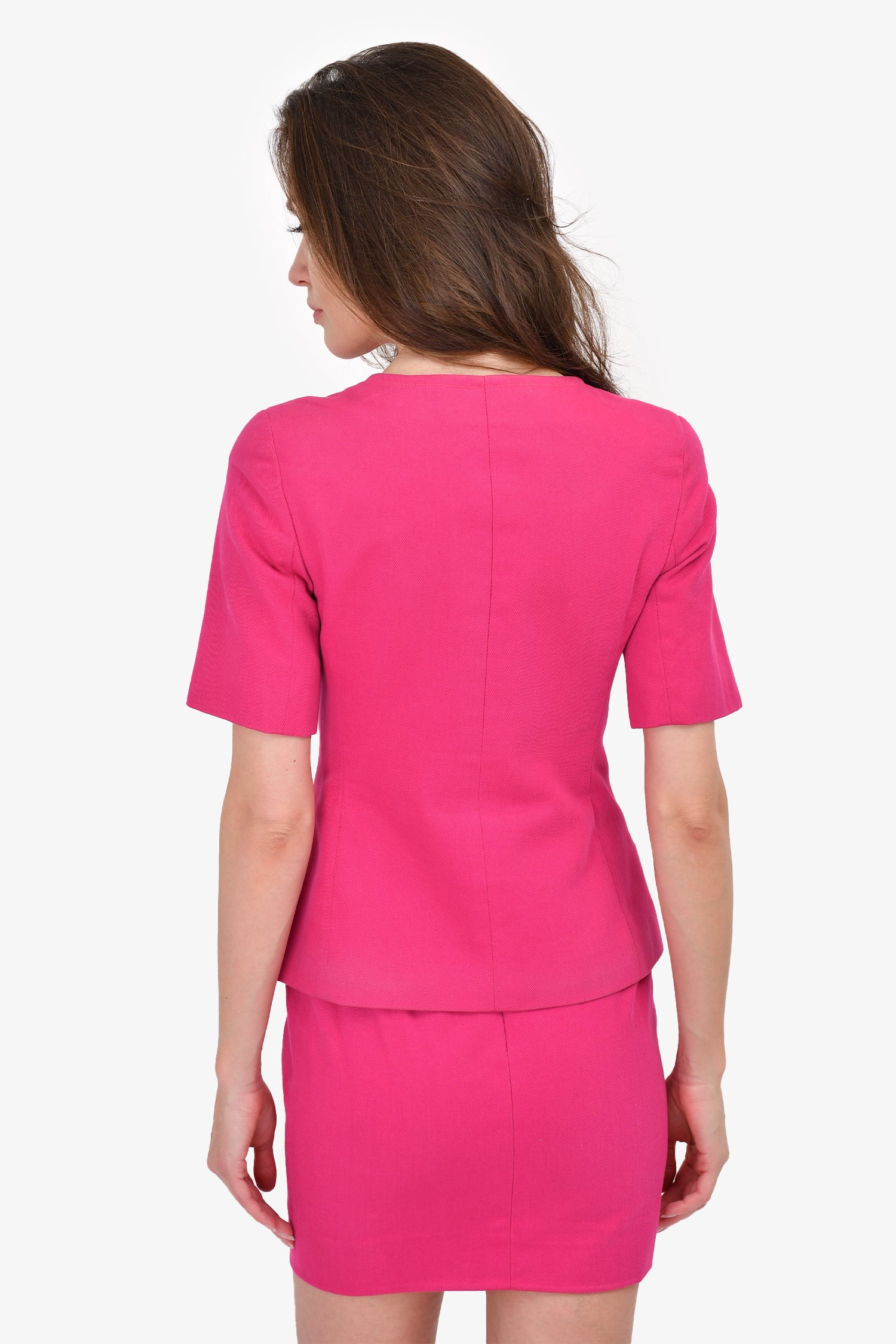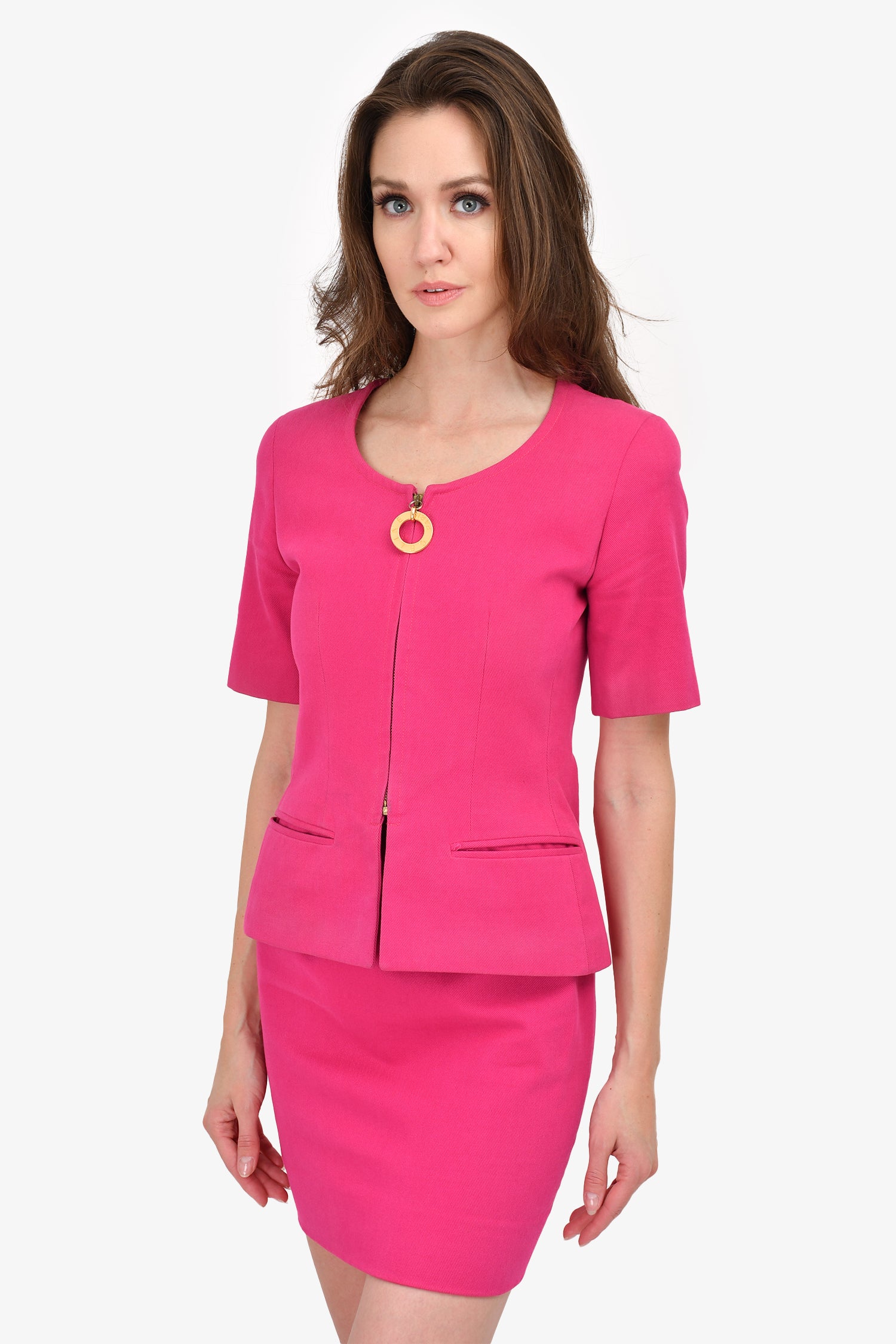 Refresh availabilityCeline Pink Denim Zip-Up Jacket + Mini Skirt Set. Front zip closure. Front pockets. Padded shoulders. Lined. Skirt: Rear zip closure. Unlined.