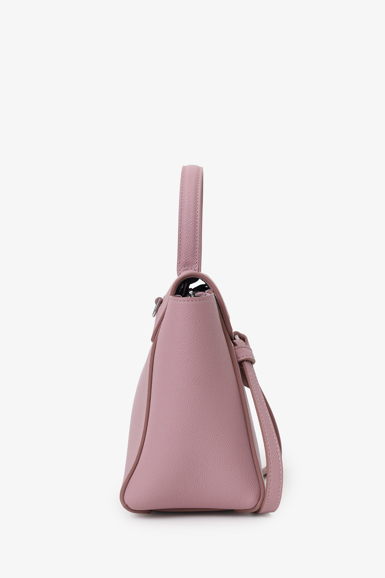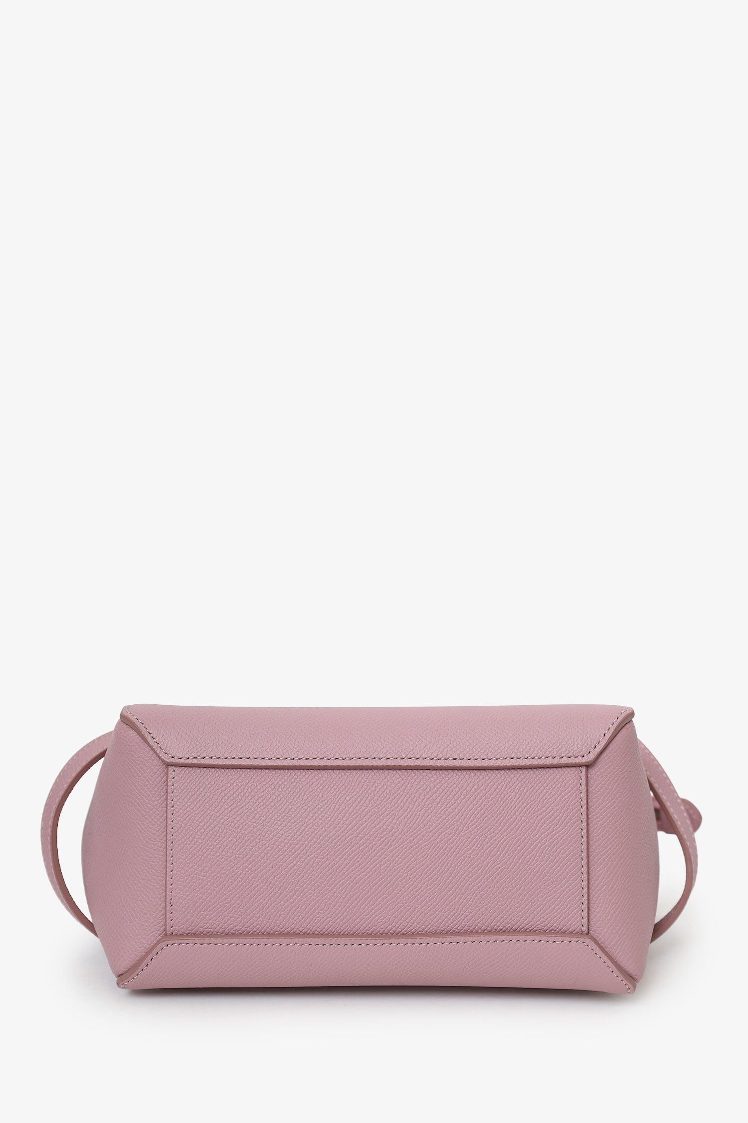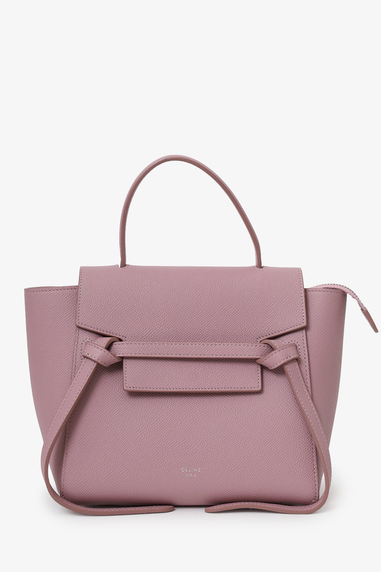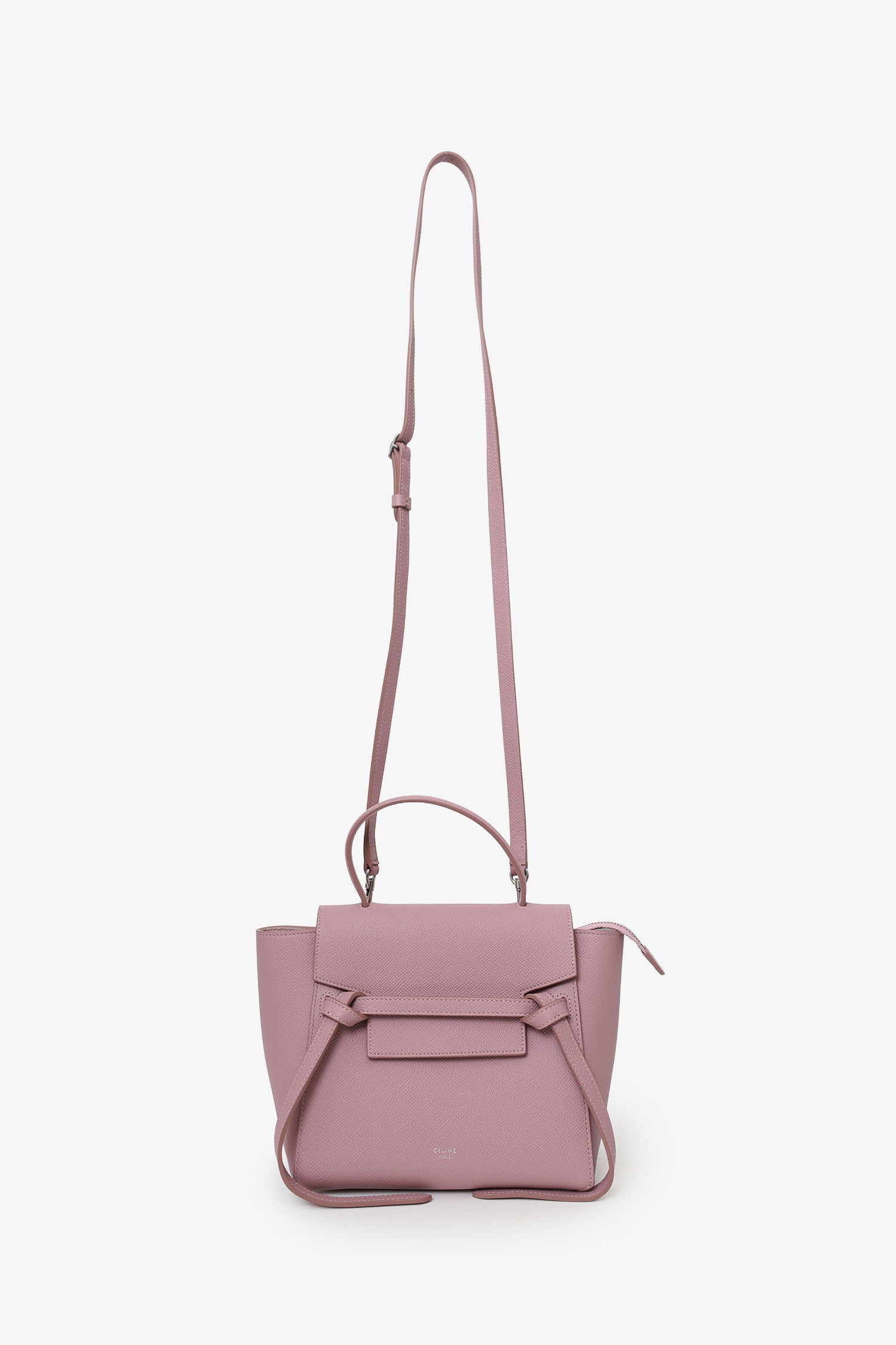 Refresh availabilityCeline Pink Grained Leather Nano Belt Bag With Strap. Front fold-over flap with snap-button closure. Top handle. Removable strap with adjustable buckle closure. Additional top zip closure under flap. Open suede-lined interior. Silver-tone hardware. Tonal stitching.