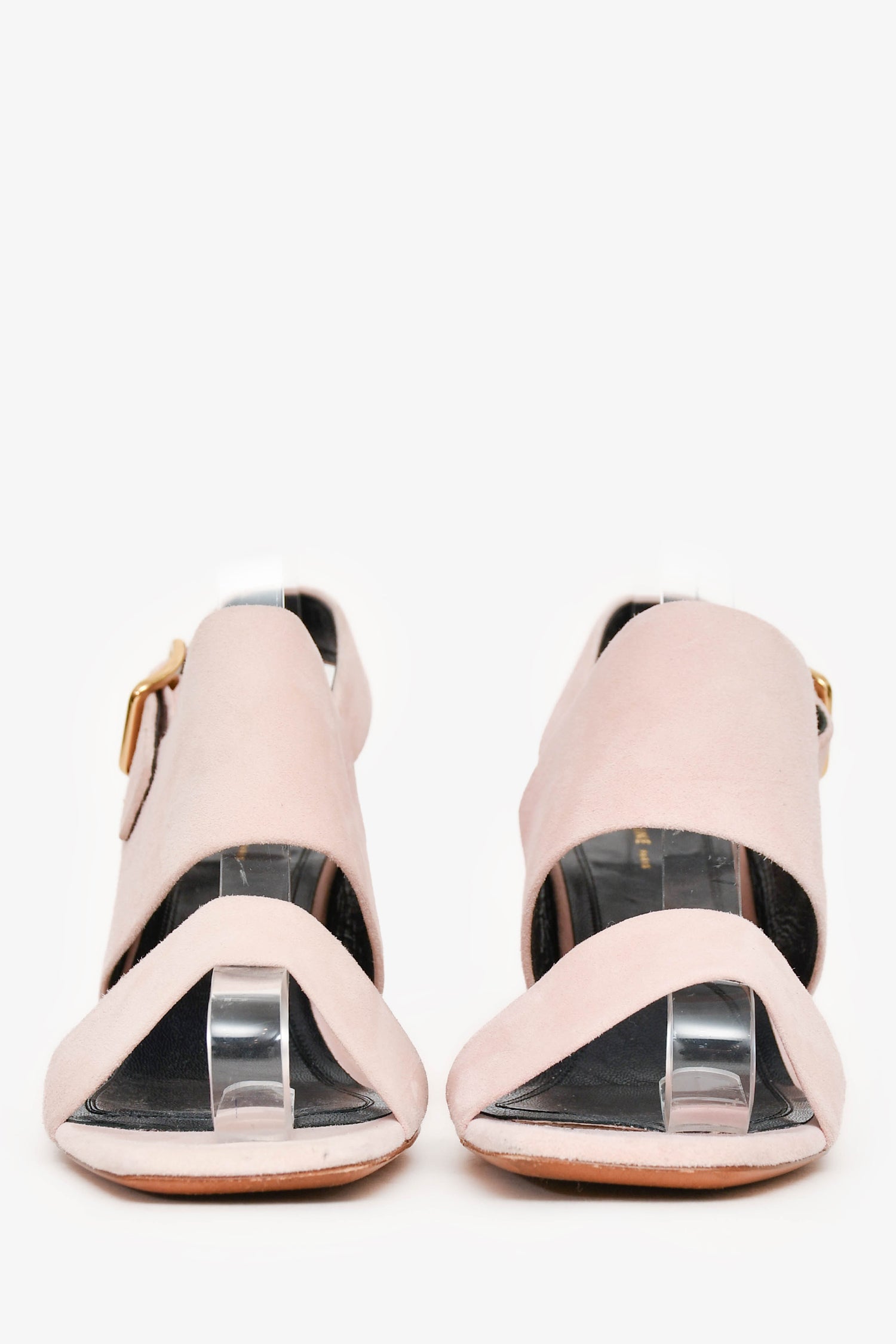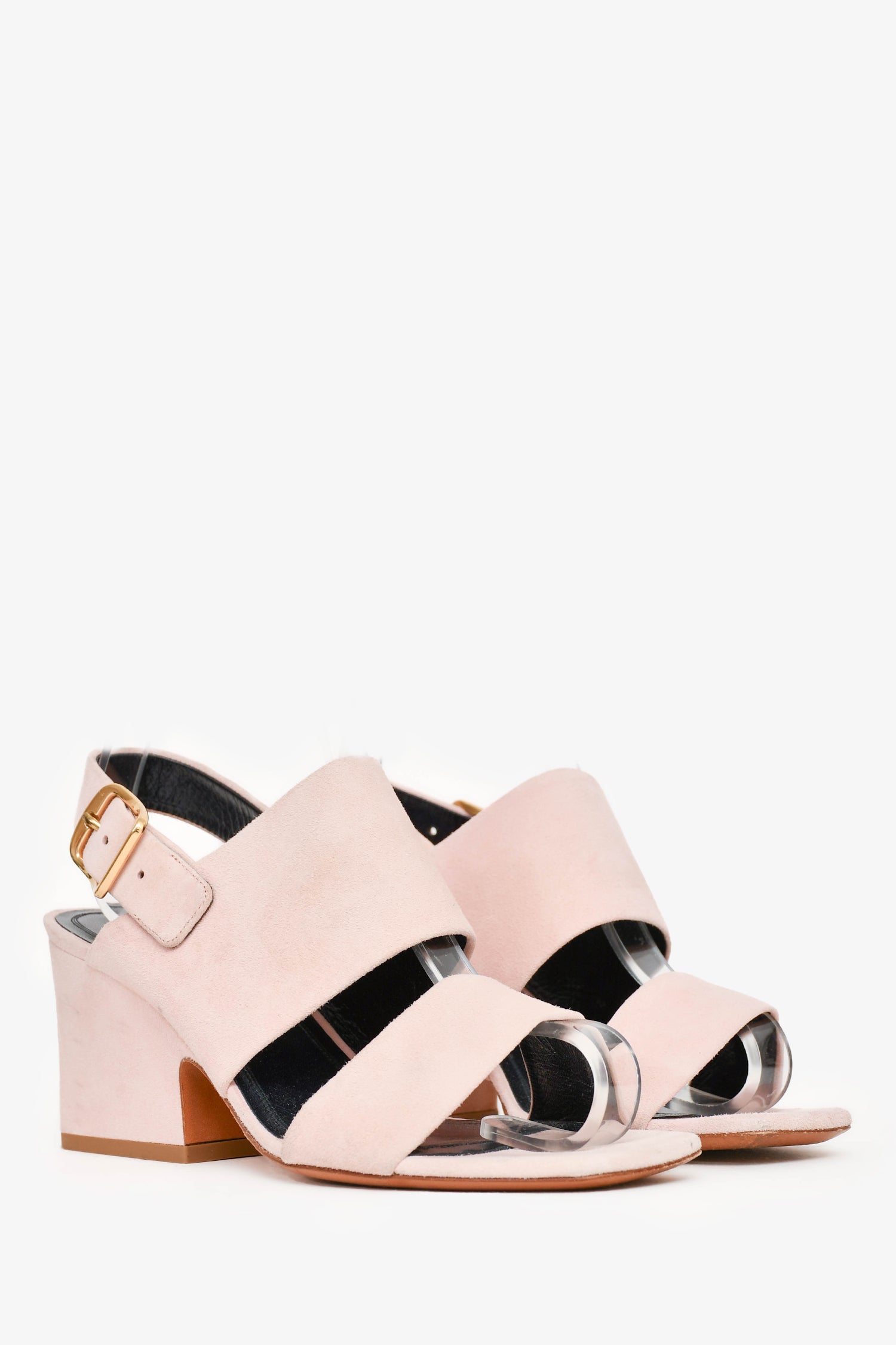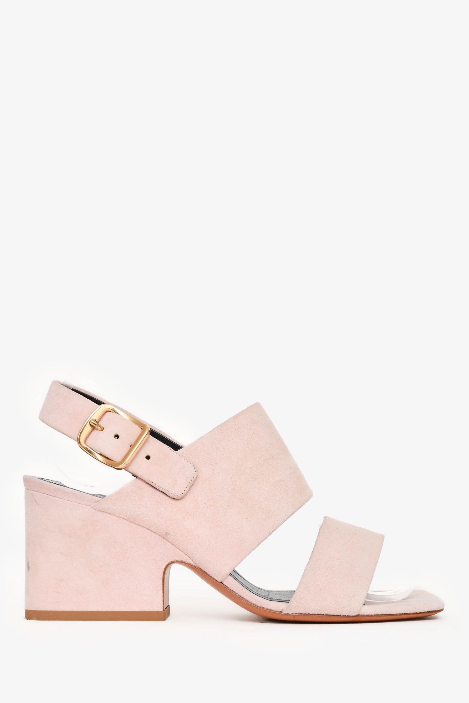 Refresh availabilityCeline Pink Suede Heeled Sandals. Slip-on. Square toe. Open toe. Ankle strap with buckle closure. Chunky heel.