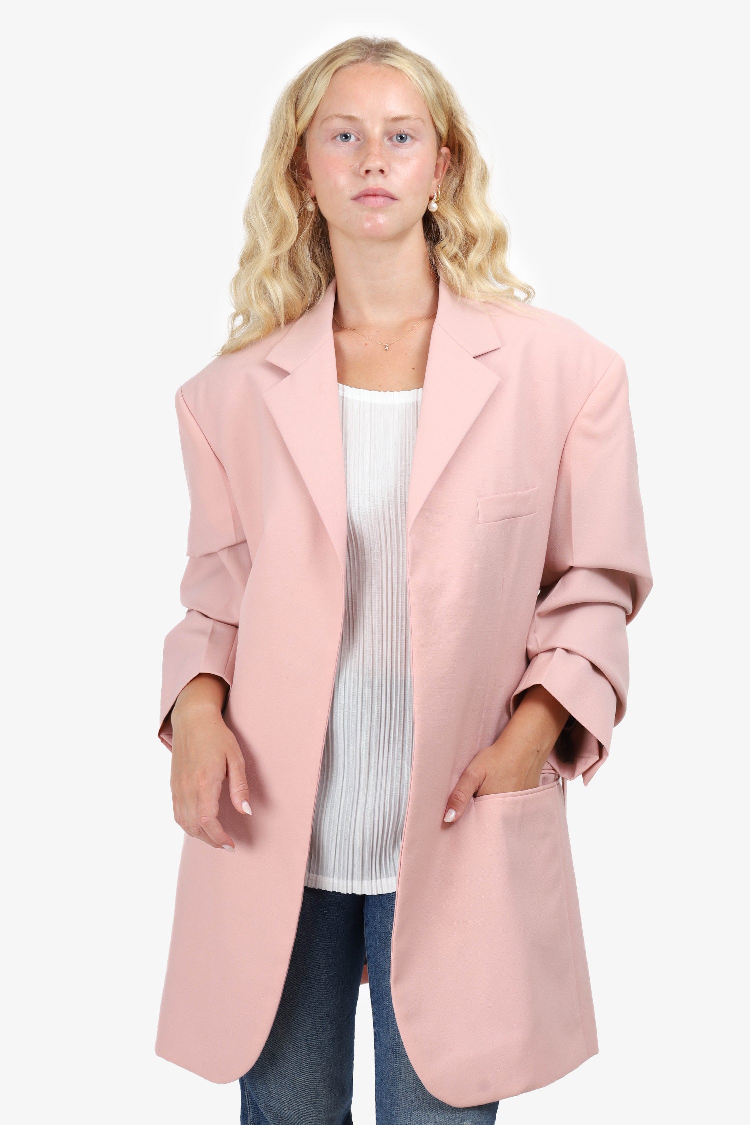 Refresh availabilityCeline Pink Wool Blazer. Collared V-neckline. 3 front slip pockets; 2 with fold-over flap. Single interior slip pocket with button-up closure. Adjustable button-up strap on back. Lined. Tonal stitching. Original tags intact.
