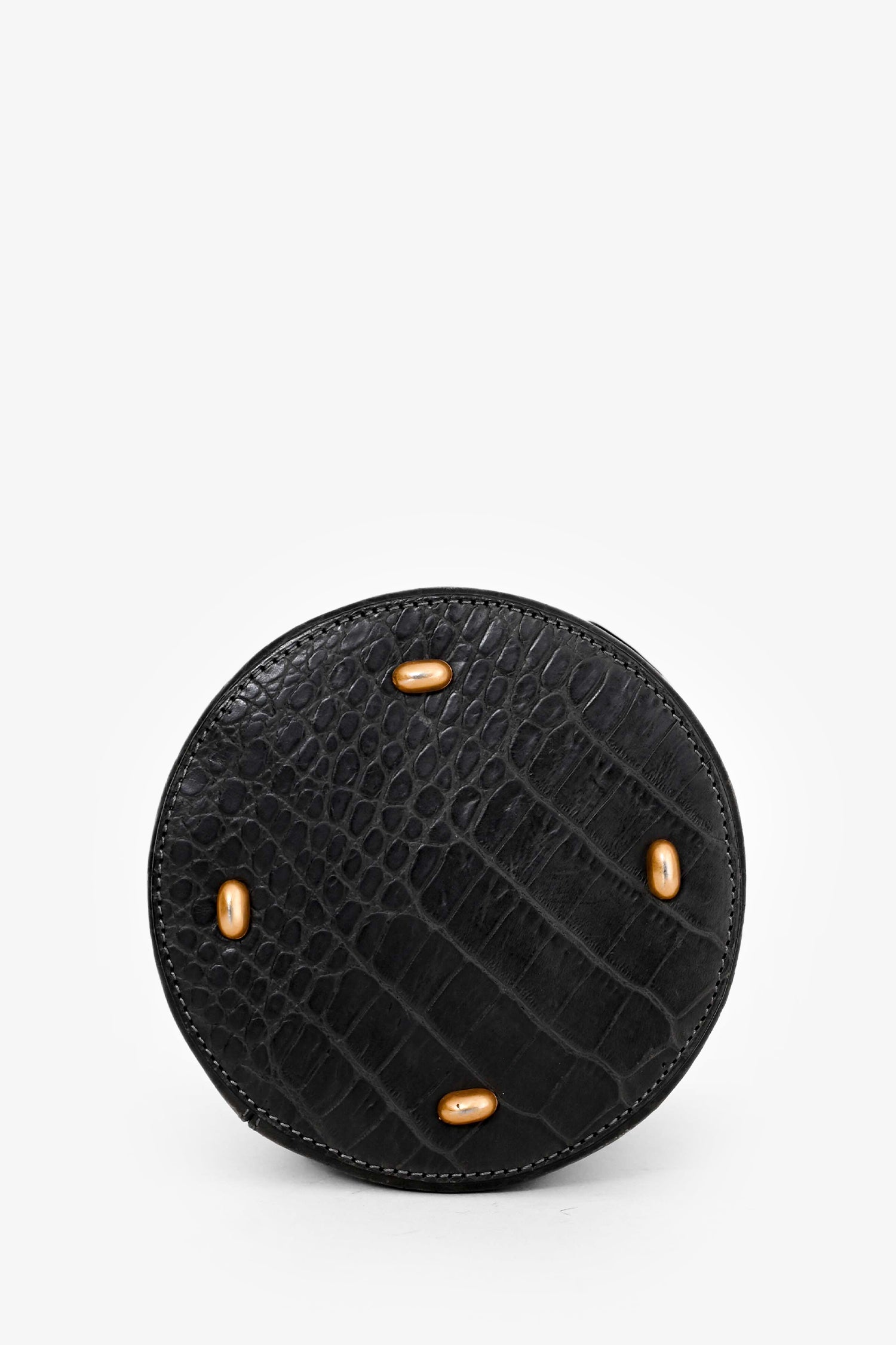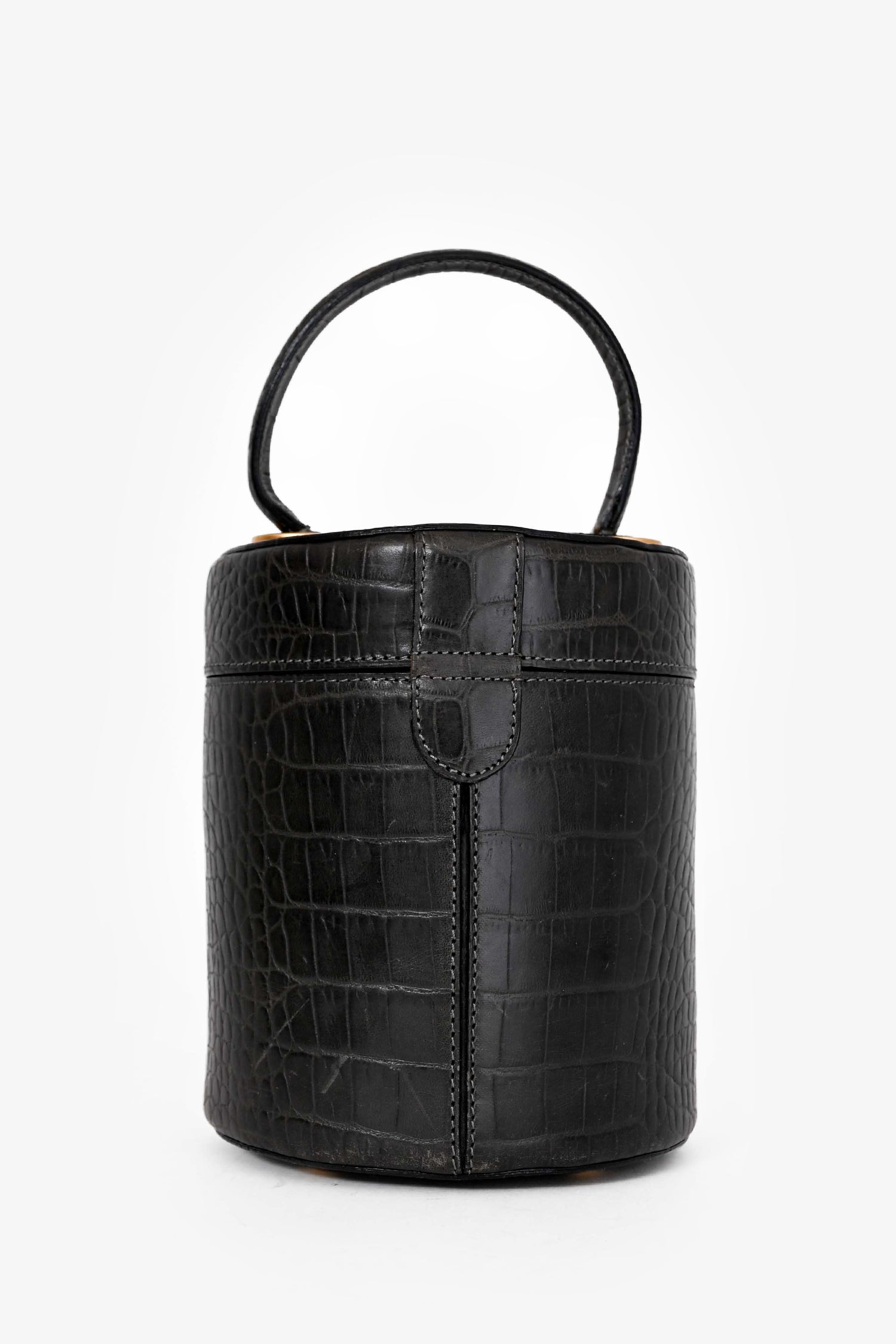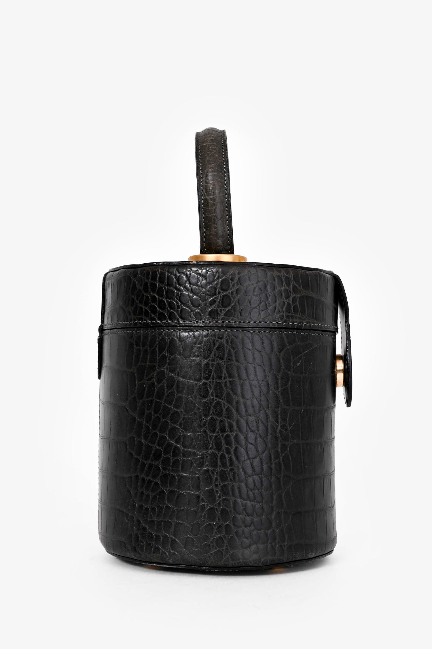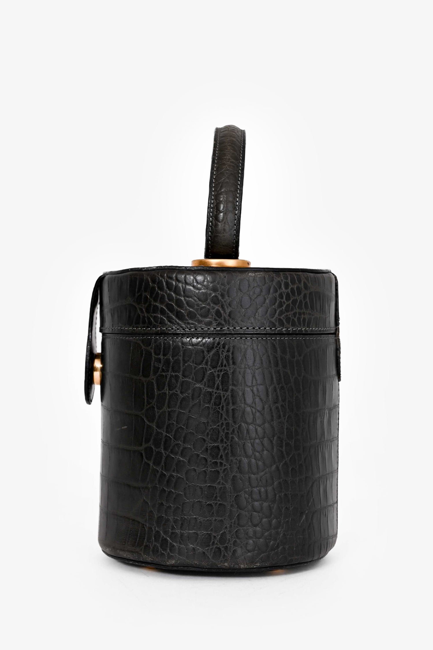 Refresh availabilityCeline Vintage Grey Croc Leather Vanity Bag. Top handle. Top fold-over strap with magnetic button closure. Red textile interior lining. Open interior. Gold-tone hardware. Protective metal bottom.