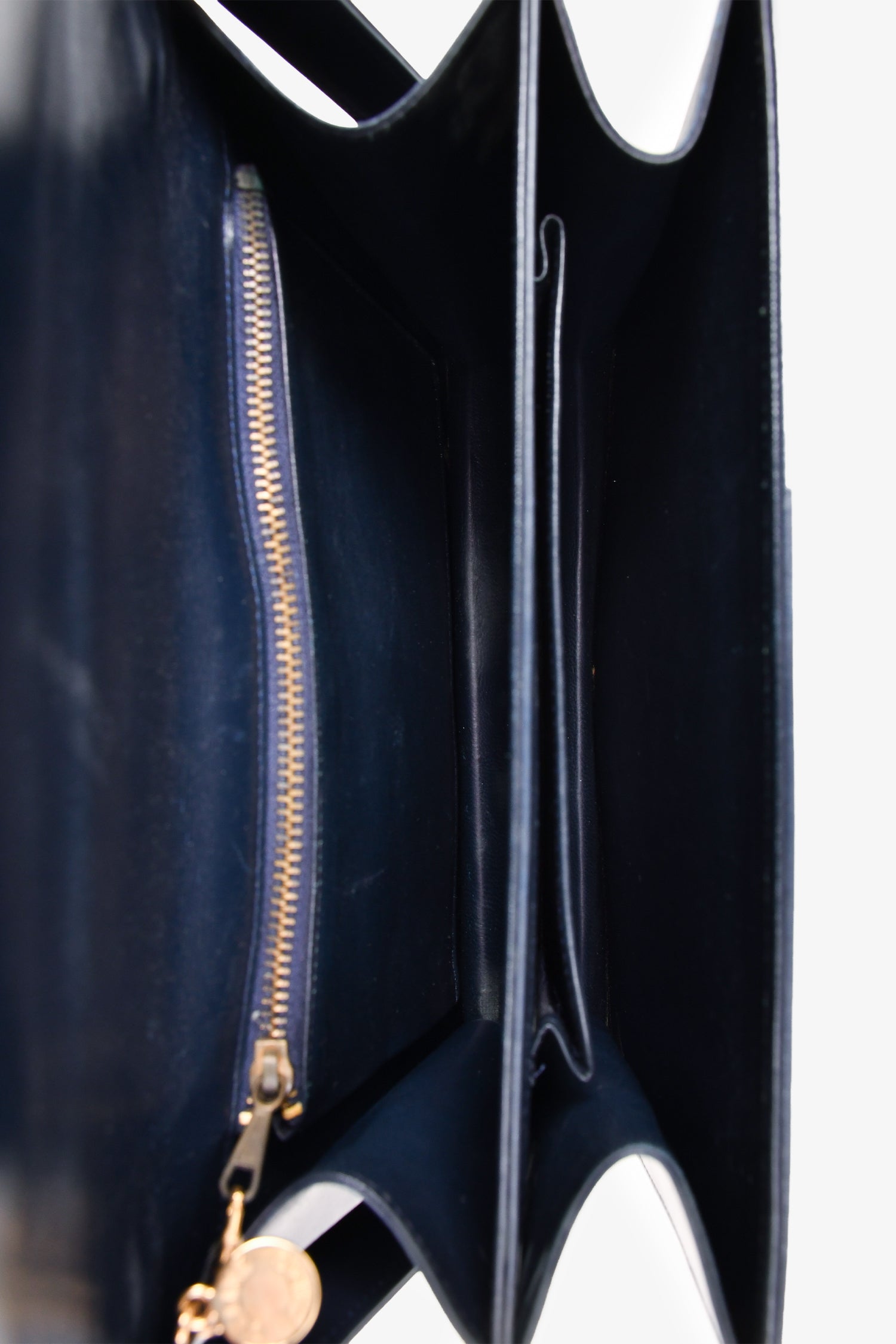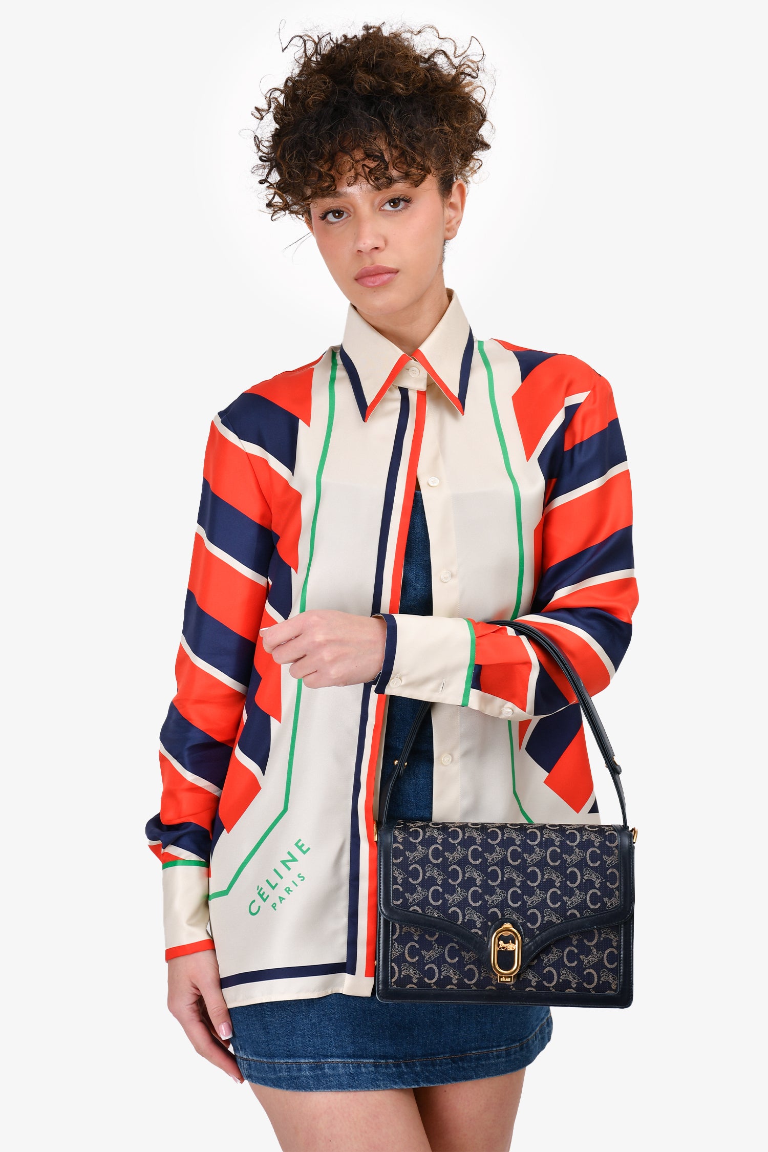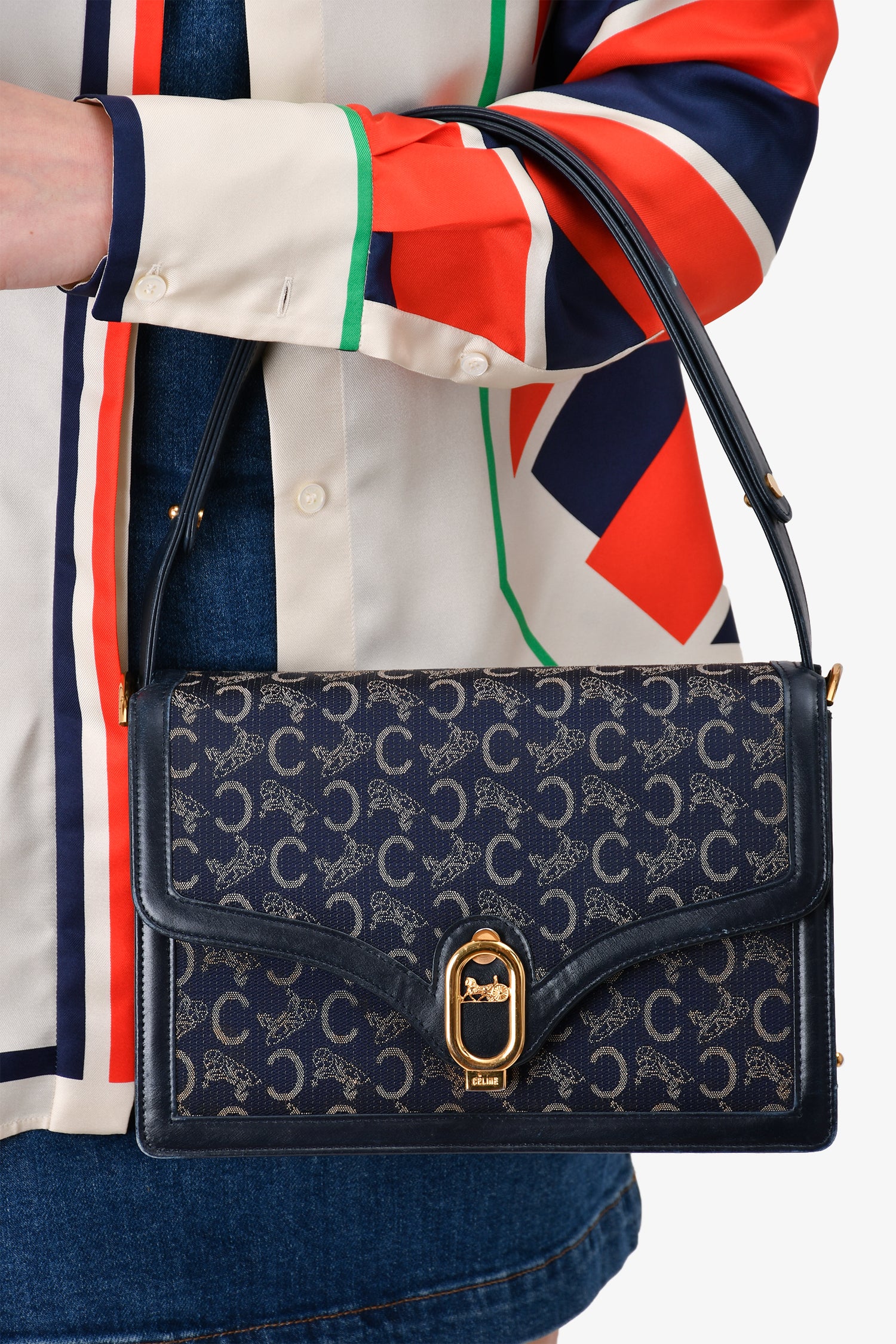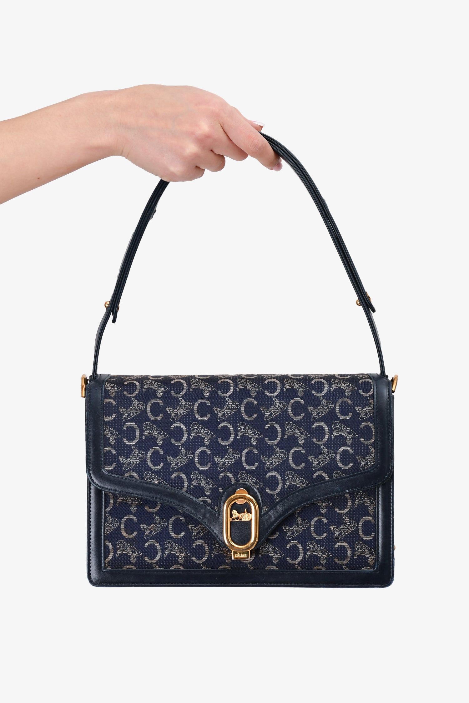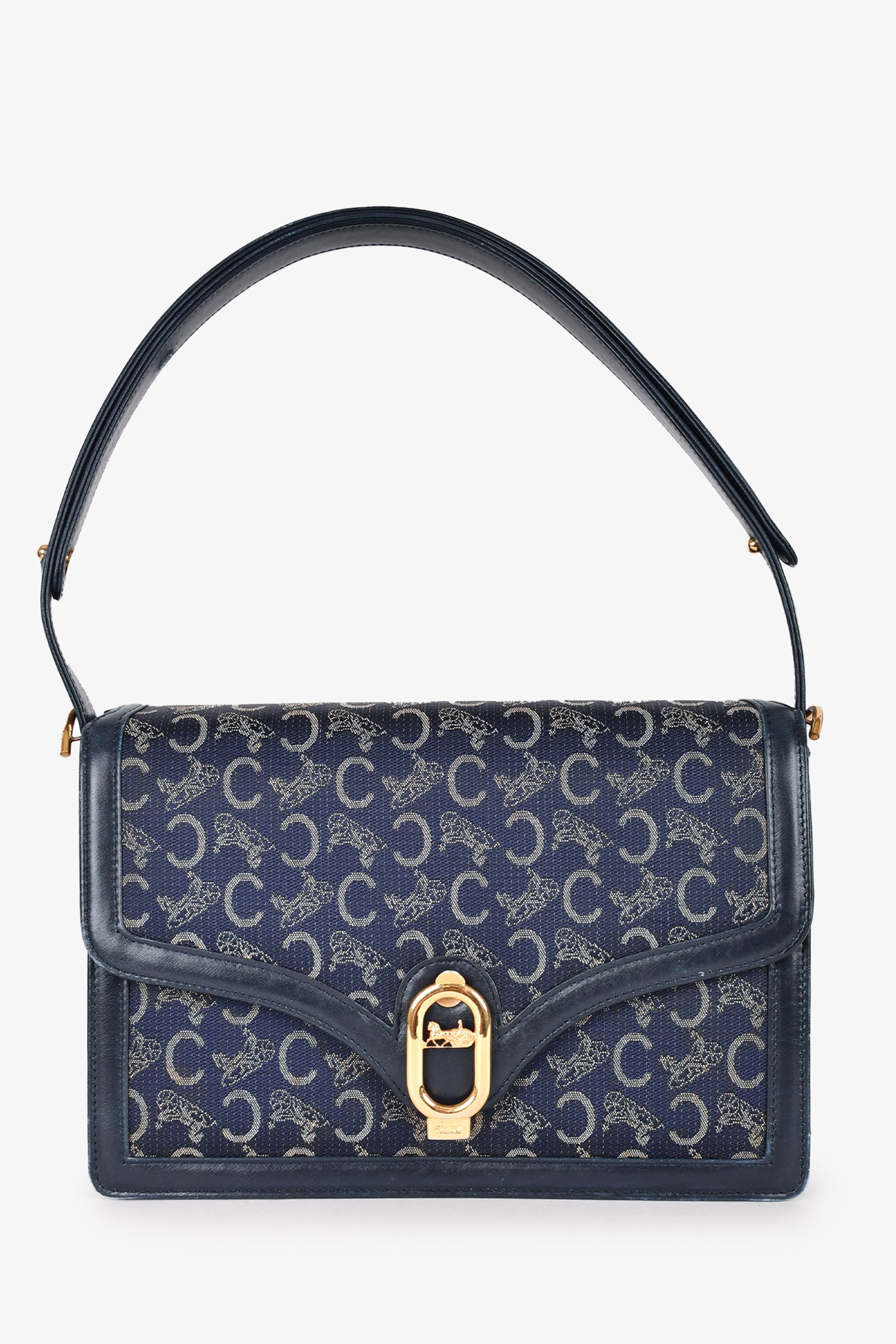 Refresh availabilityCeline Vintage Blue Monogram Denim Leather Trim 'Calèche' Shoulder Bag. Front fold-over flap with flip-lock closure. 2 interior compartments; separated by a divider. 2 interior wall pockets; 1 slip and 1 with zip closure. Gold-tone hardware.