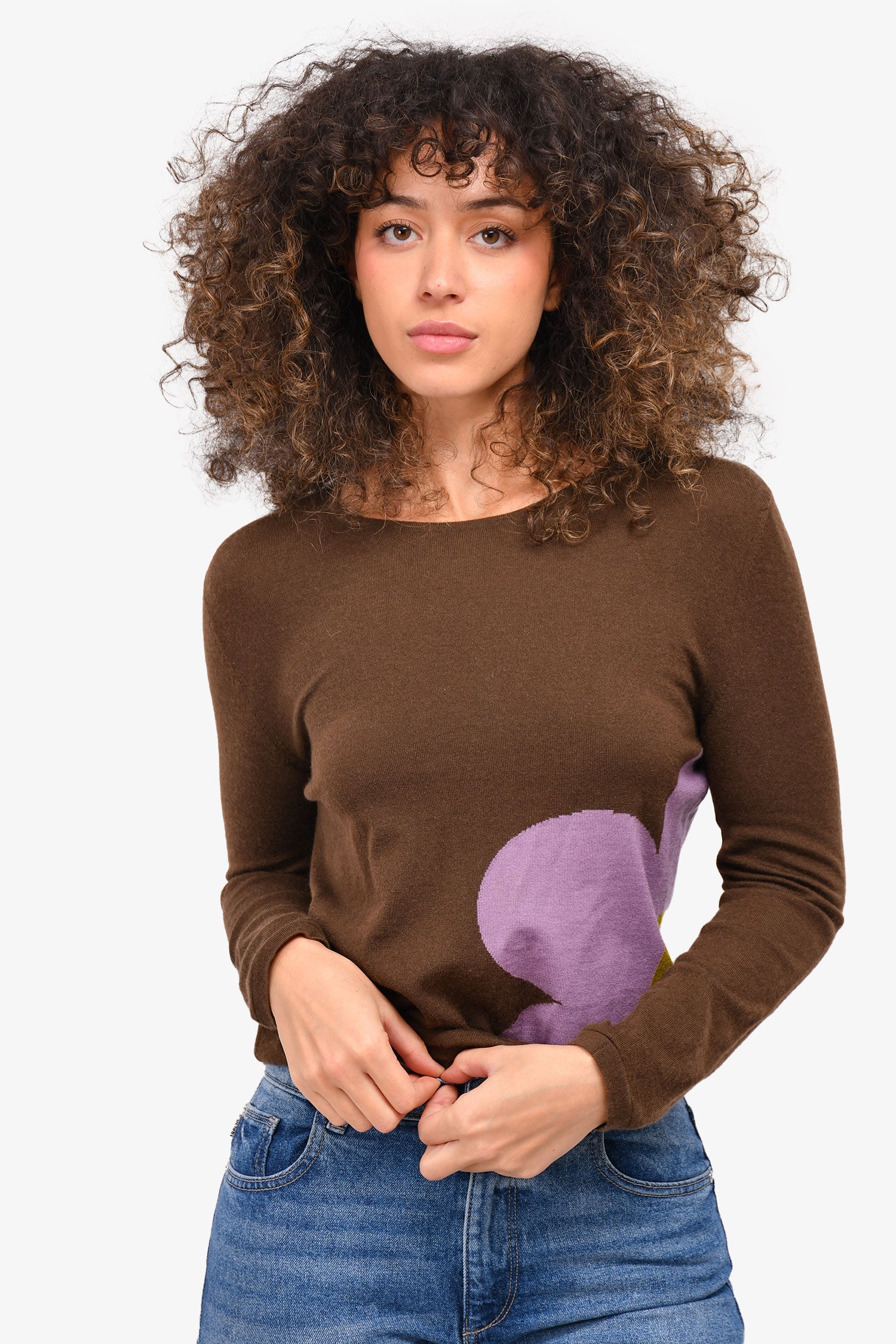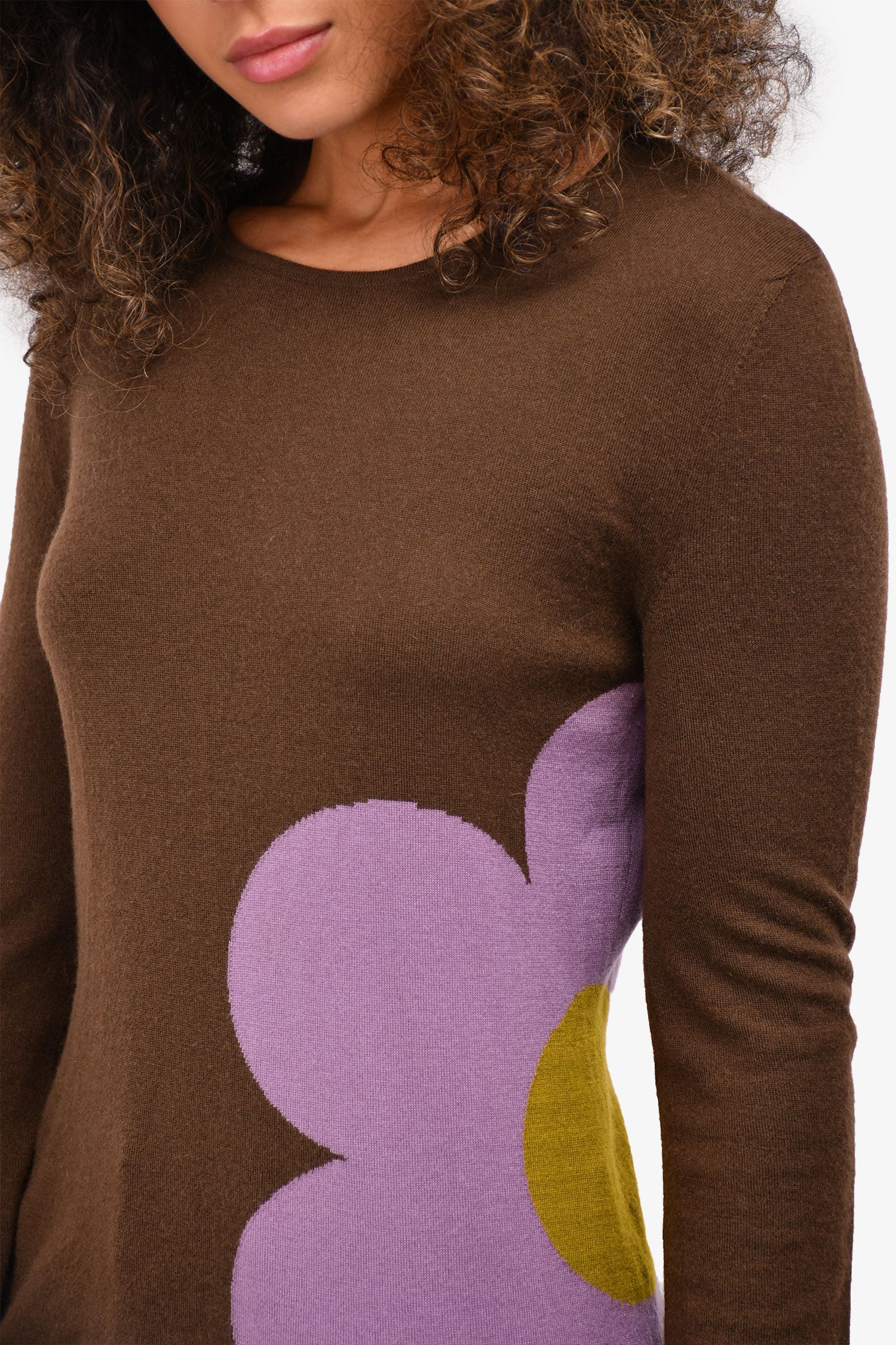 Refresh availabilityCeline Vintage Brown Cashmere Flower Sweater. Round neck. Tonal stitching. Floral motif.