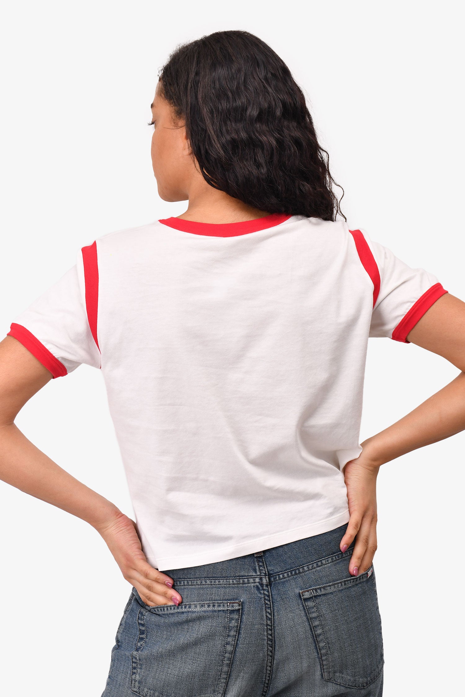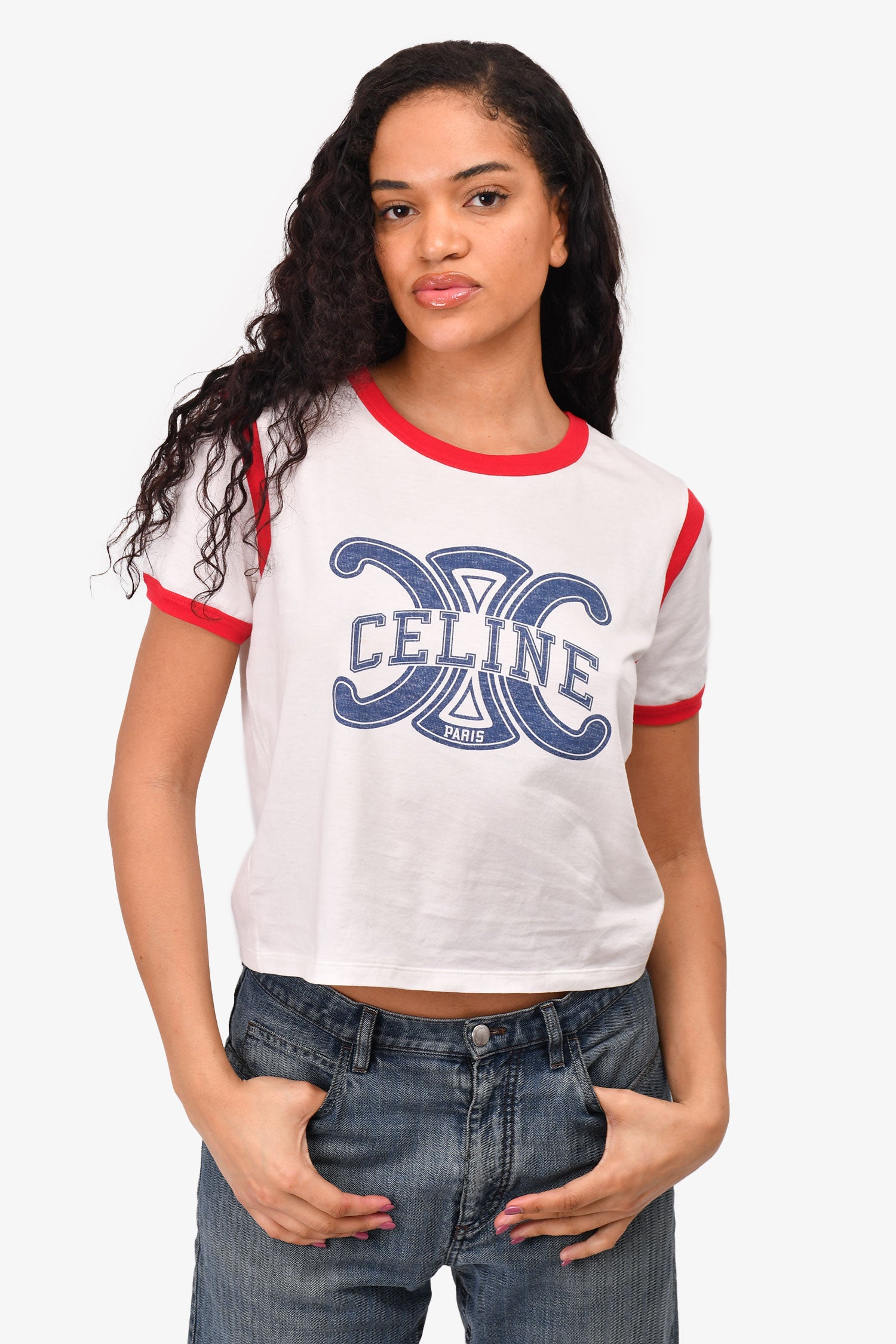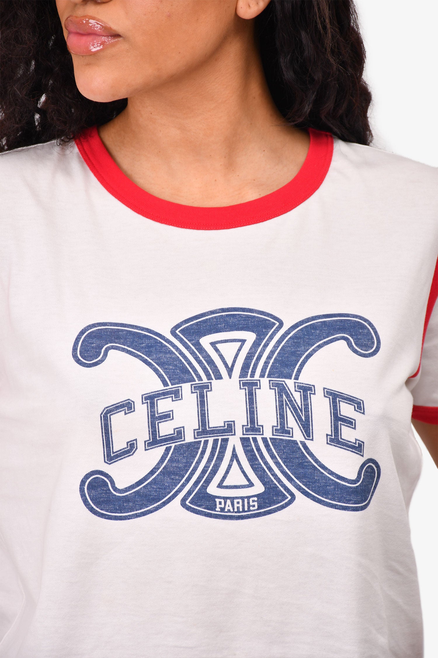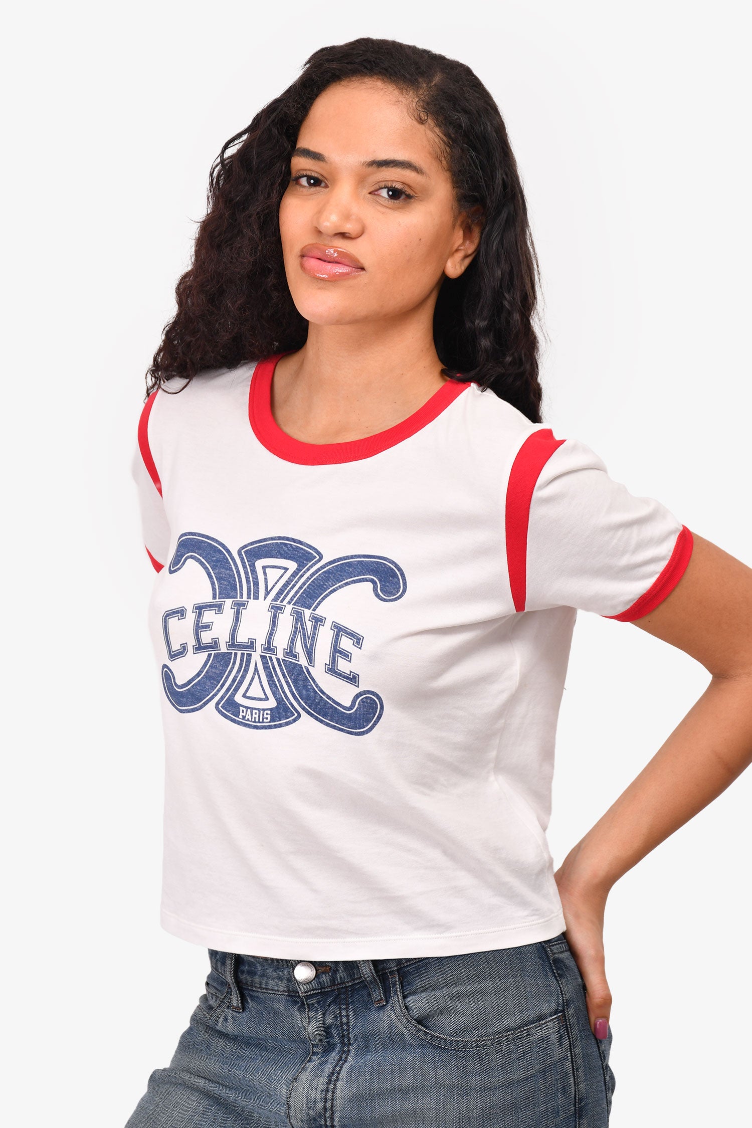 Refresh availabilityCeline White/Blue Cotton Triomphe Printed T-Shirt. Contrast red ribbed collar and sleeves. Short sleeves. Tonal stitching. Vintage-effect logo at the face.