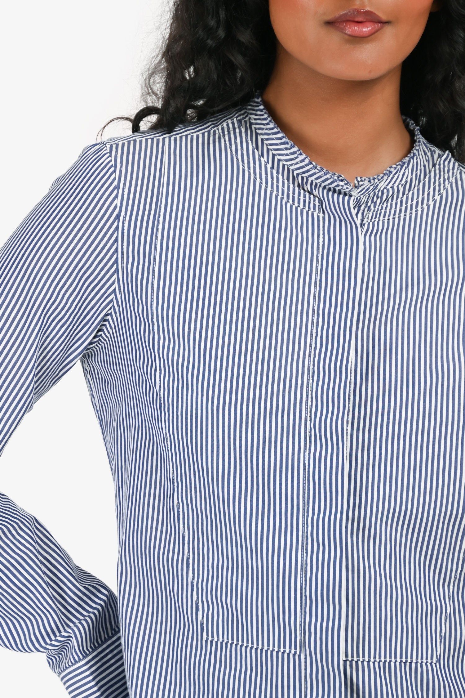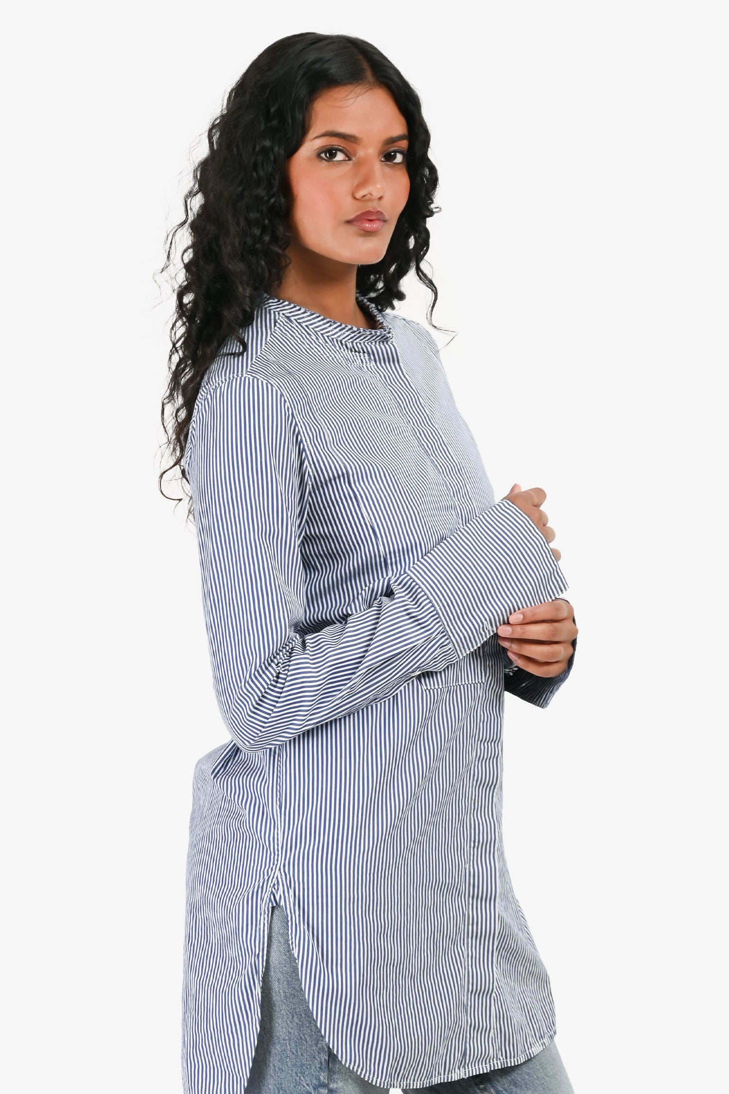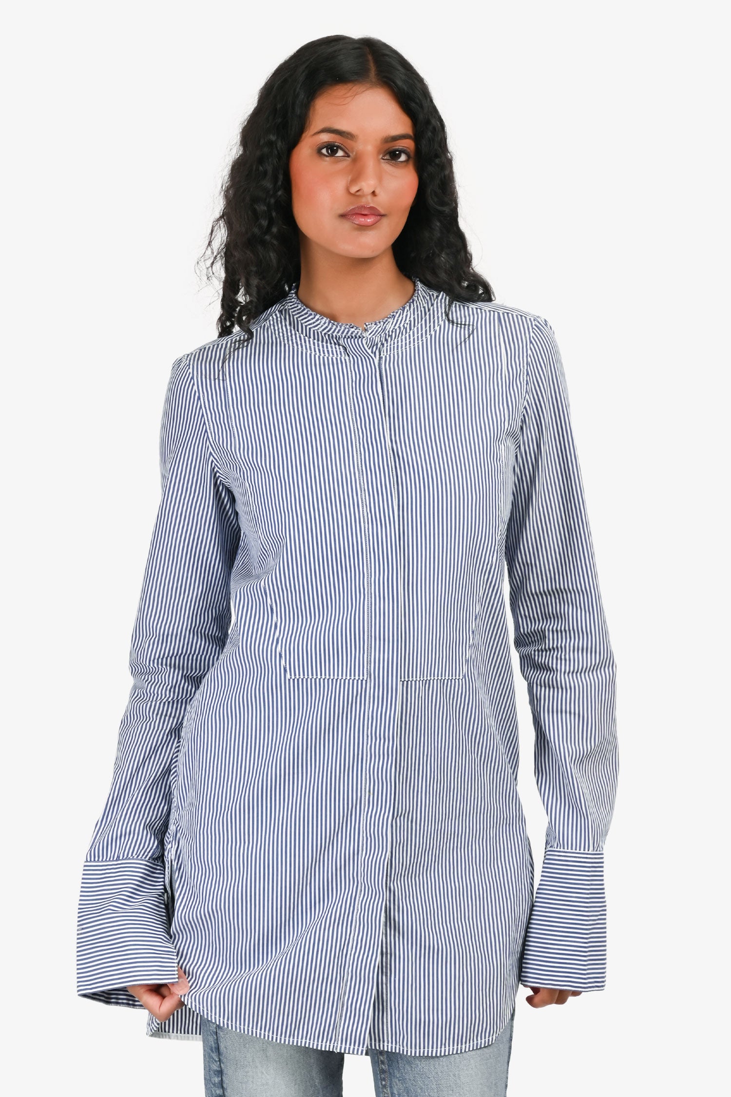 Refresh availabilityCeline White/Blue Striped Mandarin Collar Button Down Tunic. Front button placket. Long sleeves with buttoned cuffs. Tonal stitching.