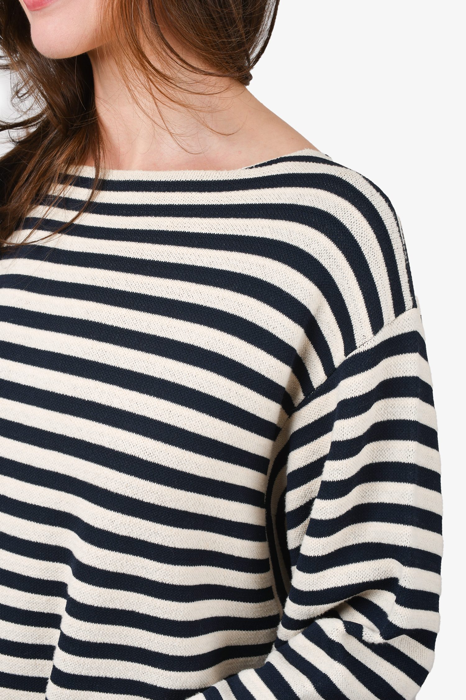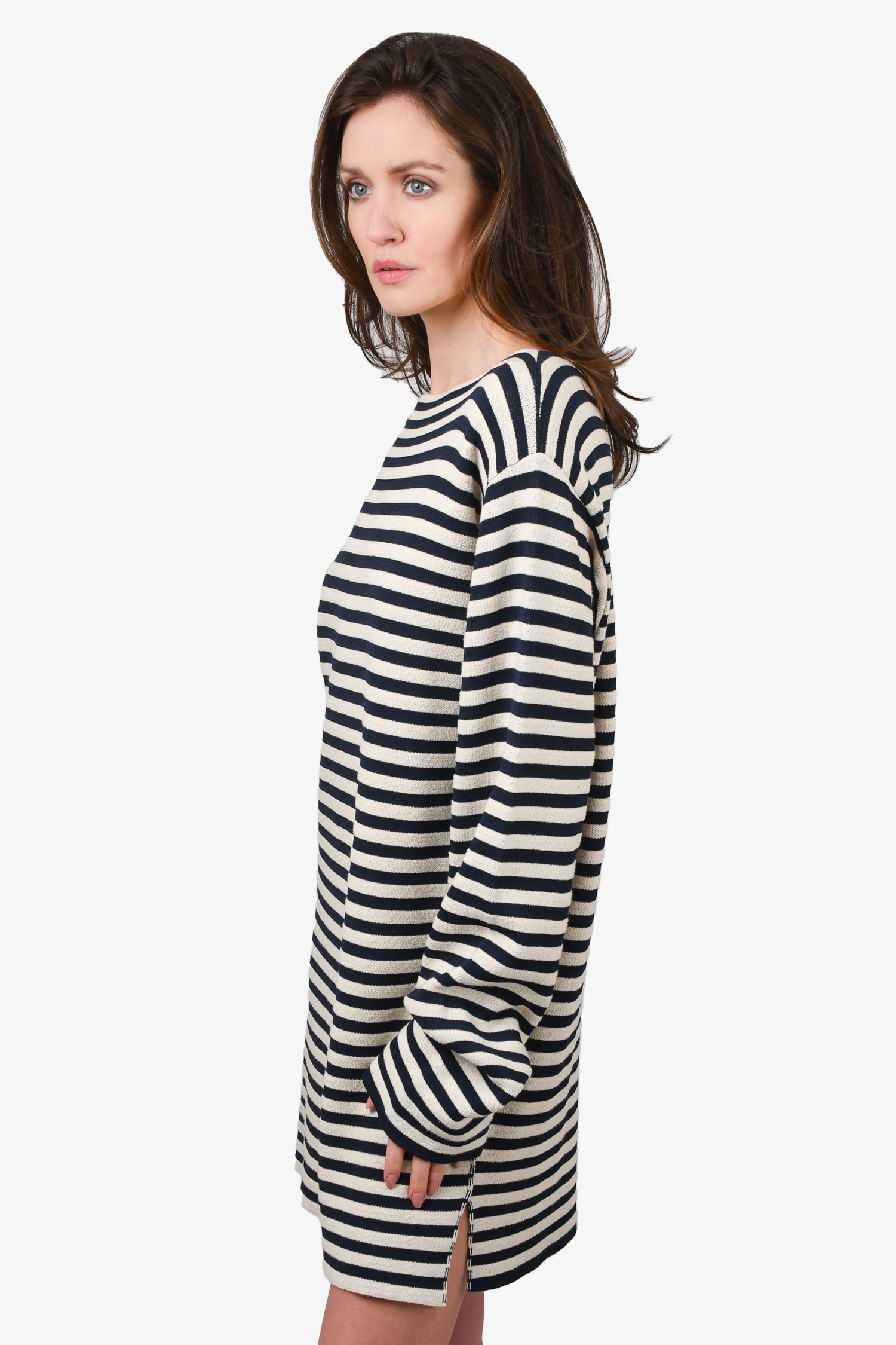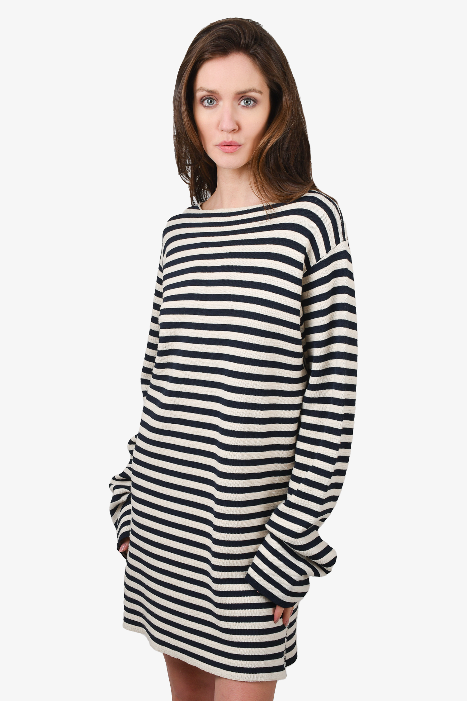 Refresh availabilityCeline White/Navy Pinstripe Dress. Pull-on. Round neck. Unlined. Tonal stitching.
