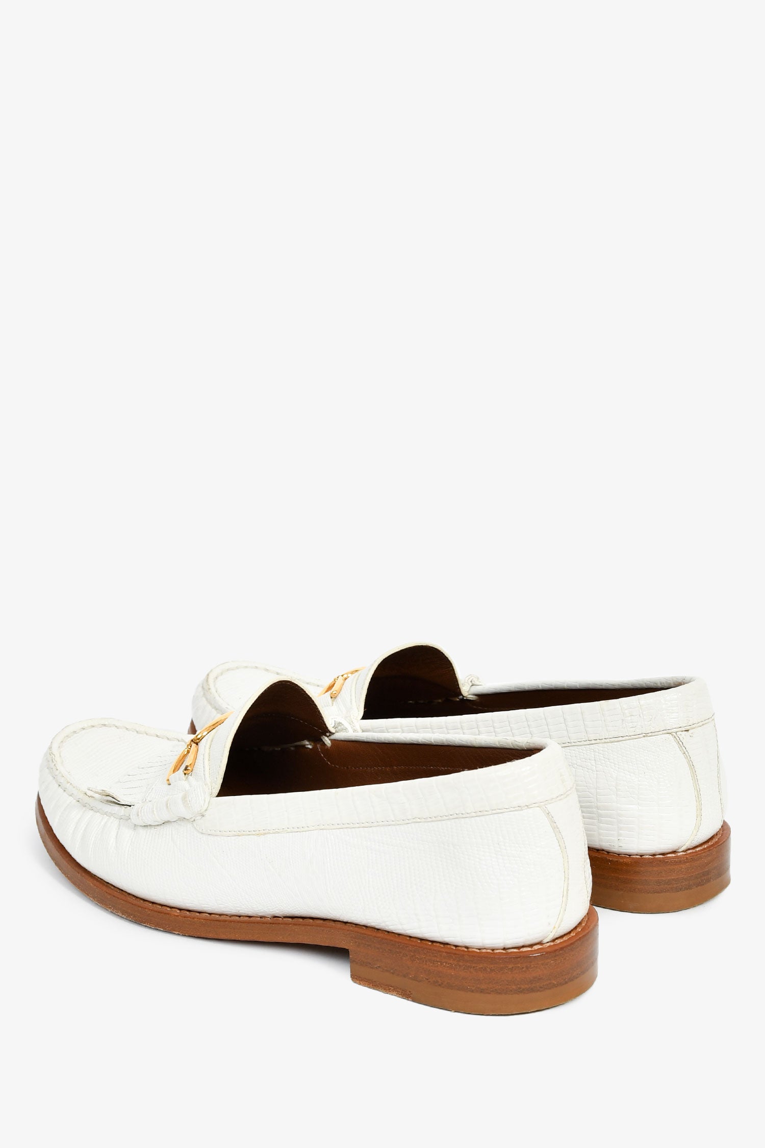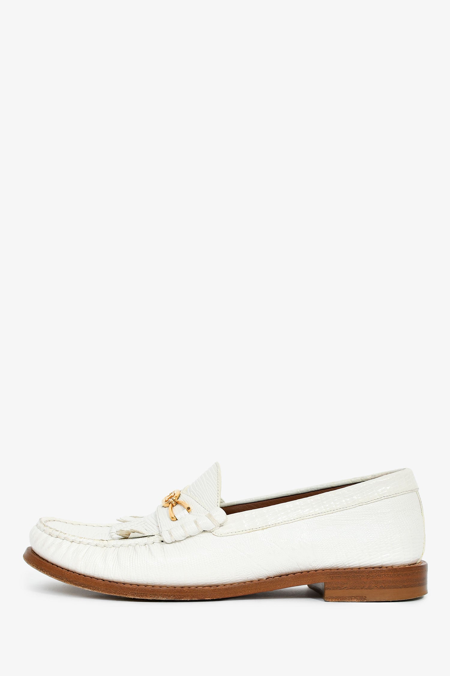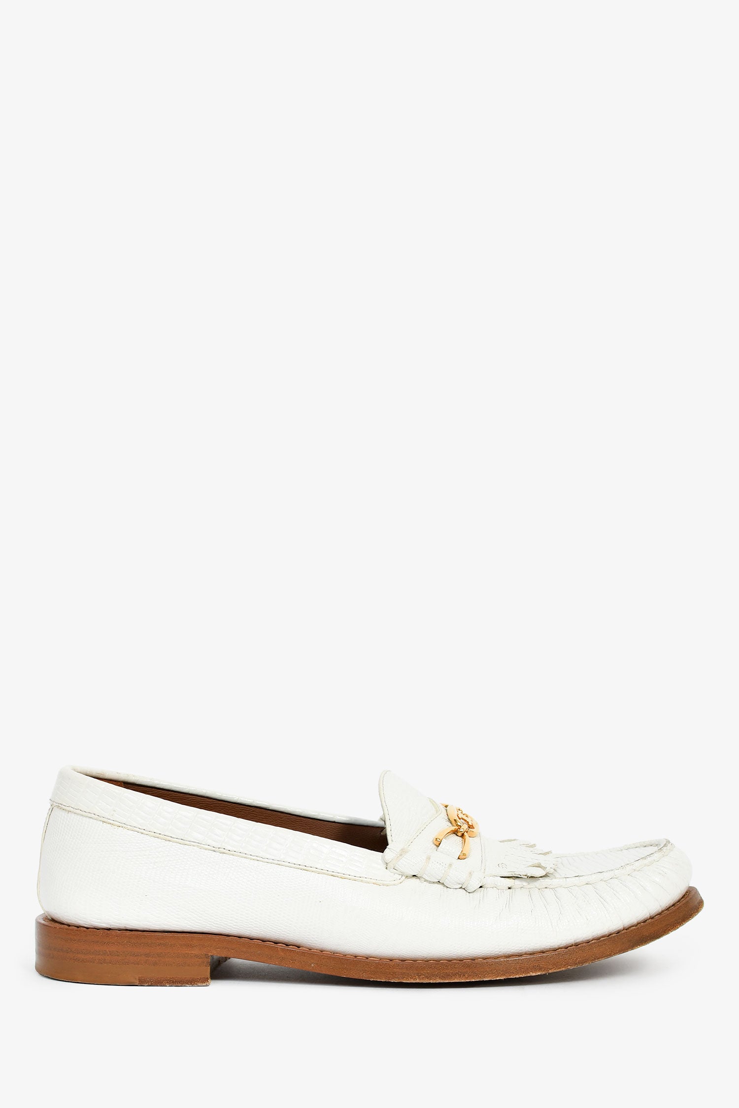 Refresh availabilityCeline White Triomphe Luco Fringe Loafers. Slip-on. Round toe. Gold-tone hardware. Tonal stitching.