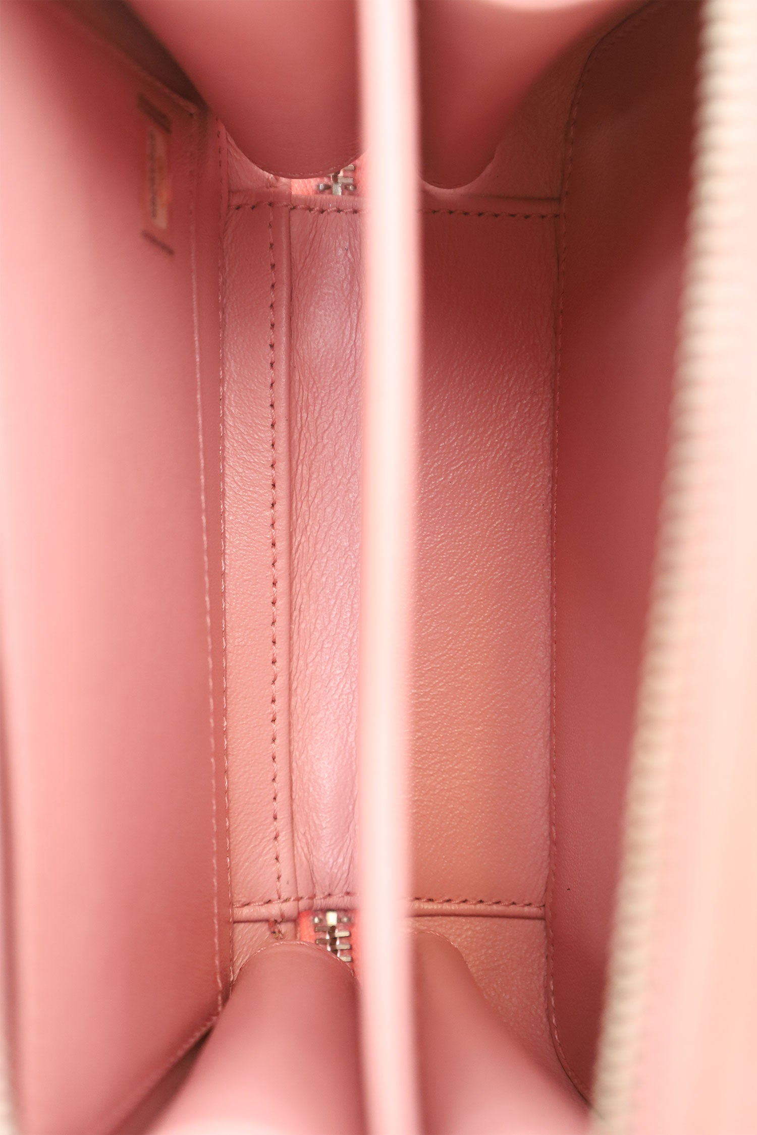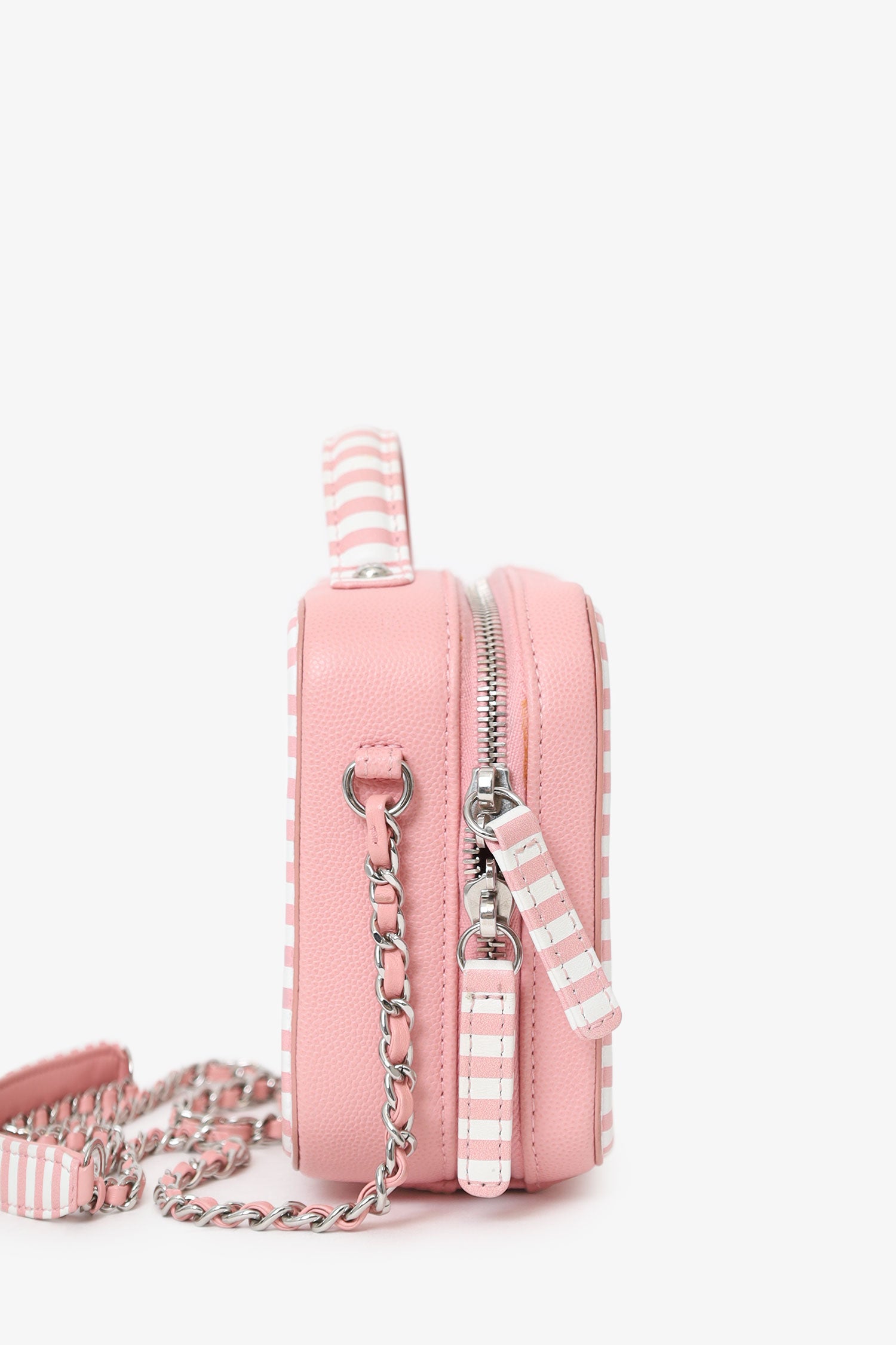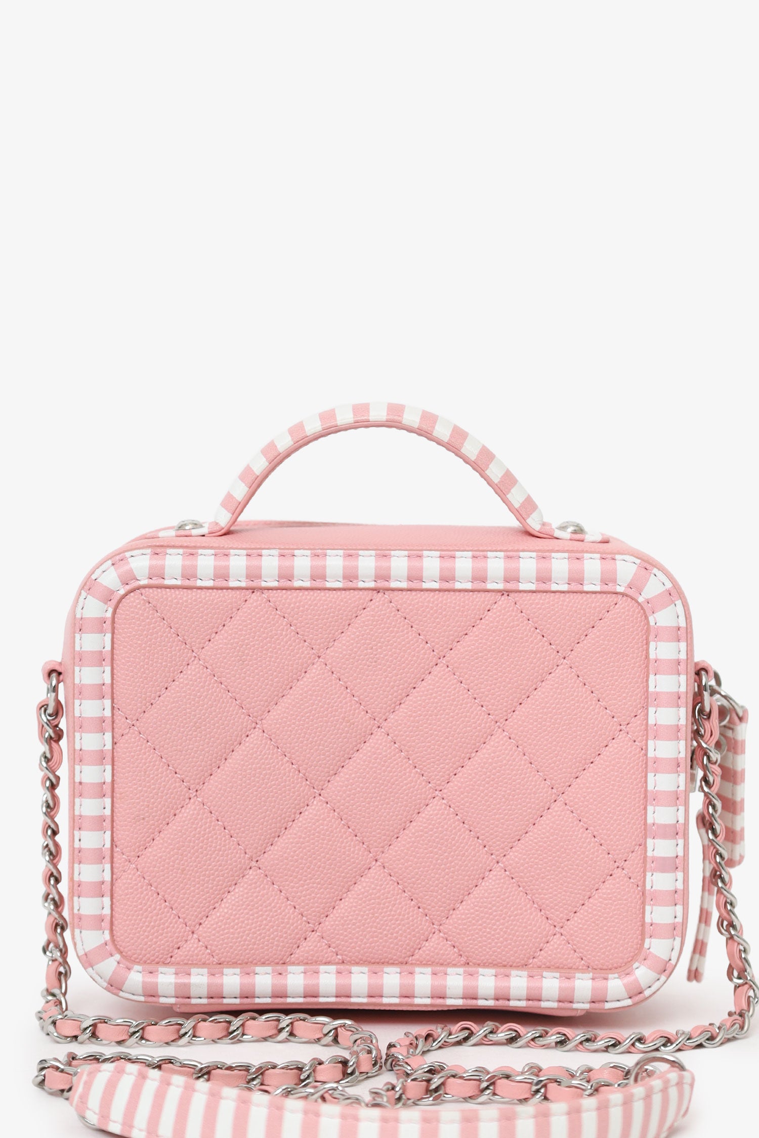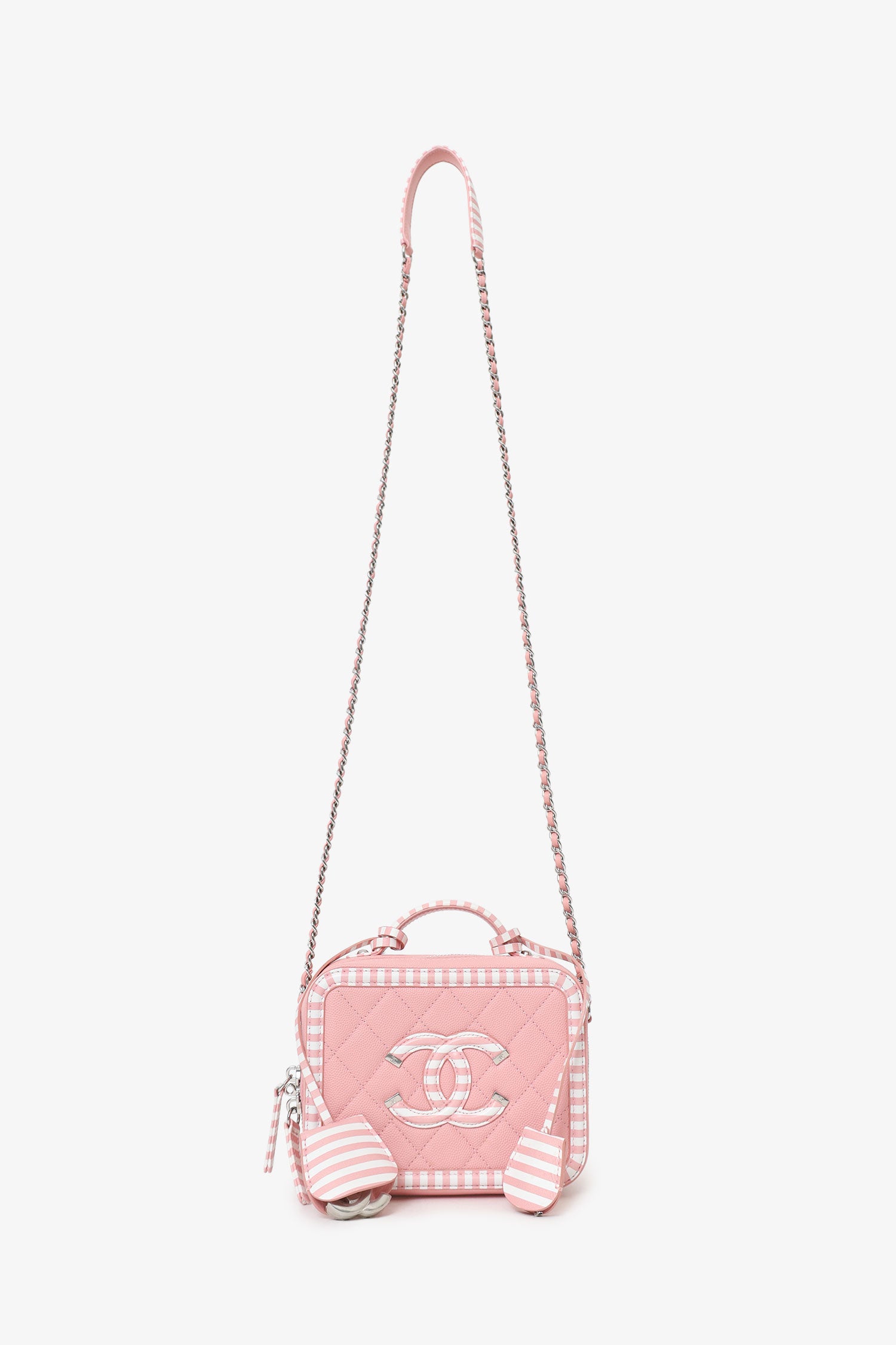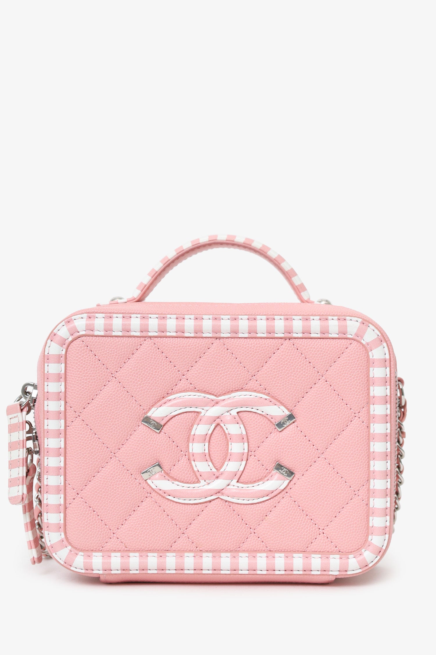 Pre-Loved Chanel™ 2019 Pink/White Caviar Quilted Striped Small CC Filigree Vanity Case. Top 2-way zip closure. Top handle and chainlink and leather crossbody strap. Logo embellishment to front. Striped outline to front and rear. Leather-lined interior with 2 main compartments; front compartment with 1 slip and 1 open pocket, and rear compartment with single open pocket. 2 additional, removable bag tags; 1 with logo charm, and 1 with lock charm. Silver-tone hardware. Tonal stitching.