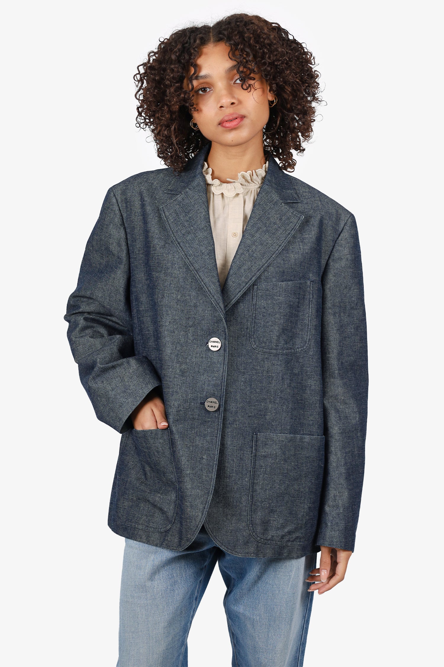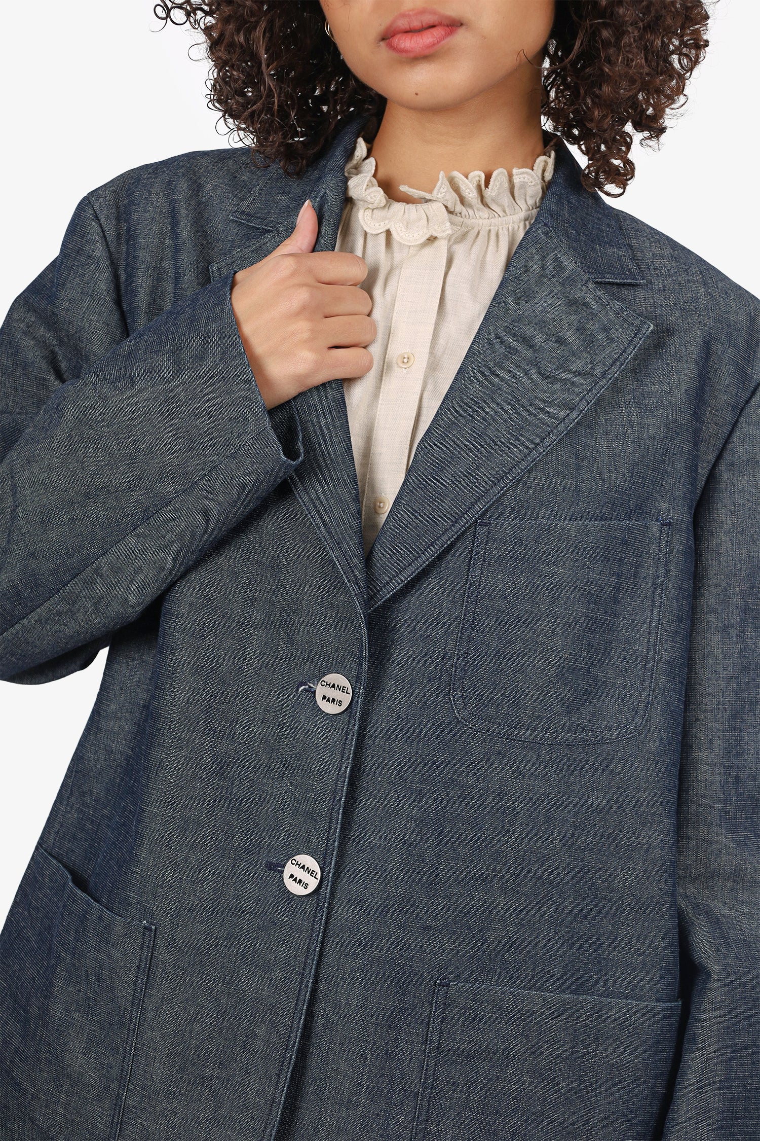 Refresh availabilityPre-Loved Chanel™ 00C Dark Blue Denim CC Button Blazer. Notch lapel. Front button-up closure. 3 front exterior slip pockets. Built-in shoulder pads. Lined interior. Silver-tone hardware. Tonal stitching.