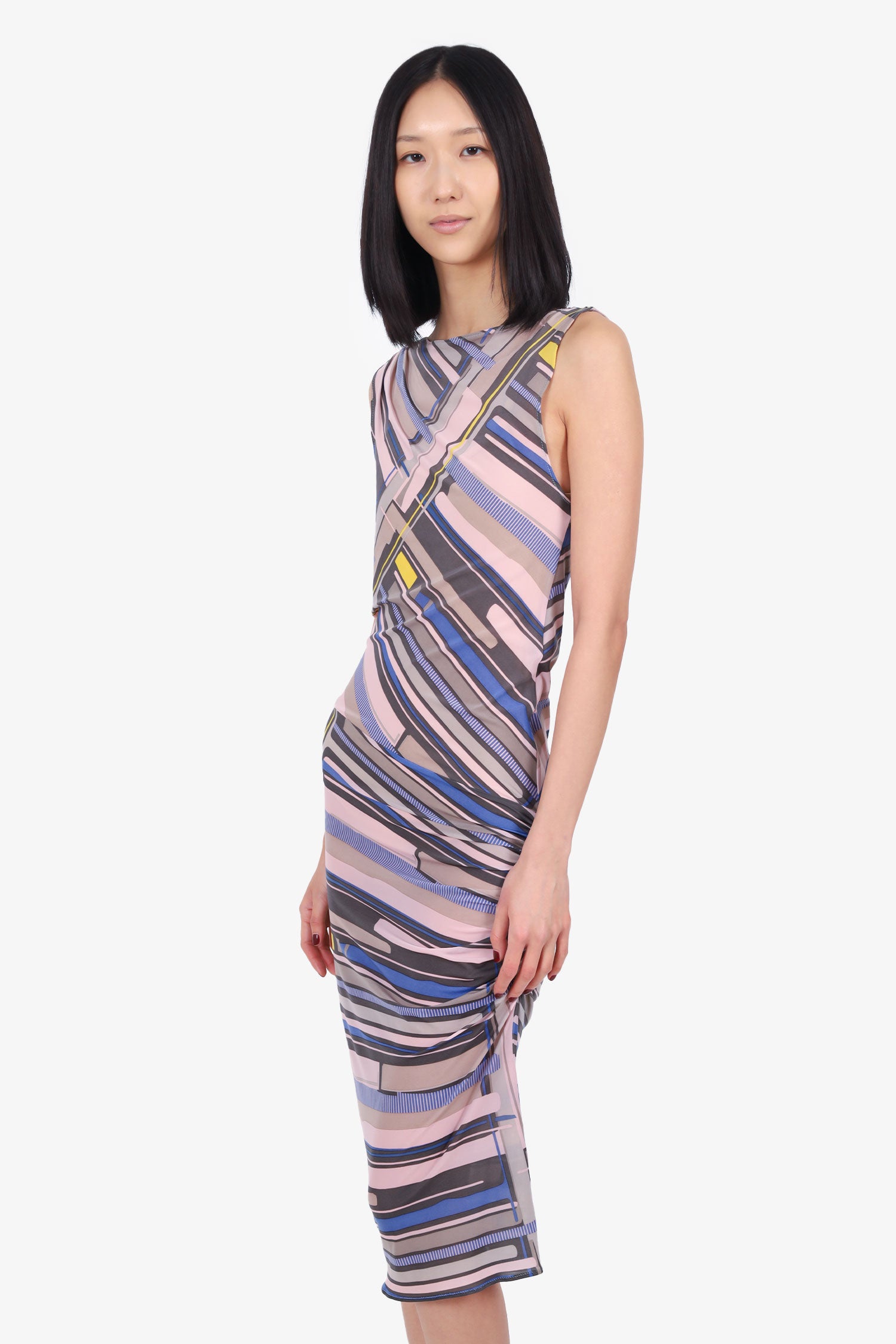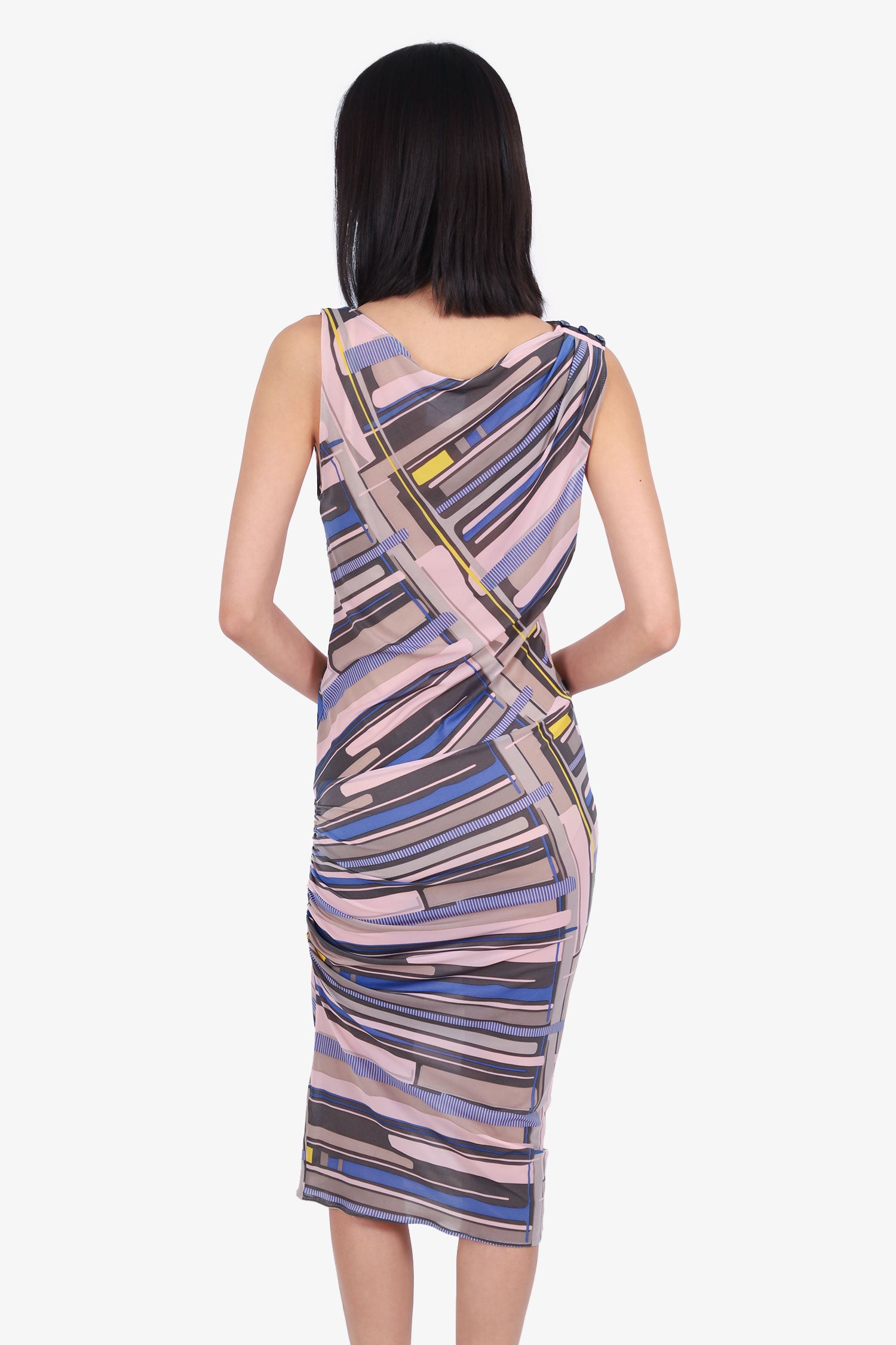 Refresh availabilityPre-Loved Chanel™ 09C Pink/Multicolour Ruched Printed Sleeveless Dress. Pull-on. Round neckline. Button detail at right shoulder. Tonal stitching.