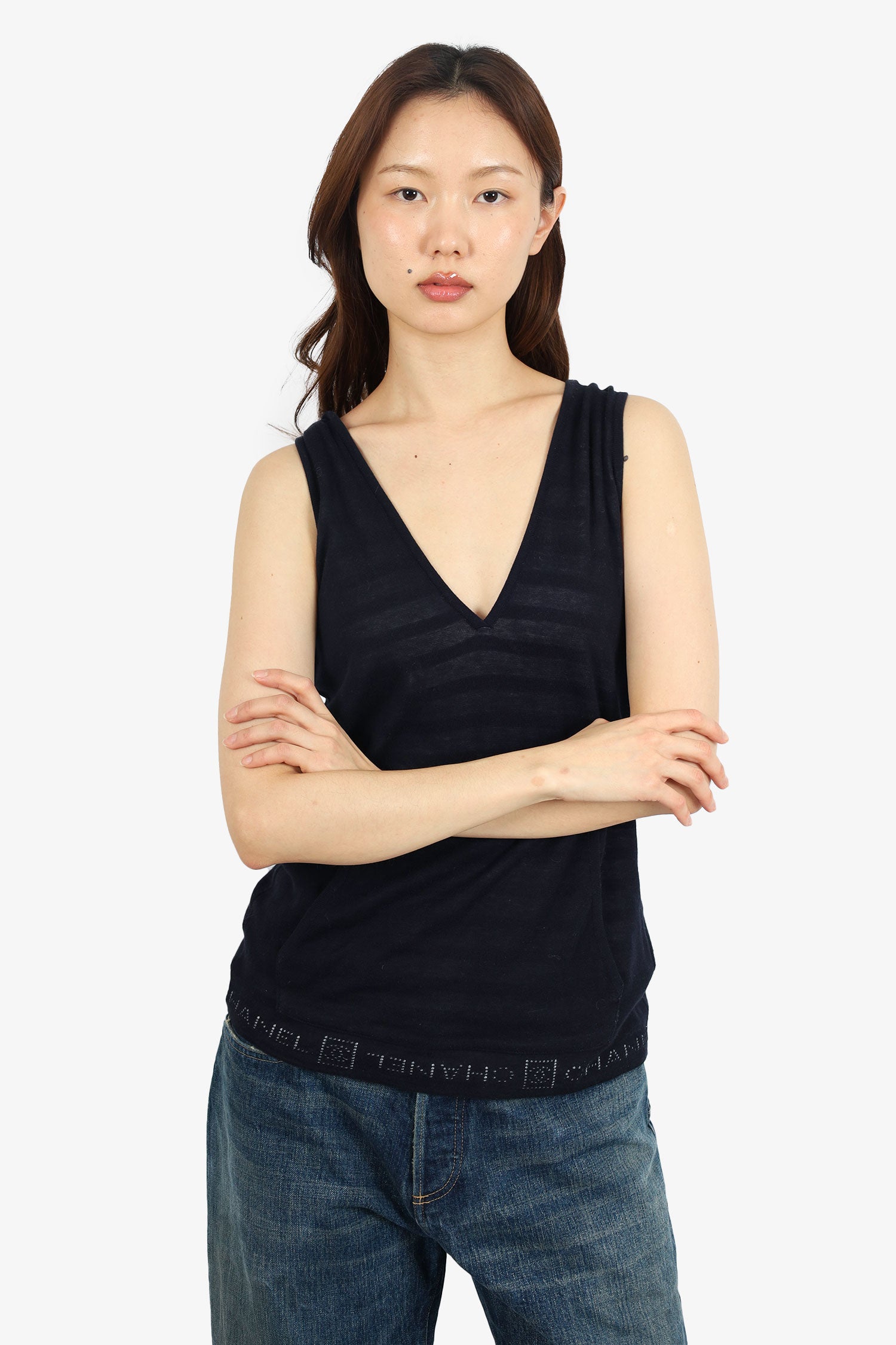 Refresh availabilityPre-Loved Chanel™ 09P Navy Striped Striped Sleeveless Hoodie. Slip-on. V-neckline. Front slip pocket. Tonal stitching.