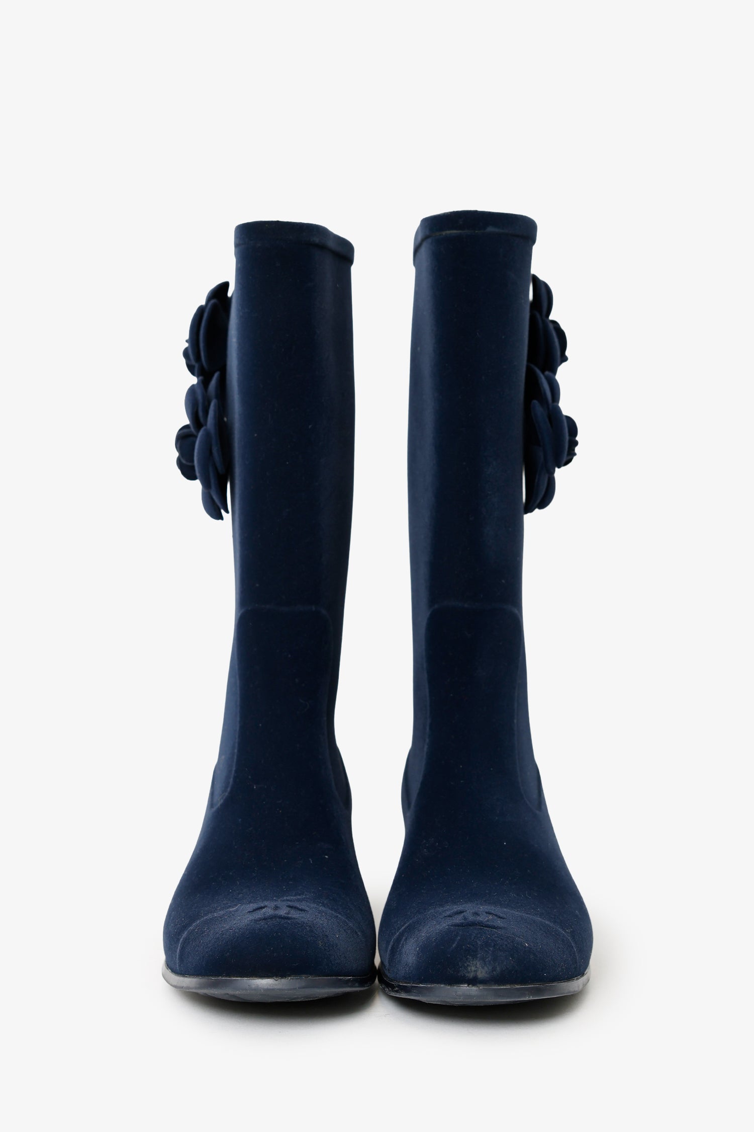 Refresh availabilityPre-Loved Chanel™ 11A Navy Velvet Camellia Rubber Rain Boots. Round toe. Floral detail at shaft. Tonal stitching.