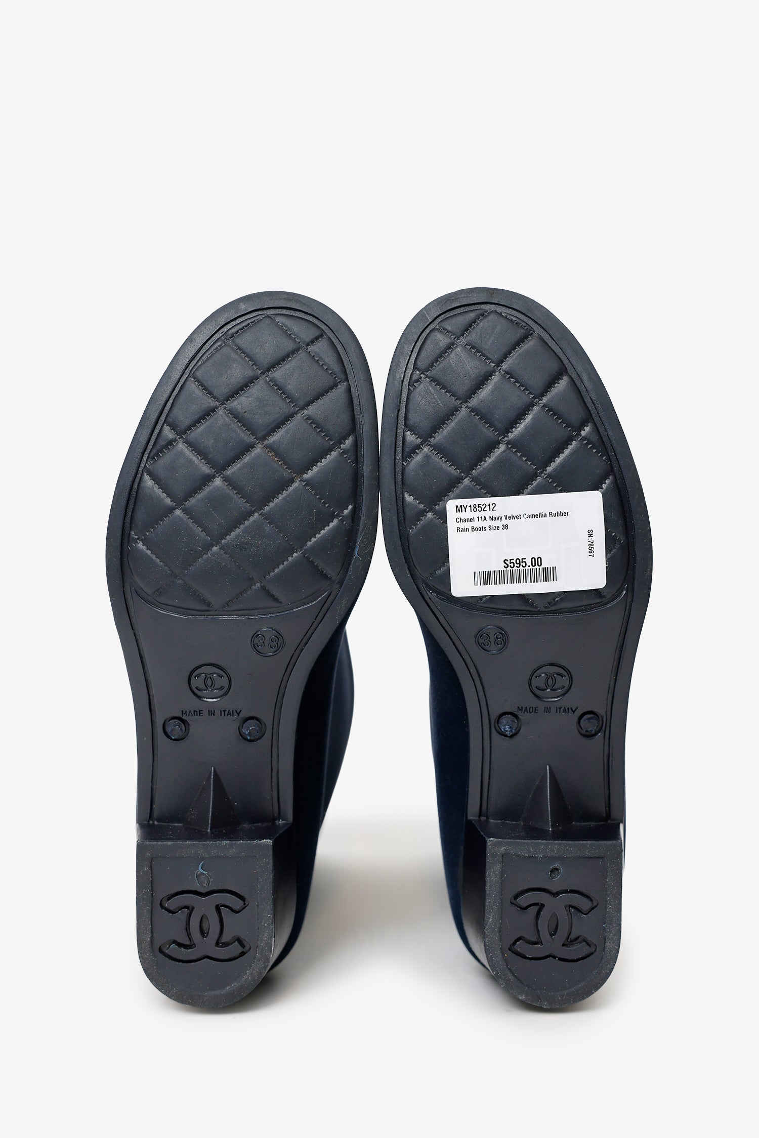 Pre-Loved Chanel™ 11A Navy Velvet Camellia Rubber Rain Boots Size 38