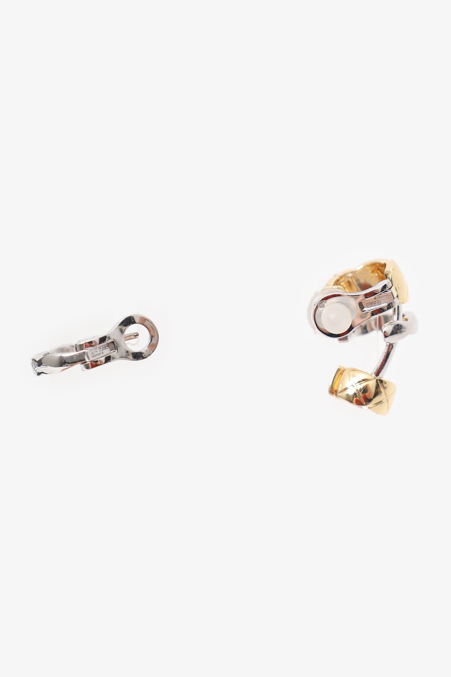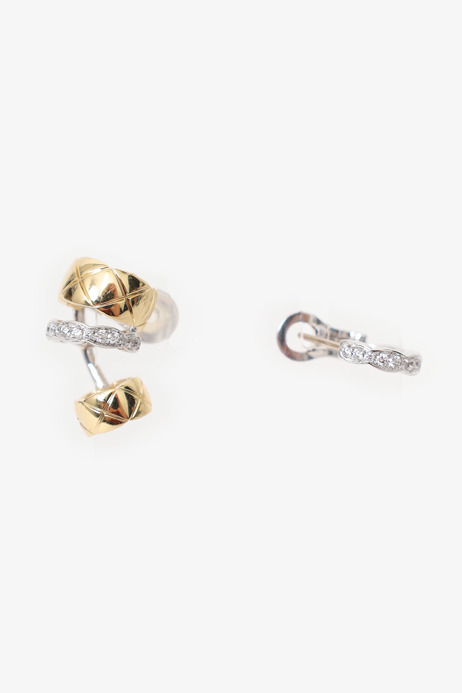 Refresh availabilityPre-Loved Chanel™ 18K Gold Coco Crush Quilted Motif Earrings. One pair of ladies bespoke, designer made polished 18K white & yellow gold, diamond modern-style huggy-style earrings with omega-wire backs. Trademark found on item. Gold-tone hardware.