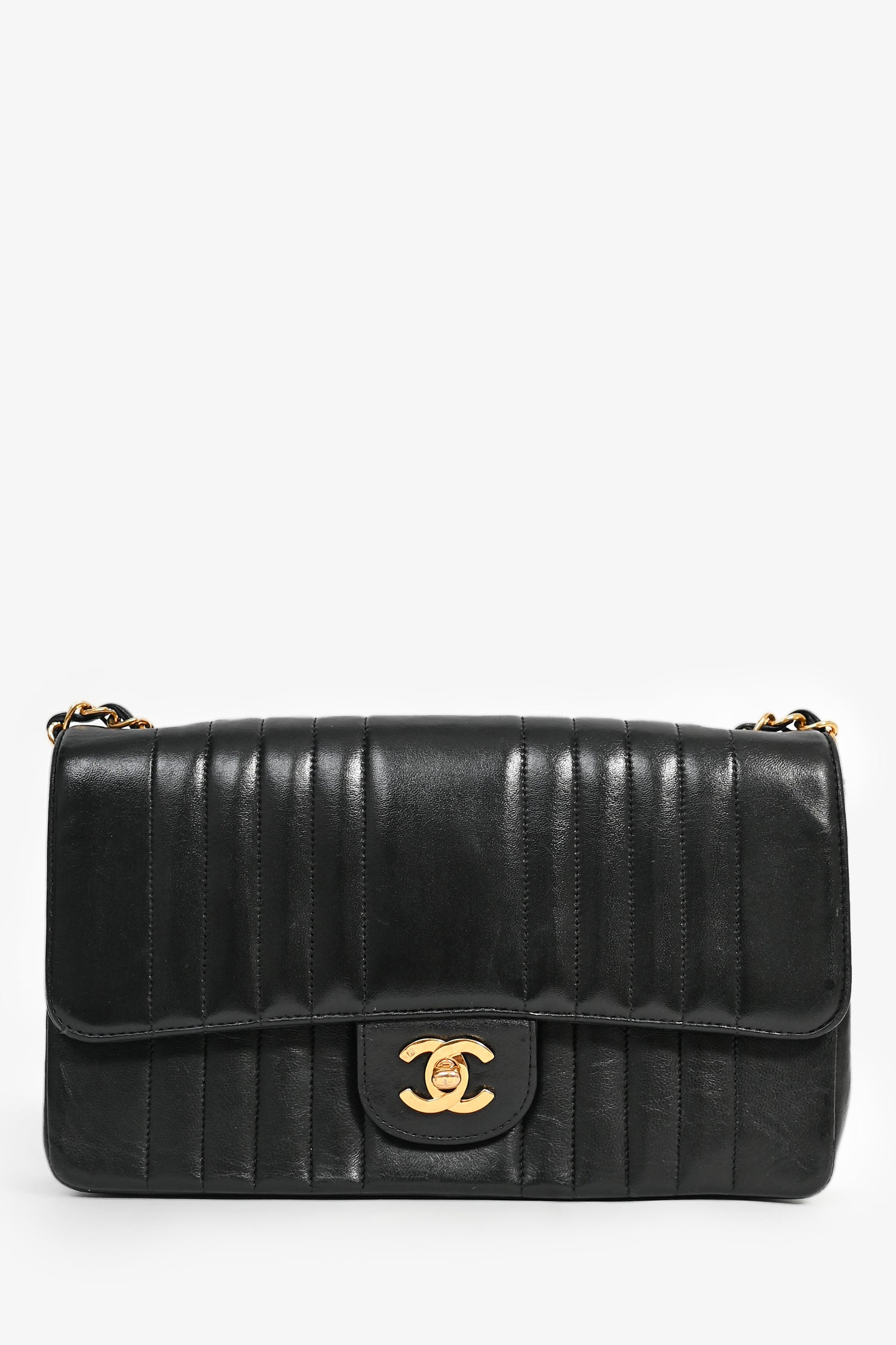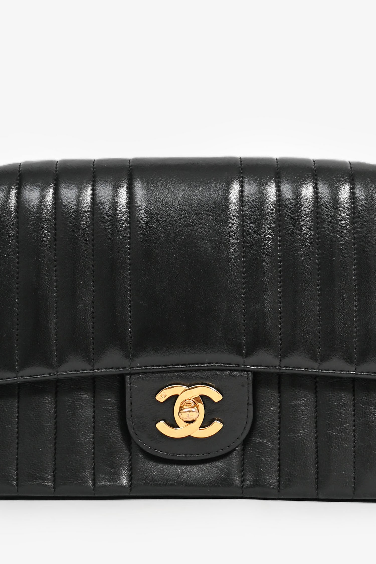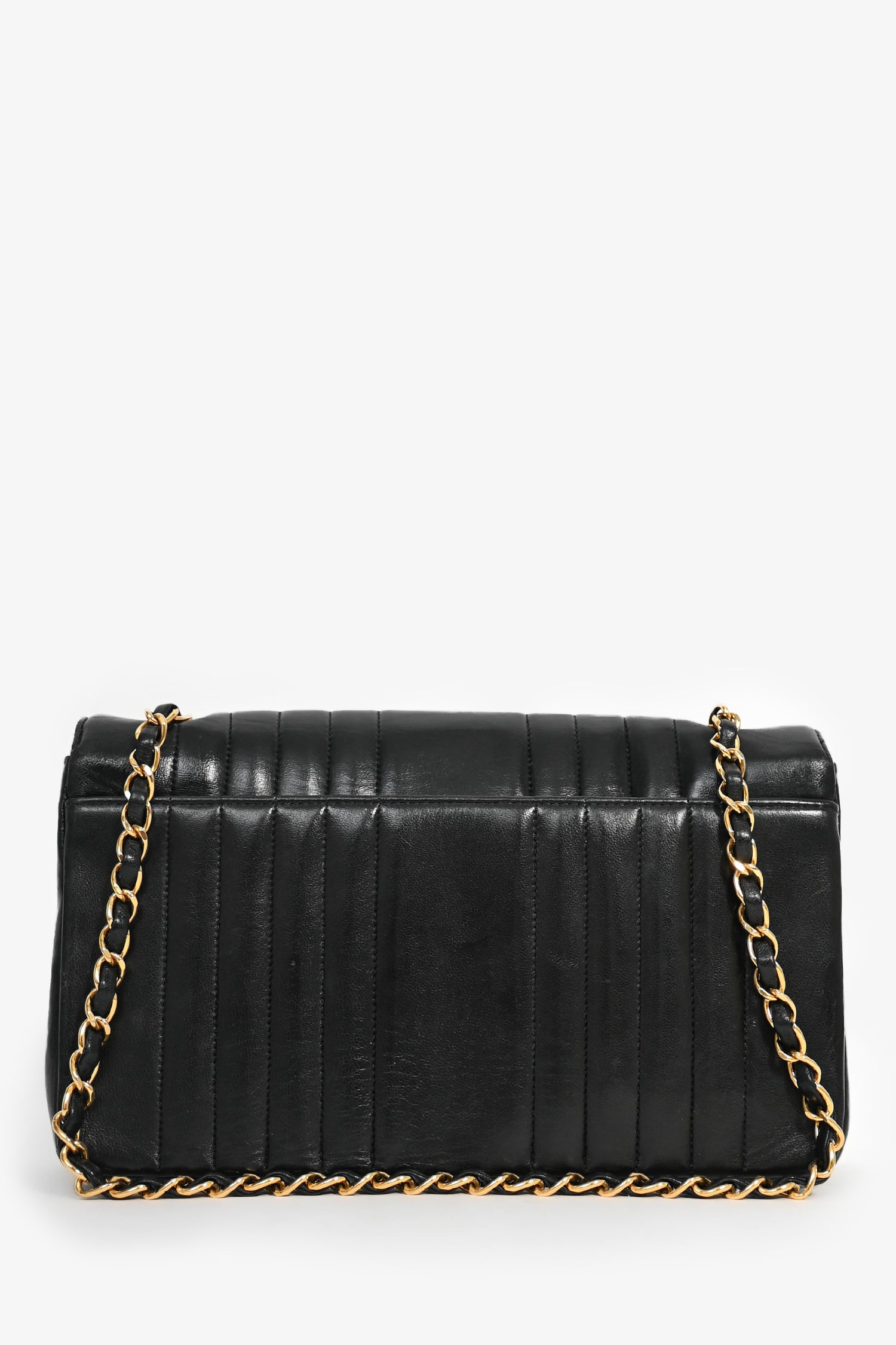 Pre-Loved Chanel™ 1991-94 Vintage Black Vertical Quilted Lambskin Medium CC Flap Bag. Fold-over flap with a turn-lock closure. Gold-tone hardware. Chain-link and leather shoulder strap. Gold-tone hardware. Leather lined interior with a zipped compartment and slip pocket. Tonal stitching.