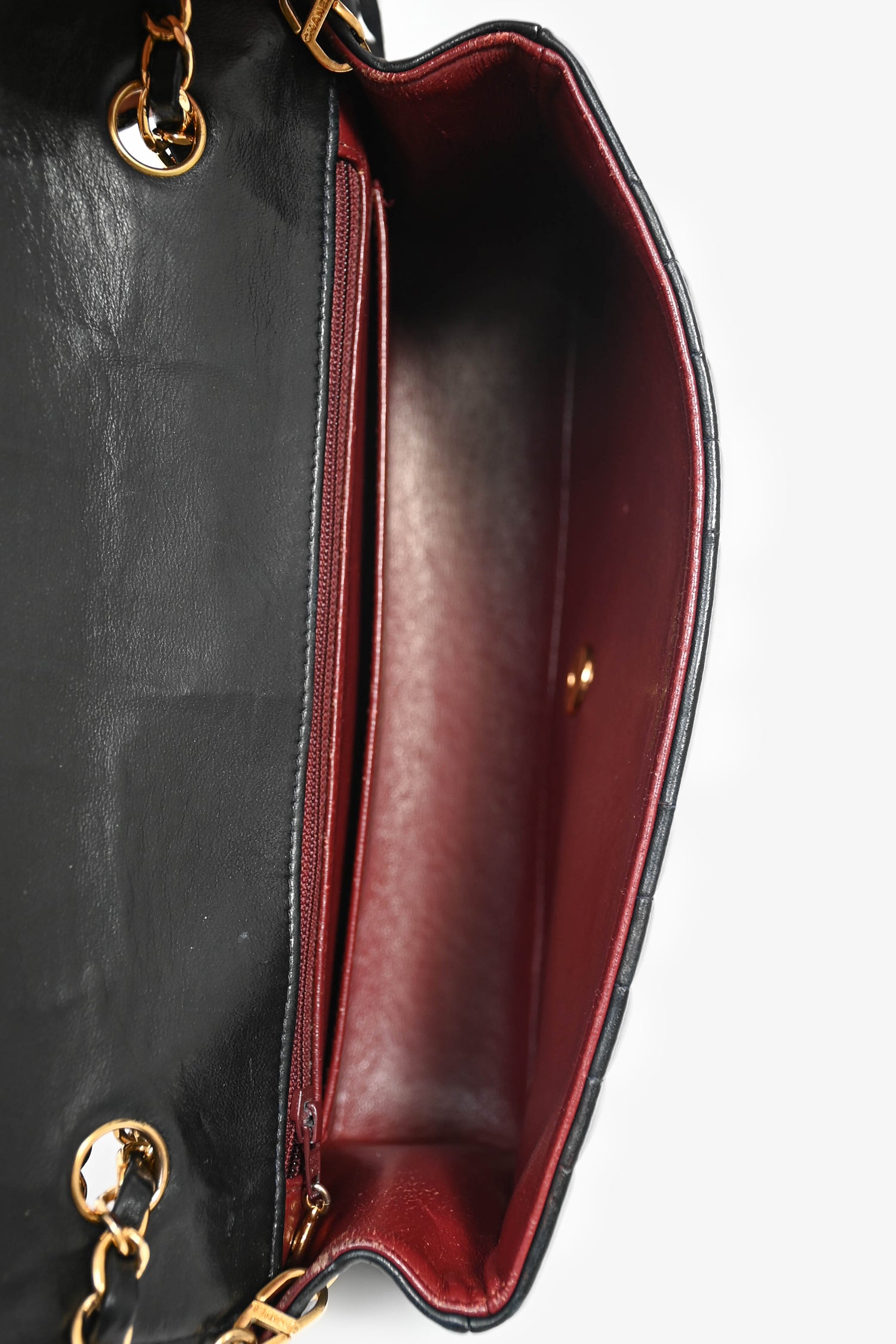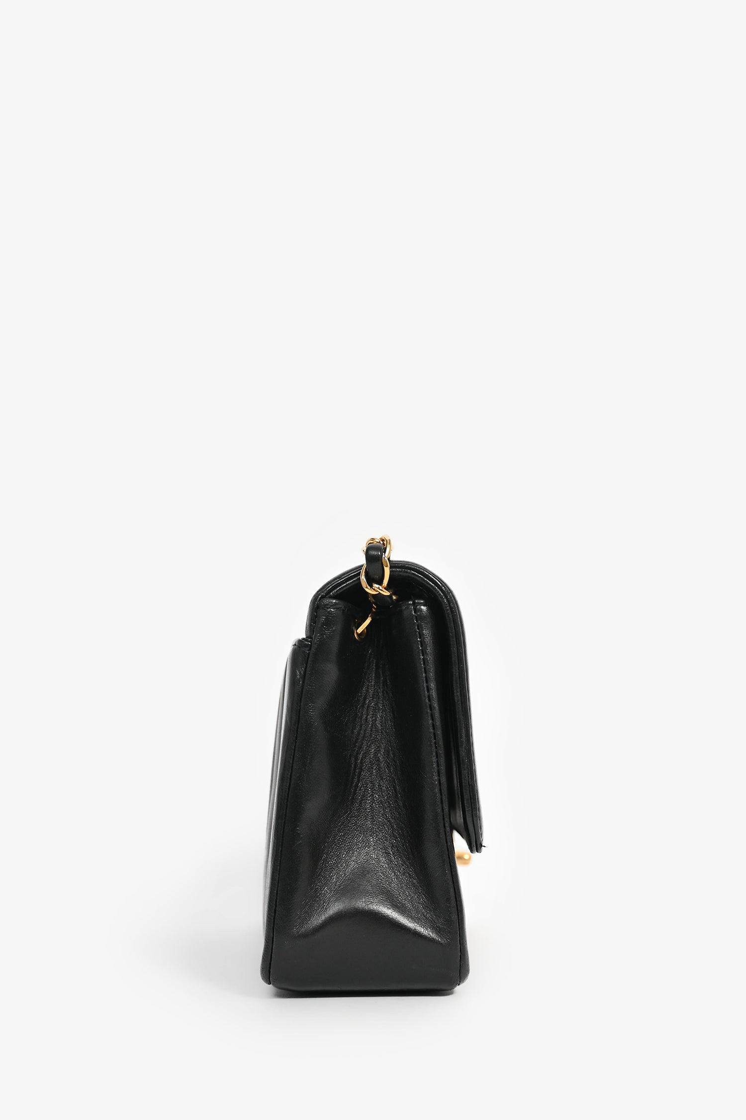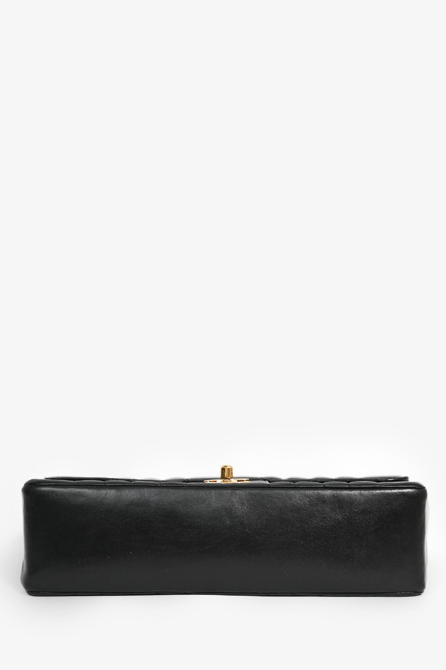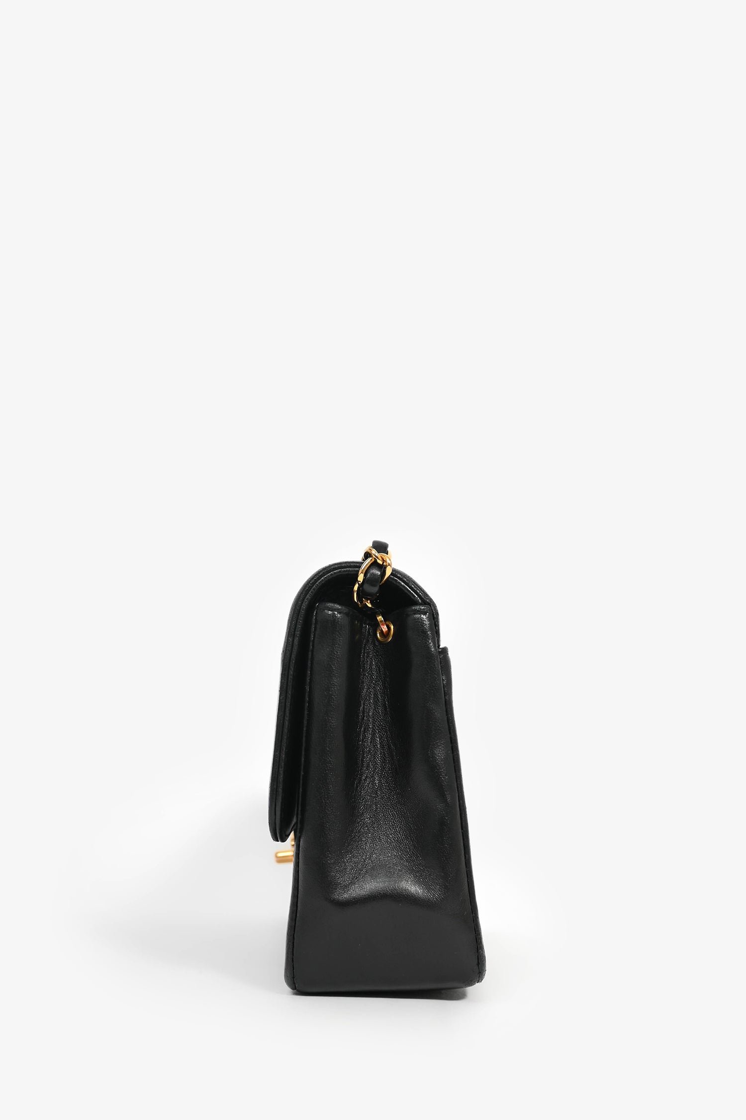 Pre-Loved Chanel™ 1991-94 Vintage Black Vertical Quilted Lambskin Medium CC Flap Bag. Fold-over flap with a turn-lock closure. Gold-tone hardware. Chain-link and leather shoulder strap. Gold-tone hardware. Leather lined interior with a zipped compartment and slip pocket. Tonal stitching.