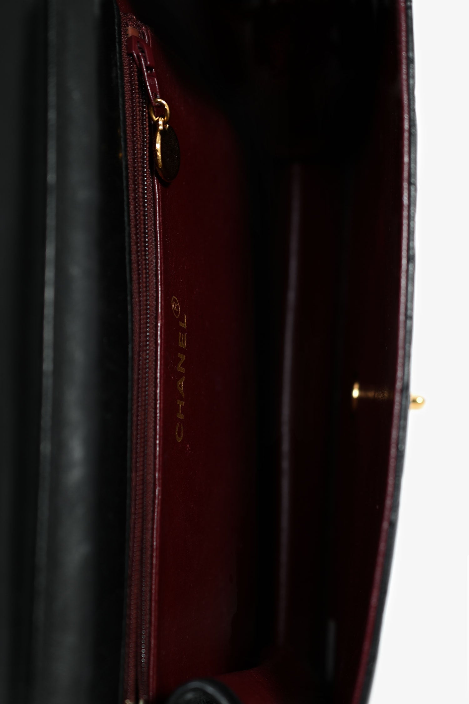 Refresh availabilityPre-Loved Chanel™ 1994 Black Lambskin Single Chain Flap Bag. Front fold-over flap with turn-lock closure. Burgundy leather interior. Single interior wall zip pocket. Slide-around chain (non-adjustable). Gold-tone hardware.