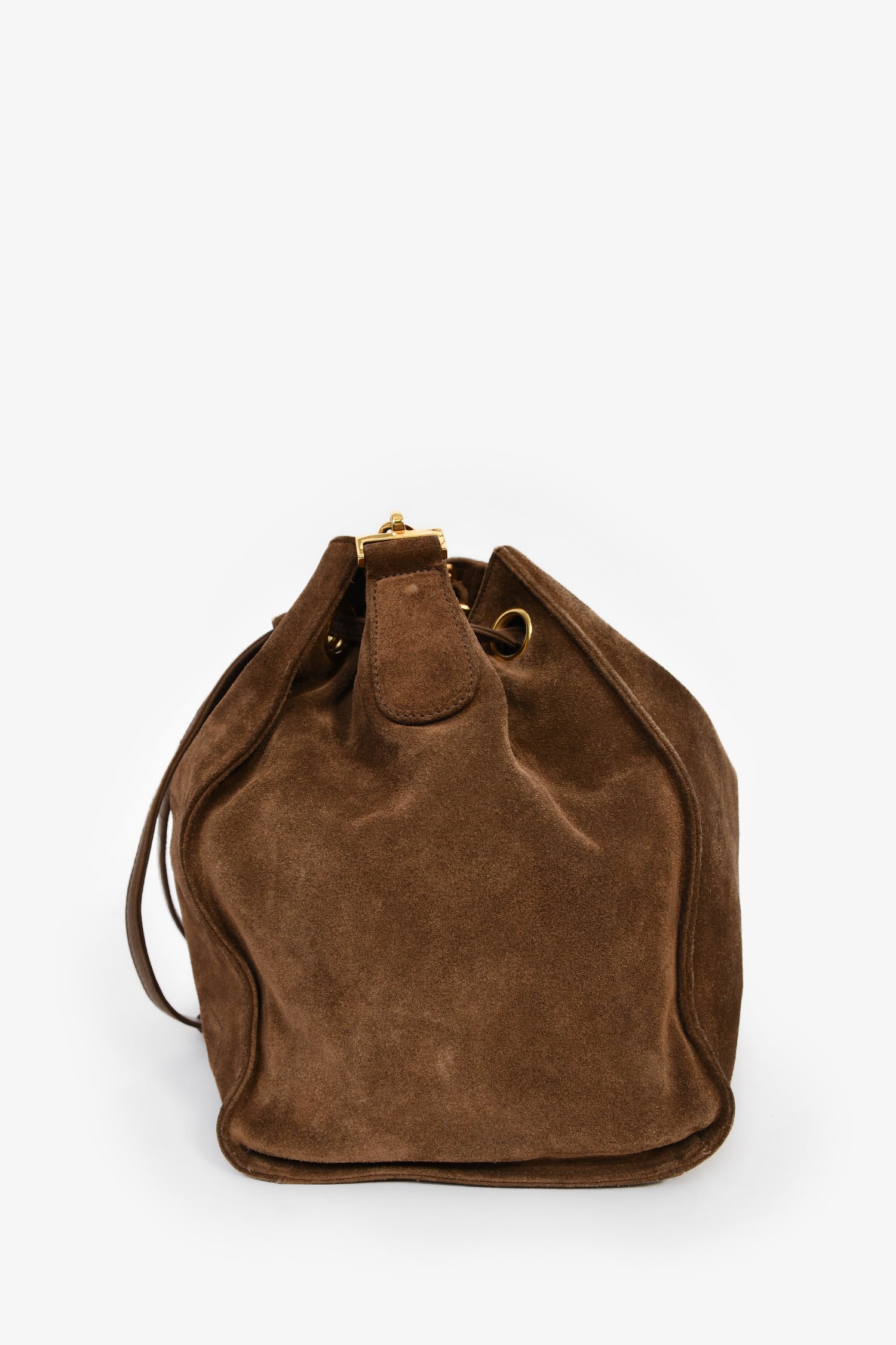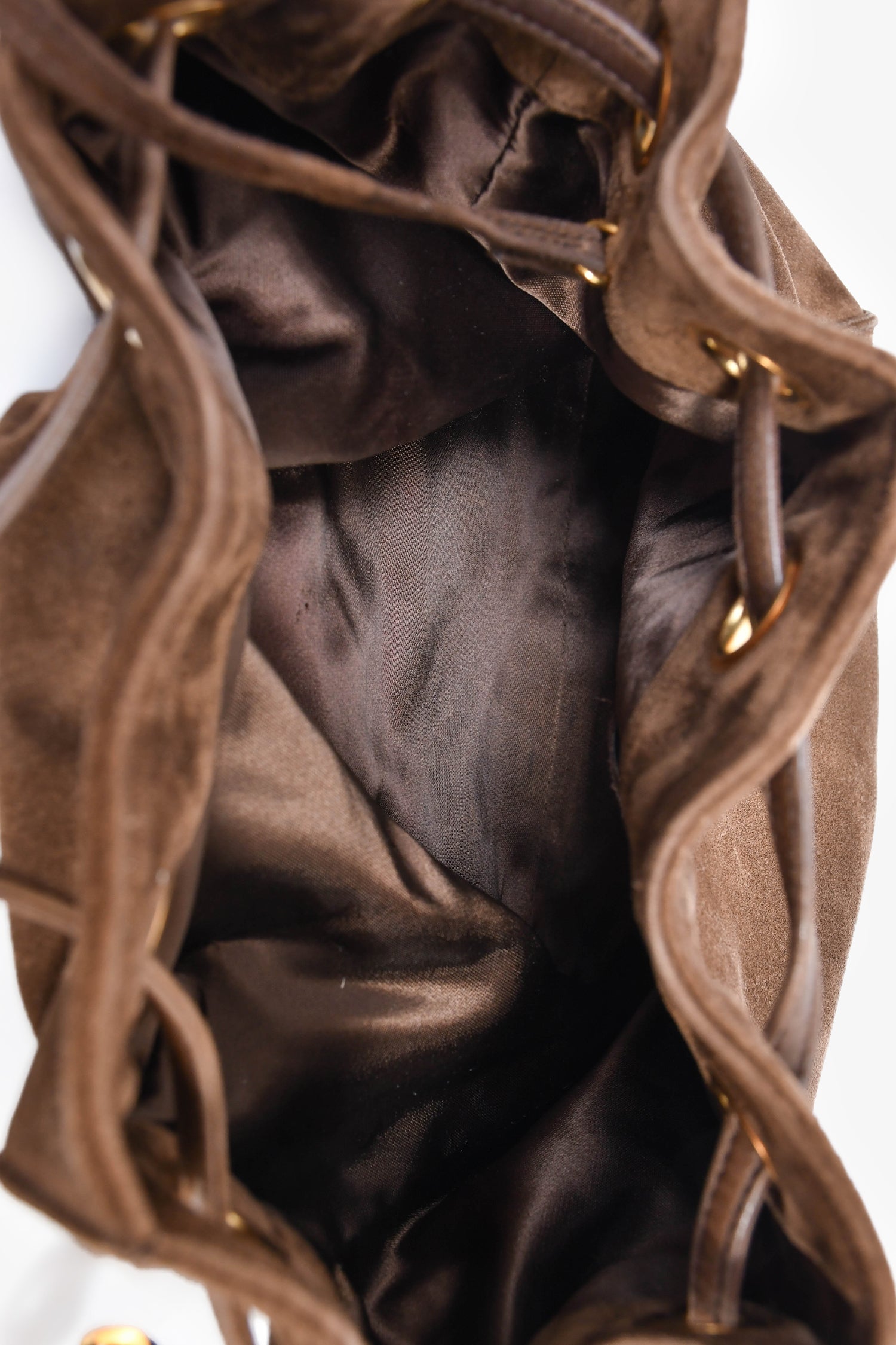 Refresh availabilityPre-Loved Chanel™ 1994-96 Brown Suede Timeless Drawstring Bucket Bag. Open interior with pull tabs. Chain-link and suede shoulder strap. Lined interior. Comes with single attachable pouch. Gold-tone hardware. Tonal stitching.