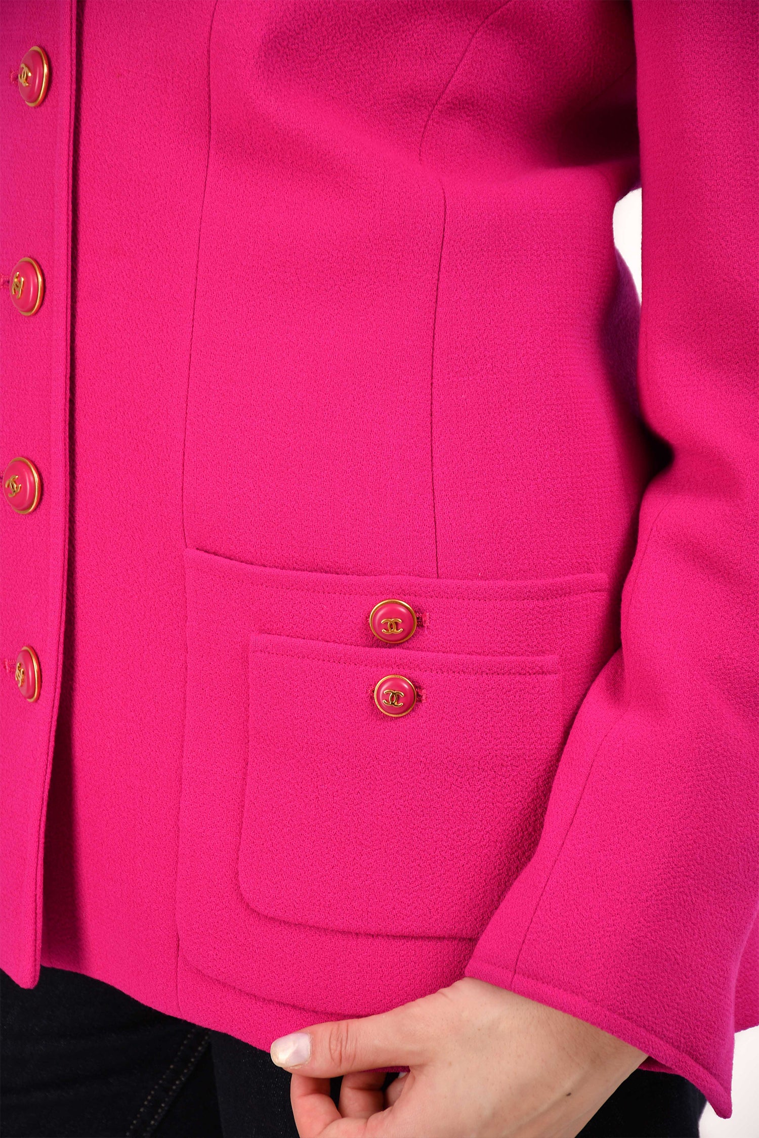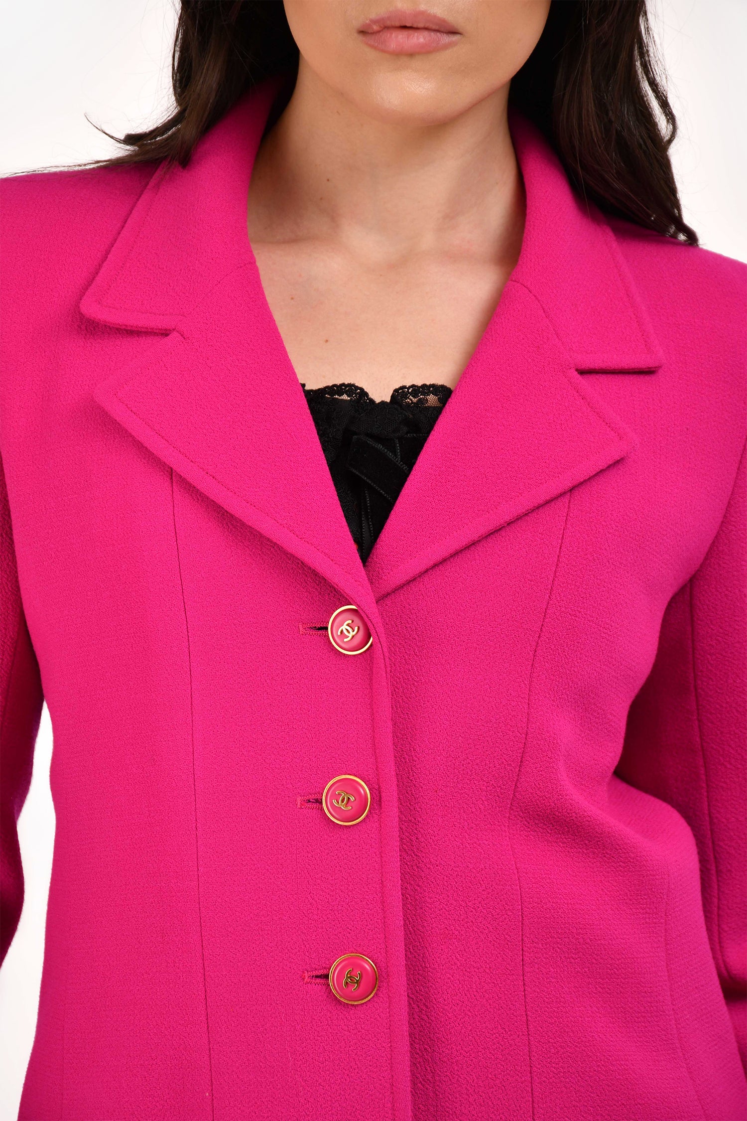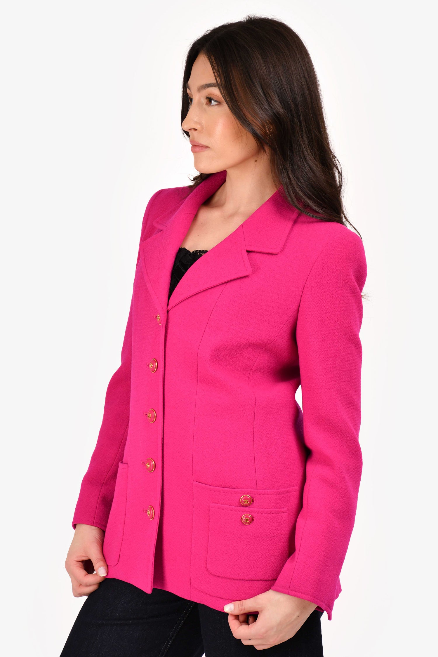 Pre-Loved Chanel™ 1995 Magenta Wool Buttoned Blazer. Front button closure with signature CC buttons. Long sleeves with buttoned cuffs. Three front slip pockets. Fully lined. Tonal stitching.