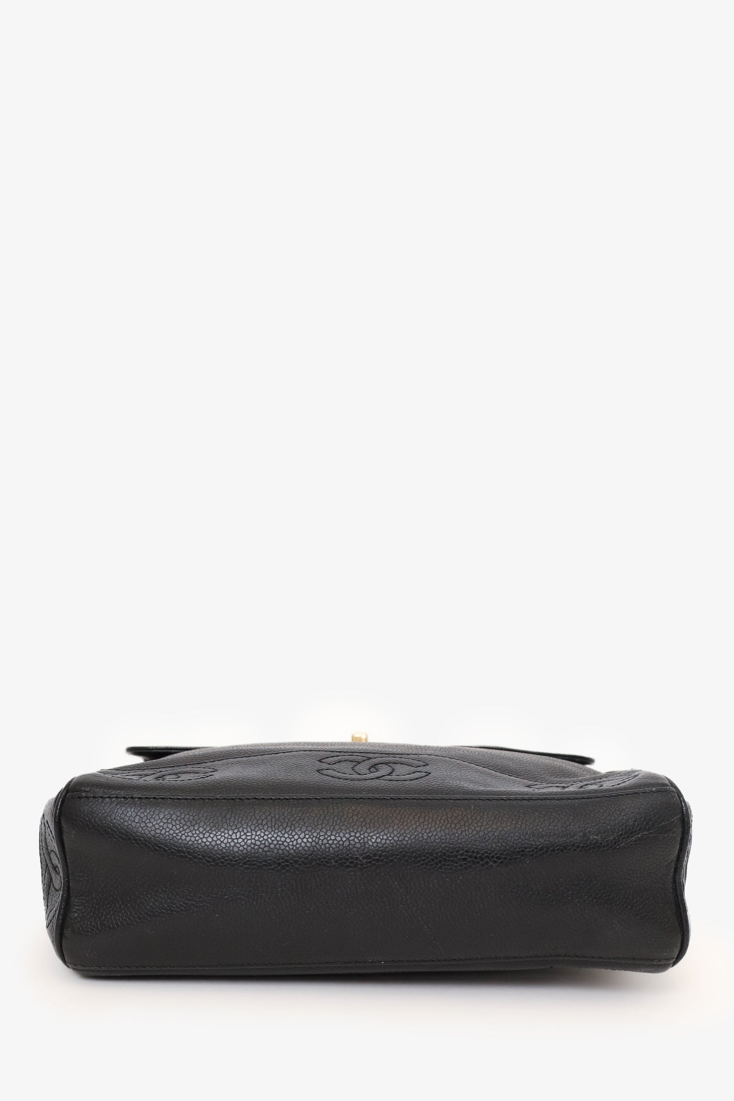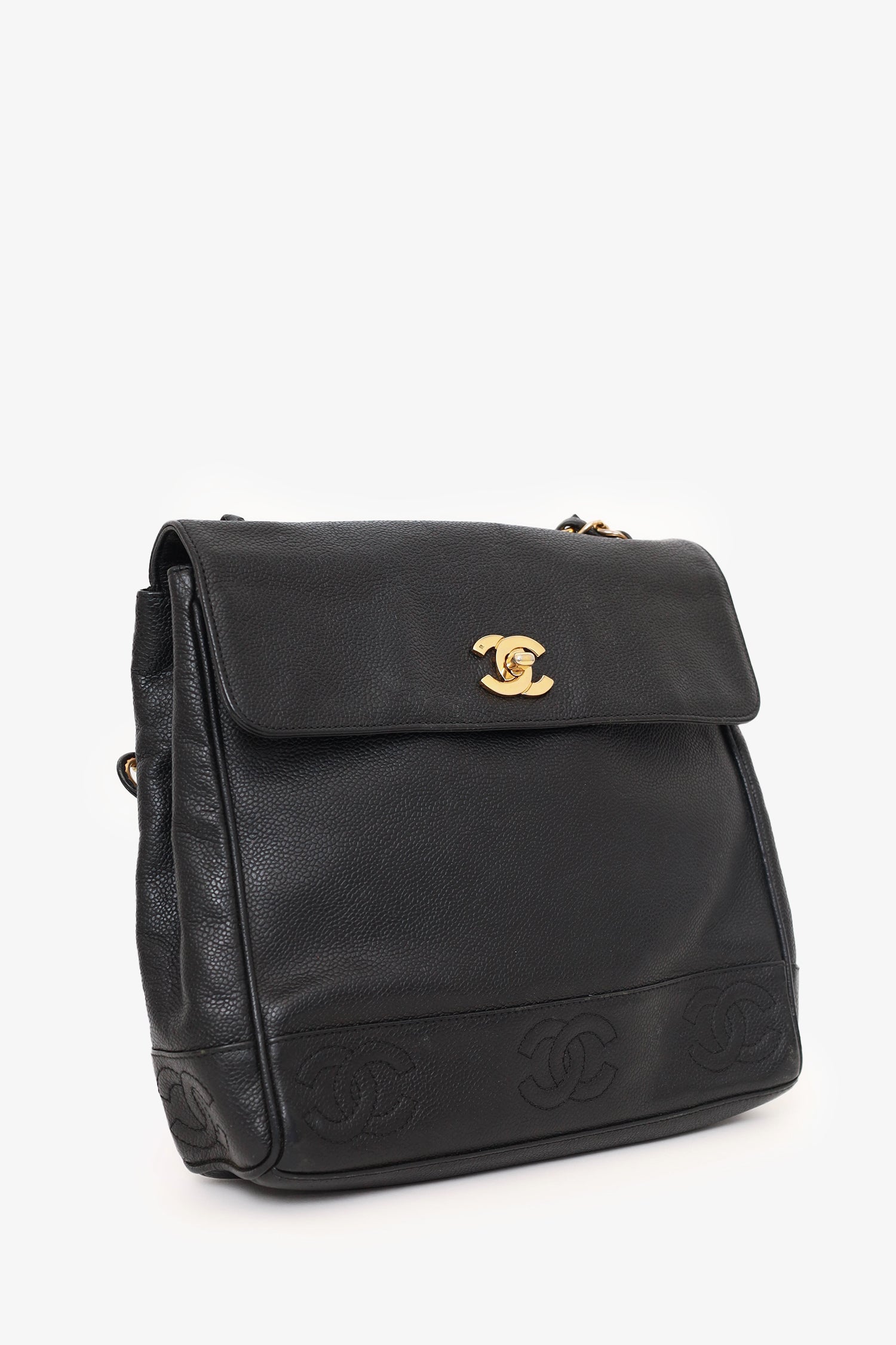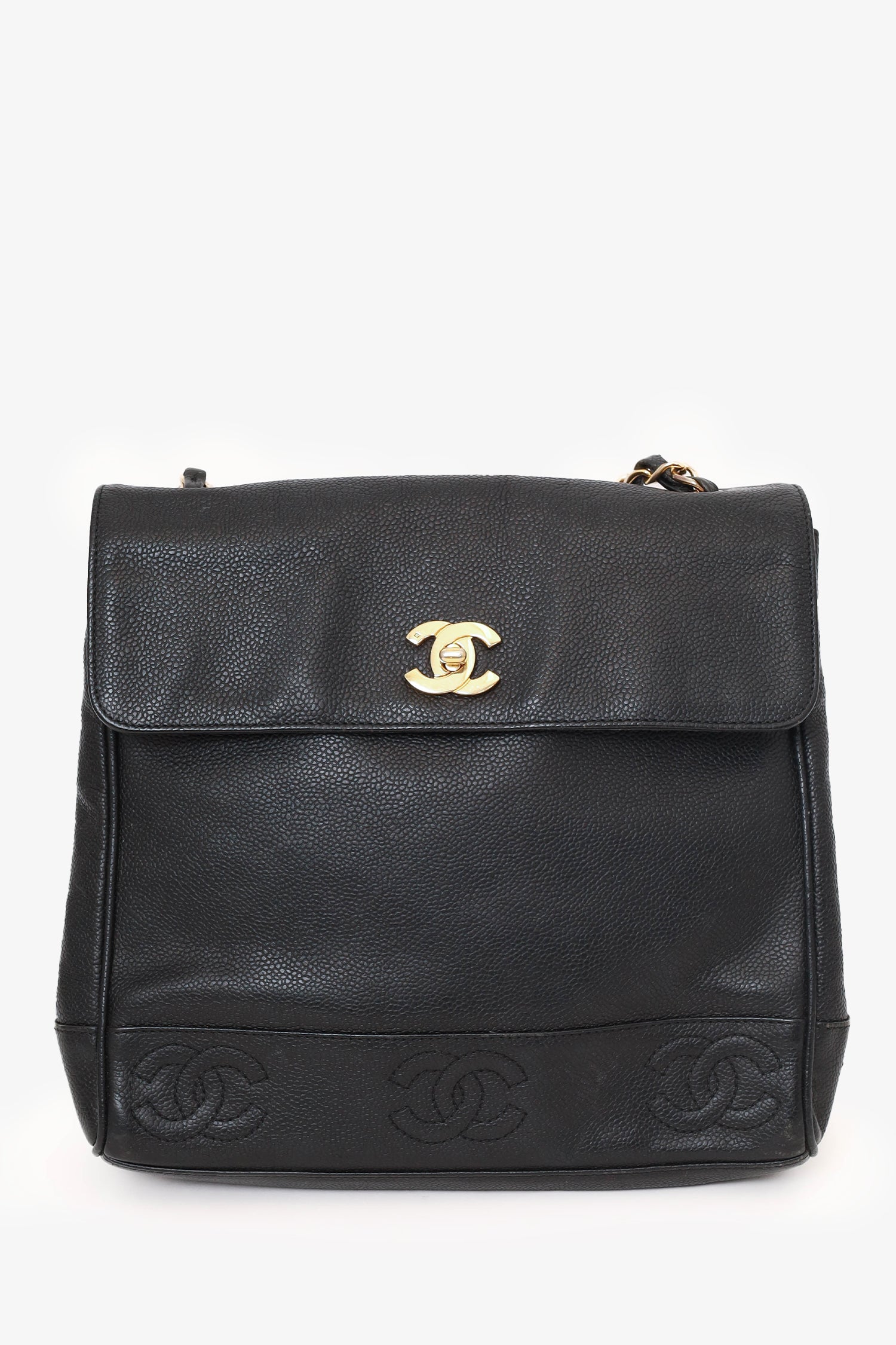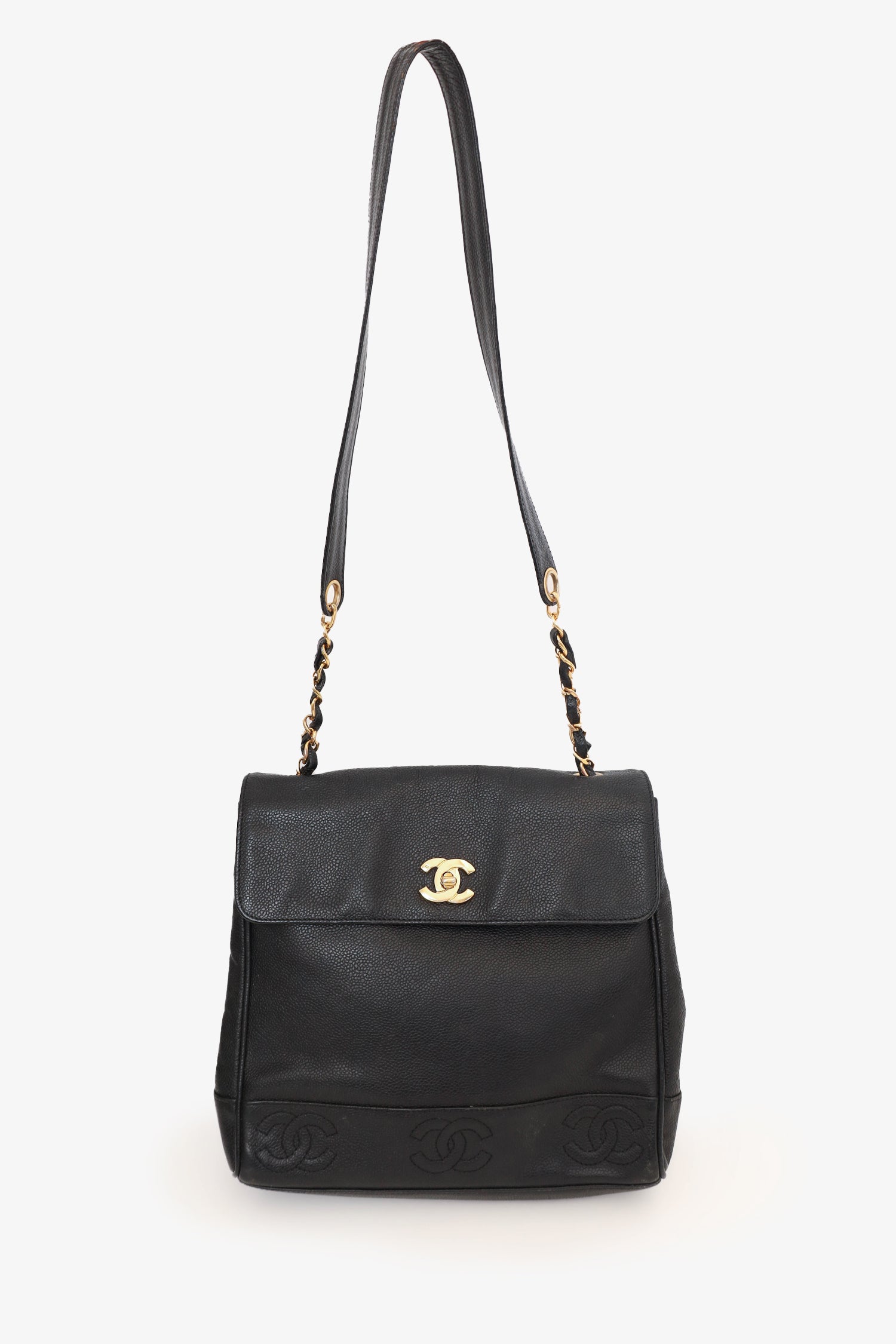 Refresh availabilityPre-Loved Chanel™ 1996-97 Black Caviar Leather Triple CC Shoulder Bag. Front fold-over flap with turn-lock closure. Chain shoulder strap. Exterior rear slip pocket. Open interior with 2 wall zip closure pockets. Gold-tone hardware. Tonal stitching.