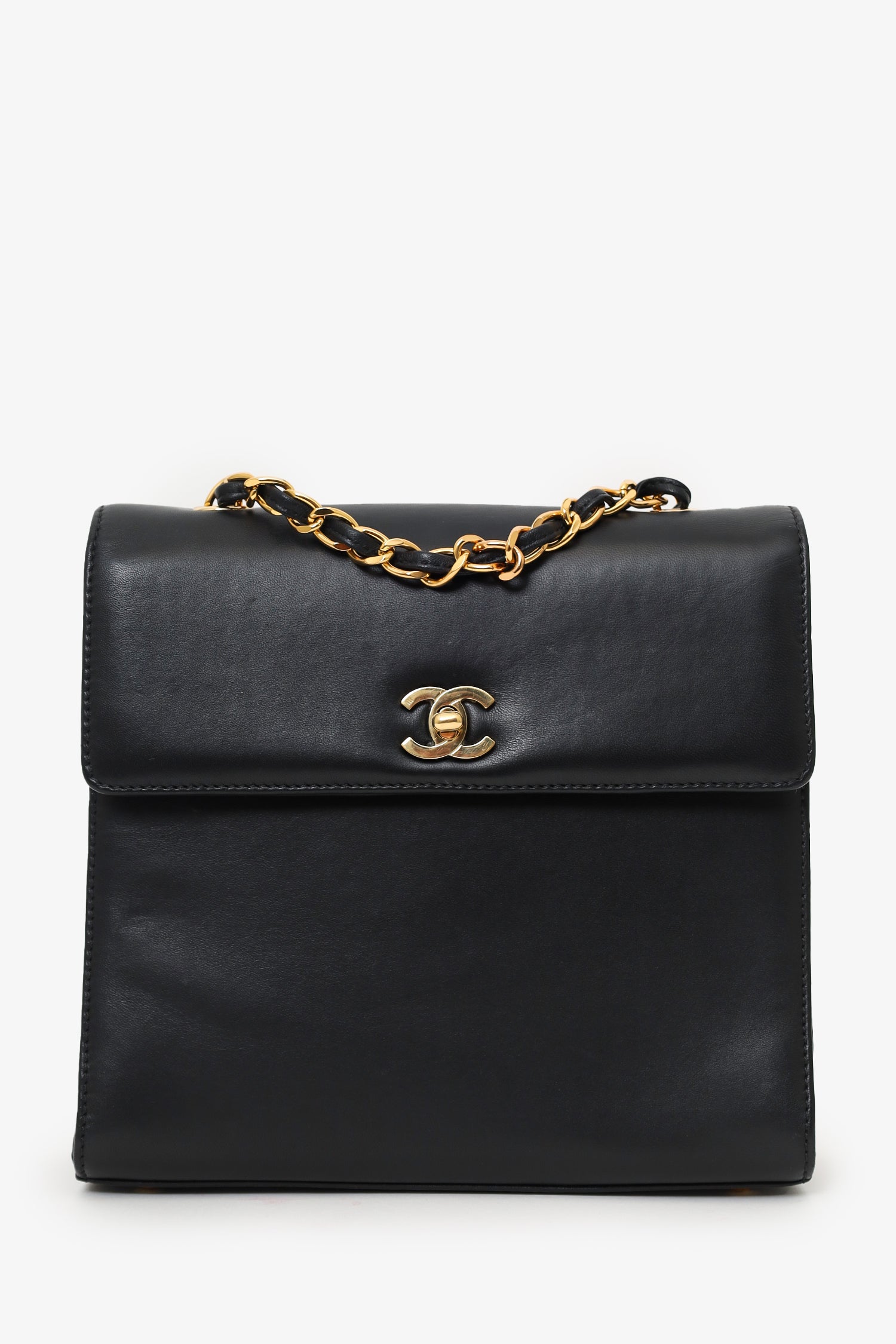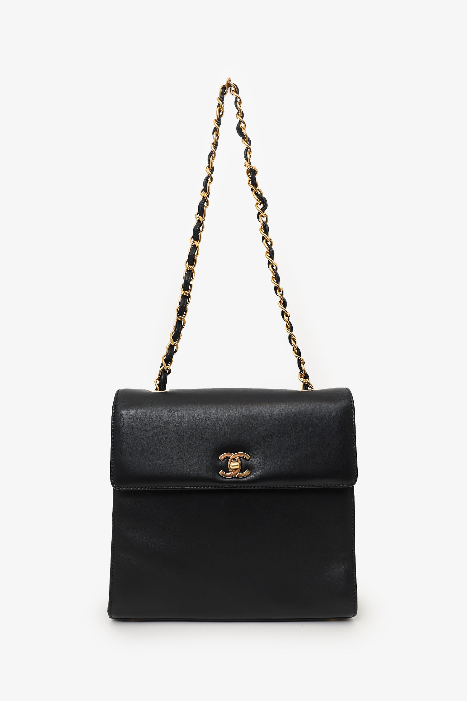 Refresh availabilityPre-Loved Chanel™ 1997-99 Black Leather Straight Flap Shoulder Bag. Front fold-over flap with turn-lock closure. Chainlink shoulder strap. Protective studs on bottom. Rear exterior slip pocket. Lined interior. 2 interior zip pockets. Gold-tone hardware. Tonal stitching.