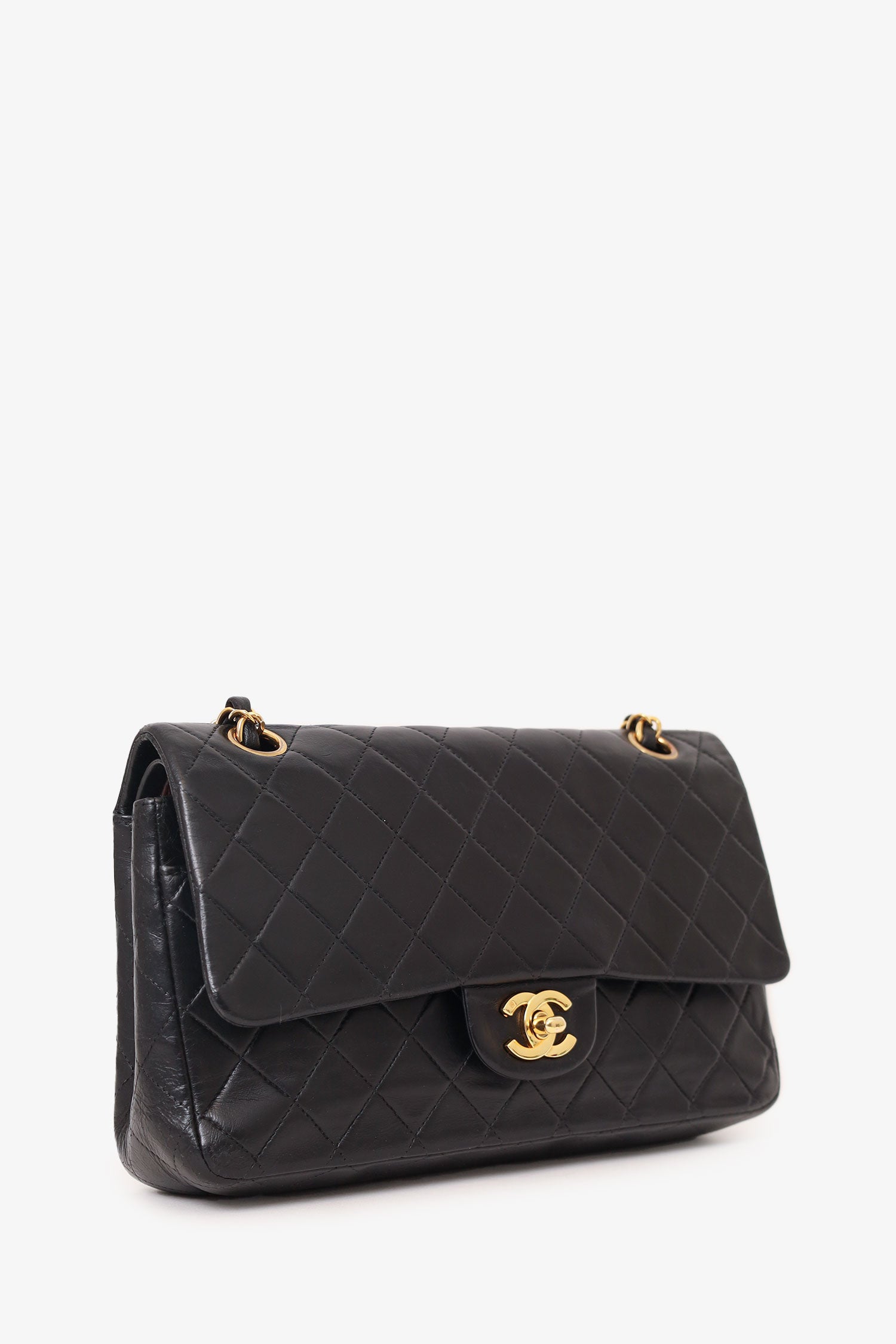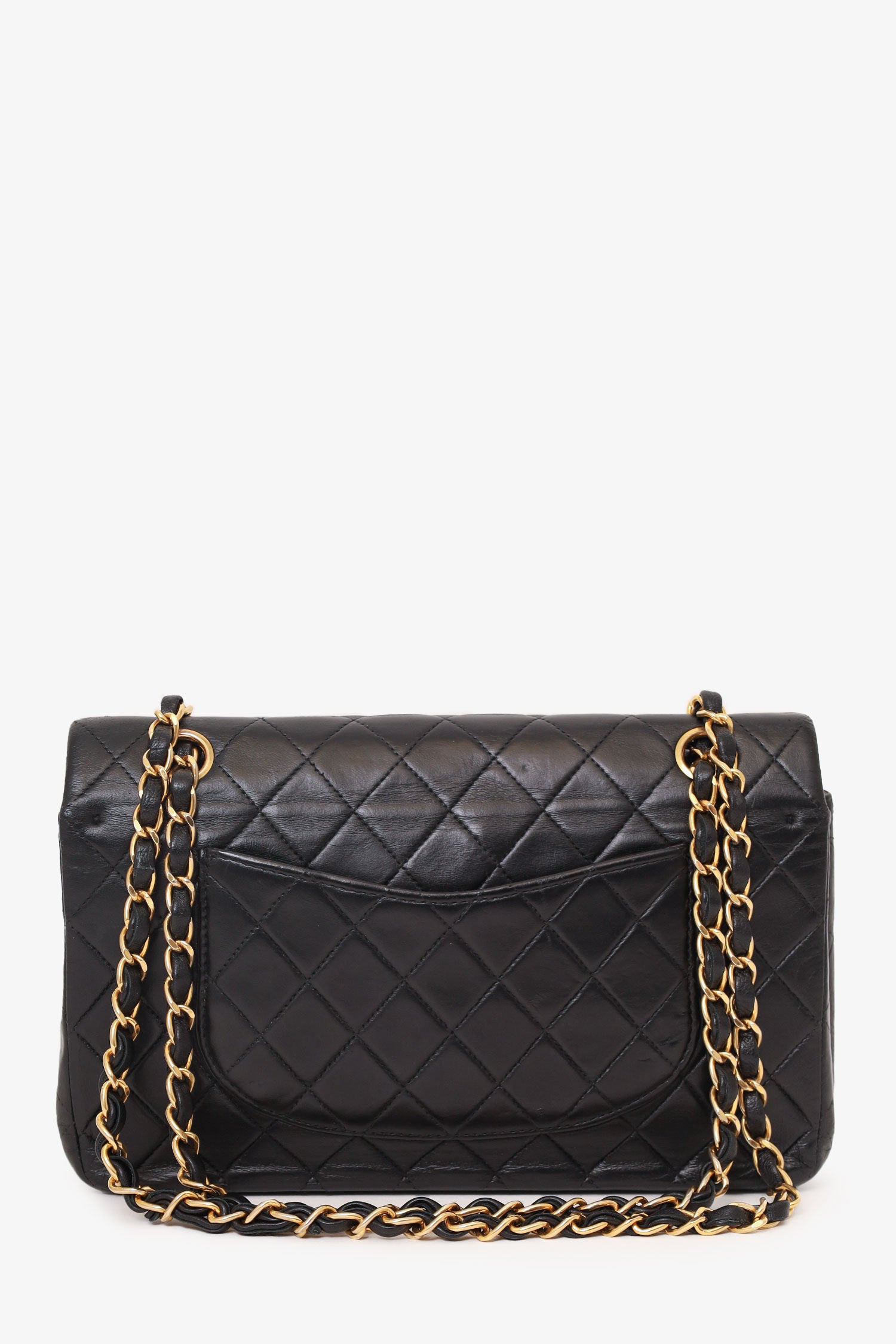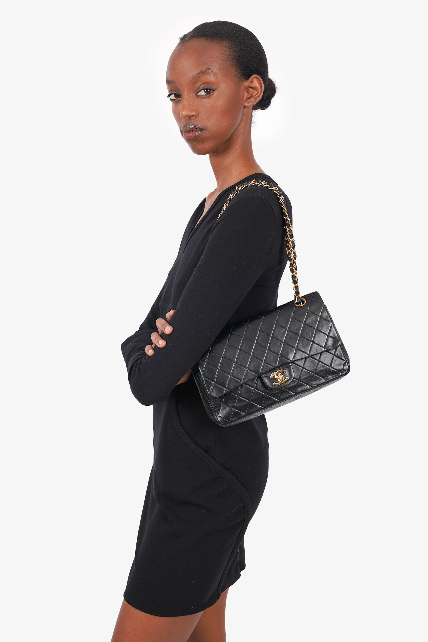 Pre-Loved Chanel™ 1997-99 Black Quilted Lambskin Medium Double Flap Bag.Top double fold-over flap with turn-lock and snap button closure. Double chain shoulder strap. Single rear slip pocket. Zip closure pocket on outer flap. Single front interior slip pocket. Interior main compartment with 2 slip pockets and 1 pen compartment. Rear interior slip compartment. Gold-tone hardware. Tonal stitching.