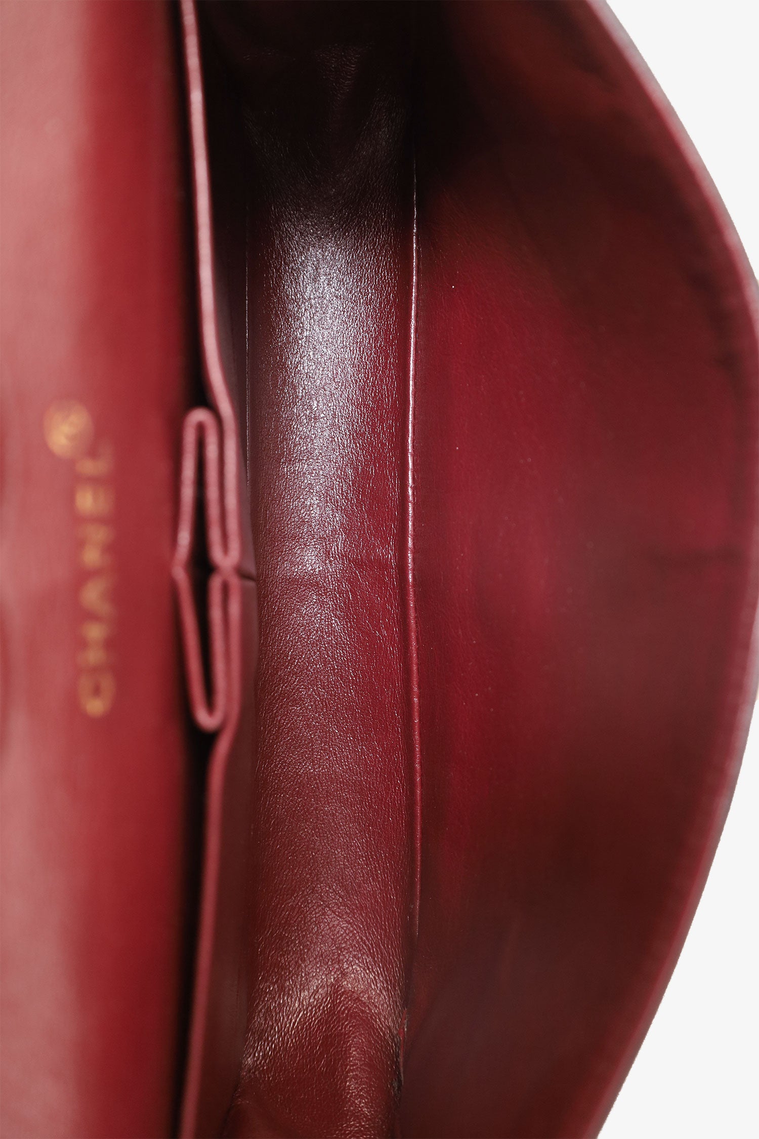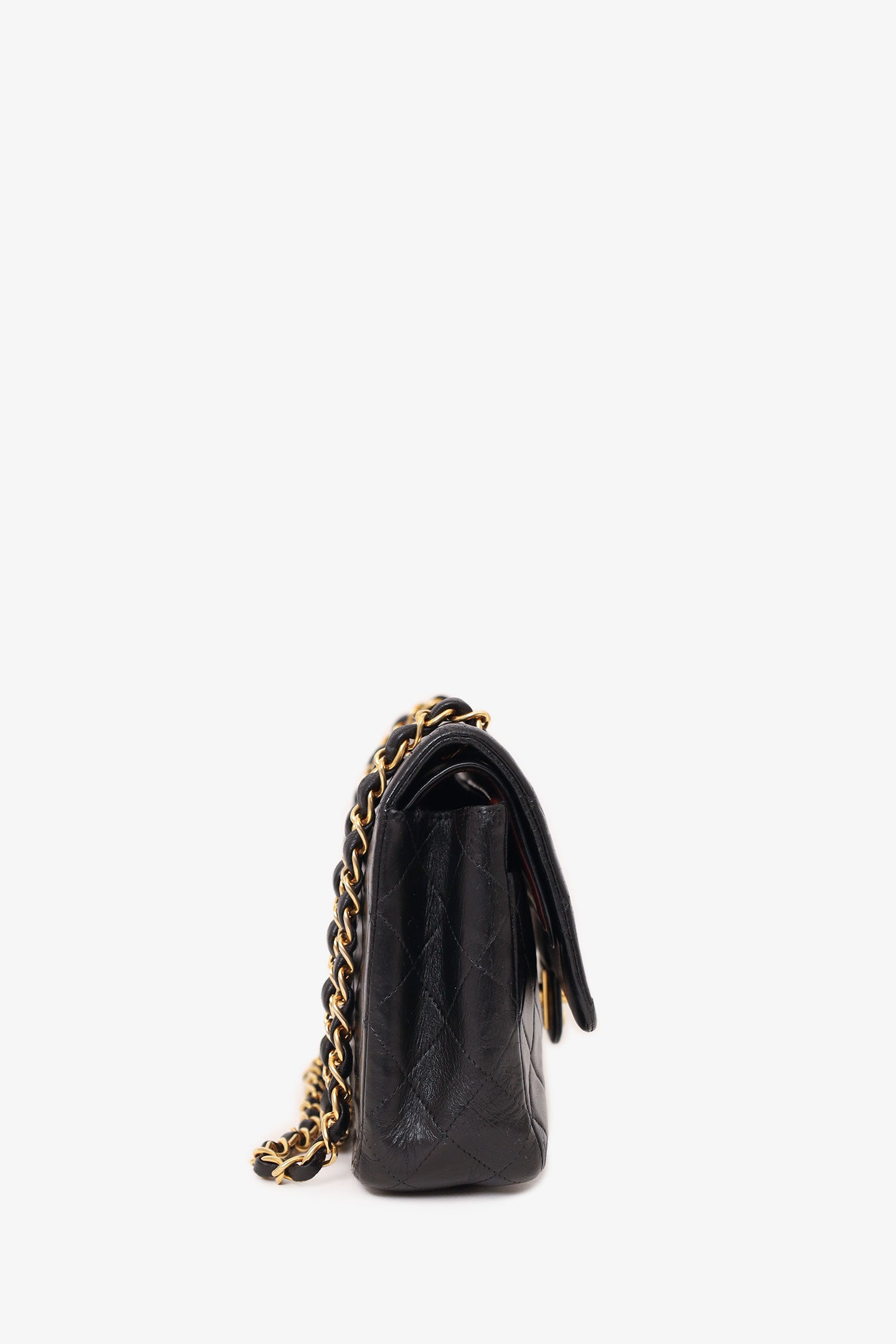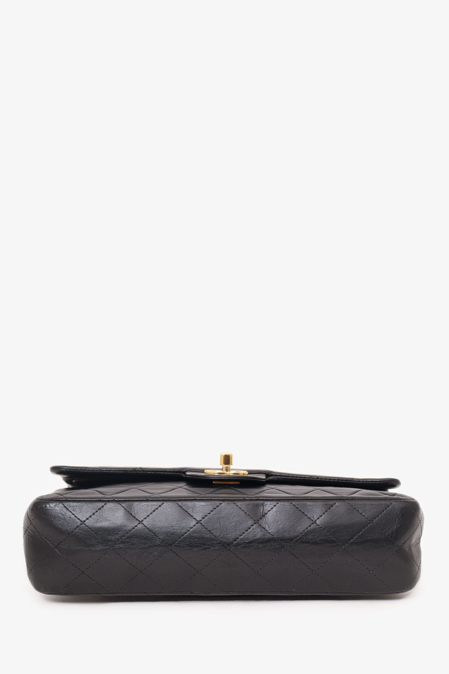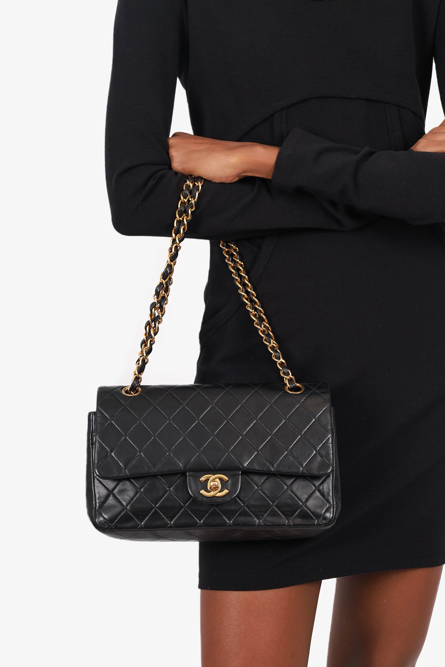 Pre-Loved Chanel™ 1997-99 Black Quilted Lambskin Medium Double Flap Bag.Top double fold-over flap with turn-lock and snap button closure. Double chain shoulder strap. Single rear slip pocket. Zip closure pocket on outer flap. Single front interior slip pocket. Interior main compartment with 2 slip pockets and 1 pen compartment. Rear interior slip compartment. Gold-tone hardware. Tonal stitching.
