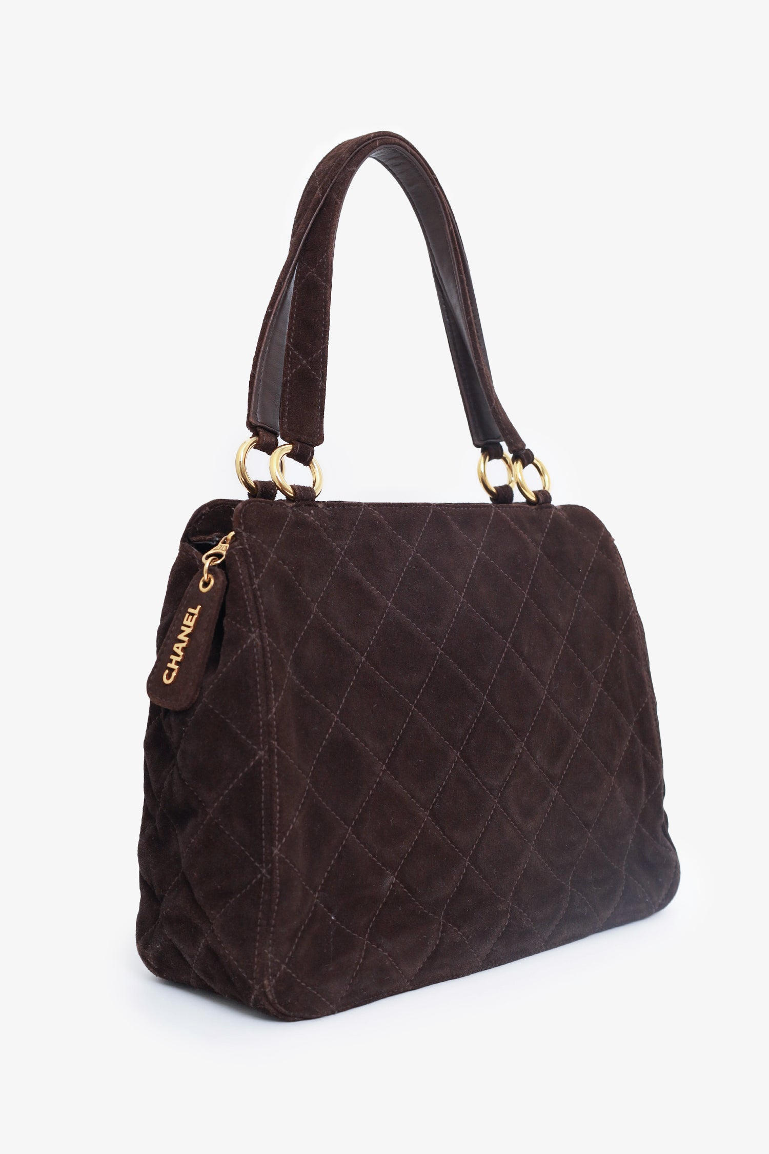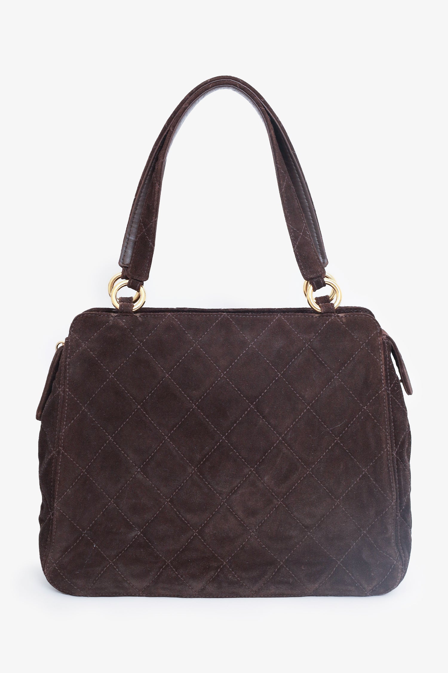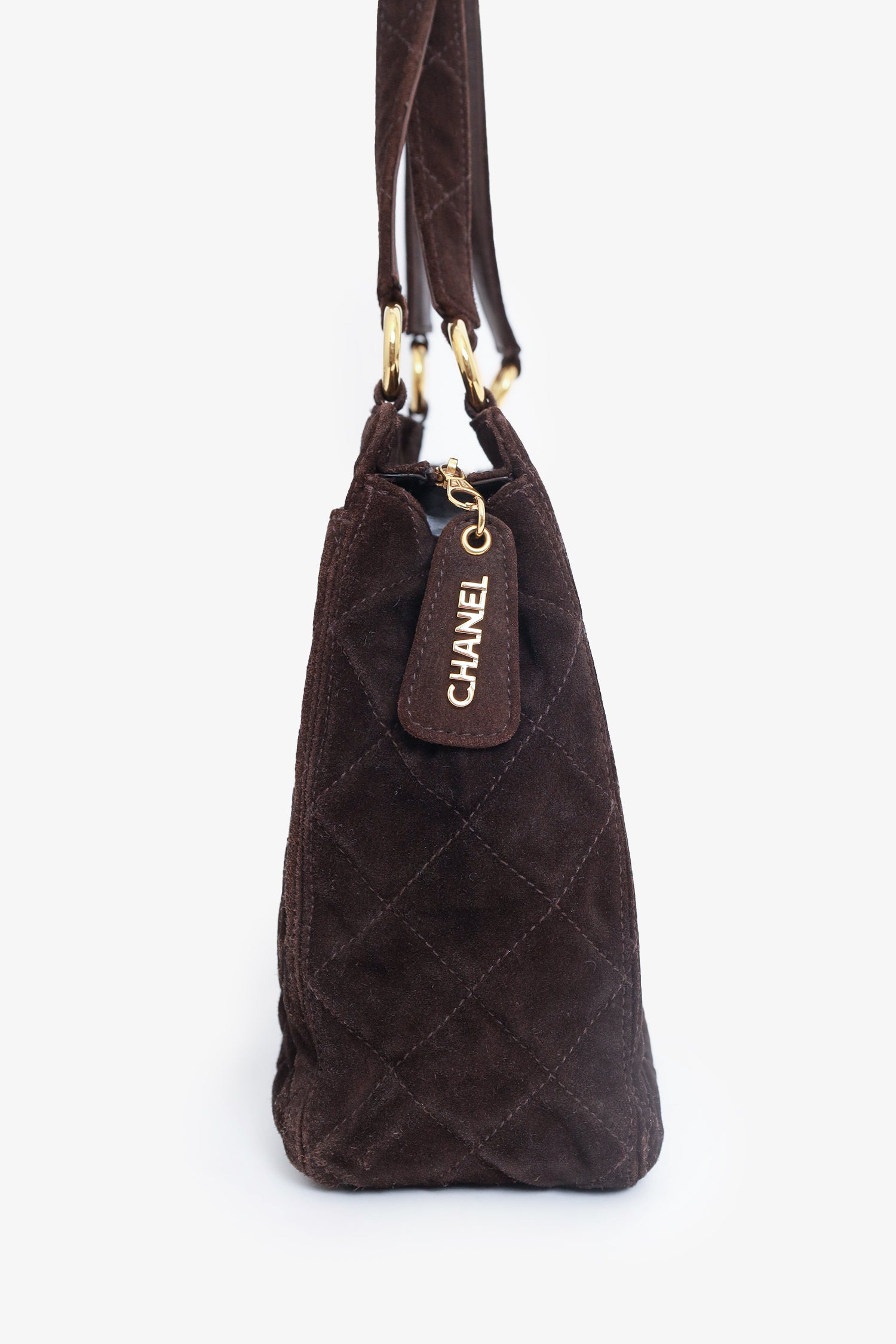 Refresh availabilityPre-Loved Chanel™ 1997-99 Brown Suede Quilted Mini Tote. Top zip closure. 2 interior wall pockets; 1 slip and 1 with zip closure. Exterior slip pocket. Gold tone hardware. Tonal stitching.
