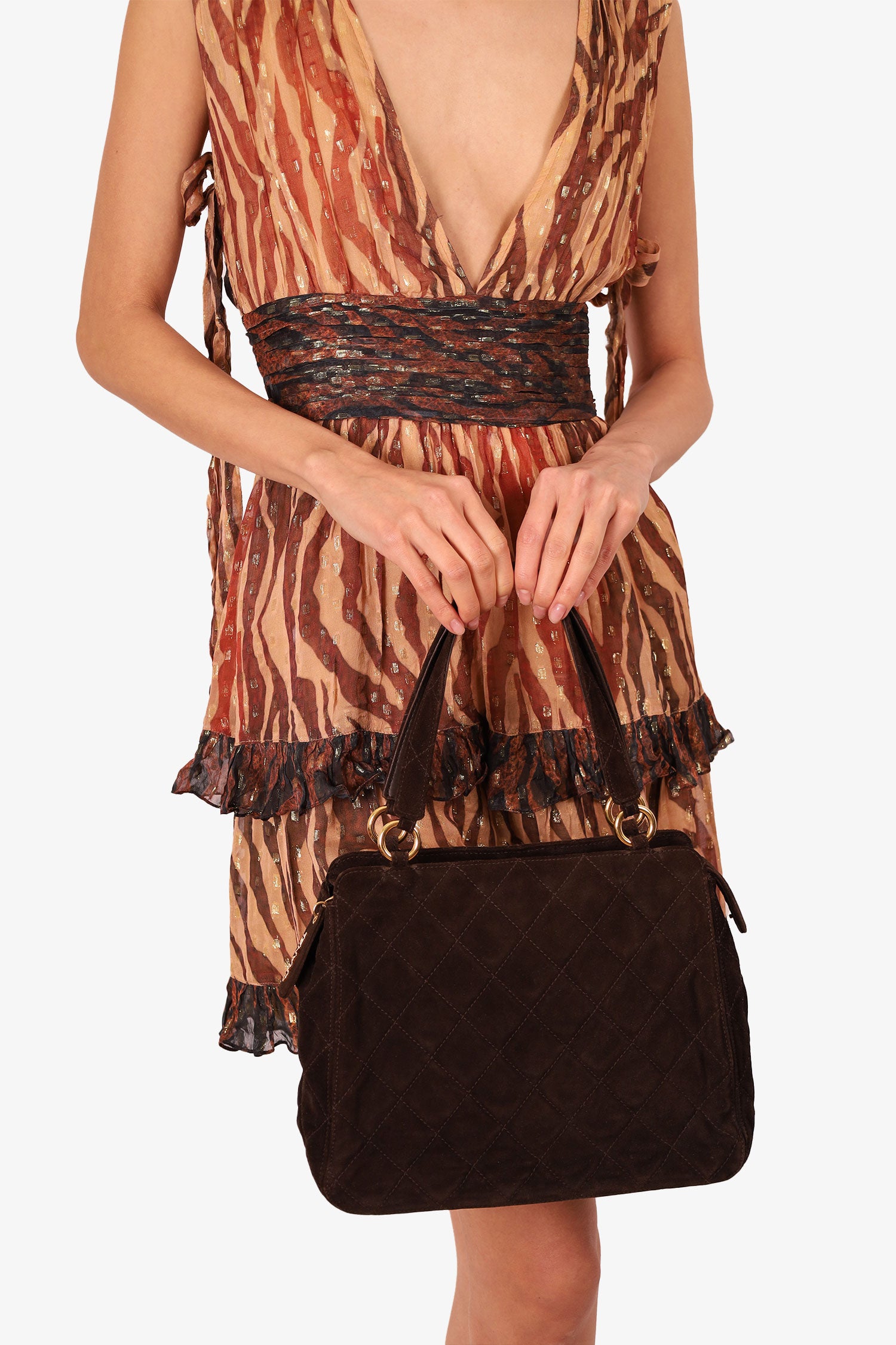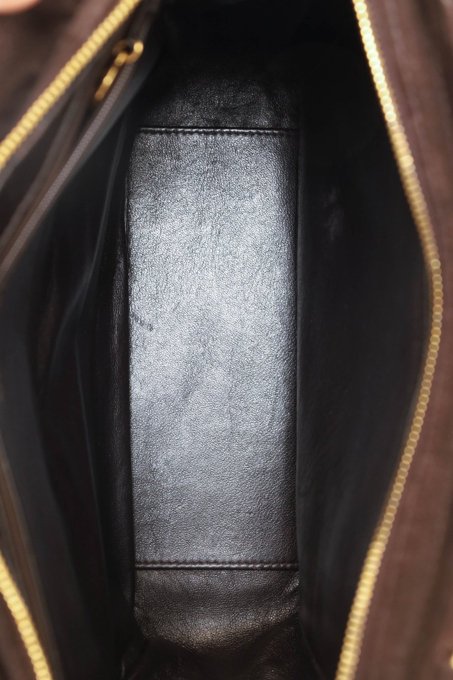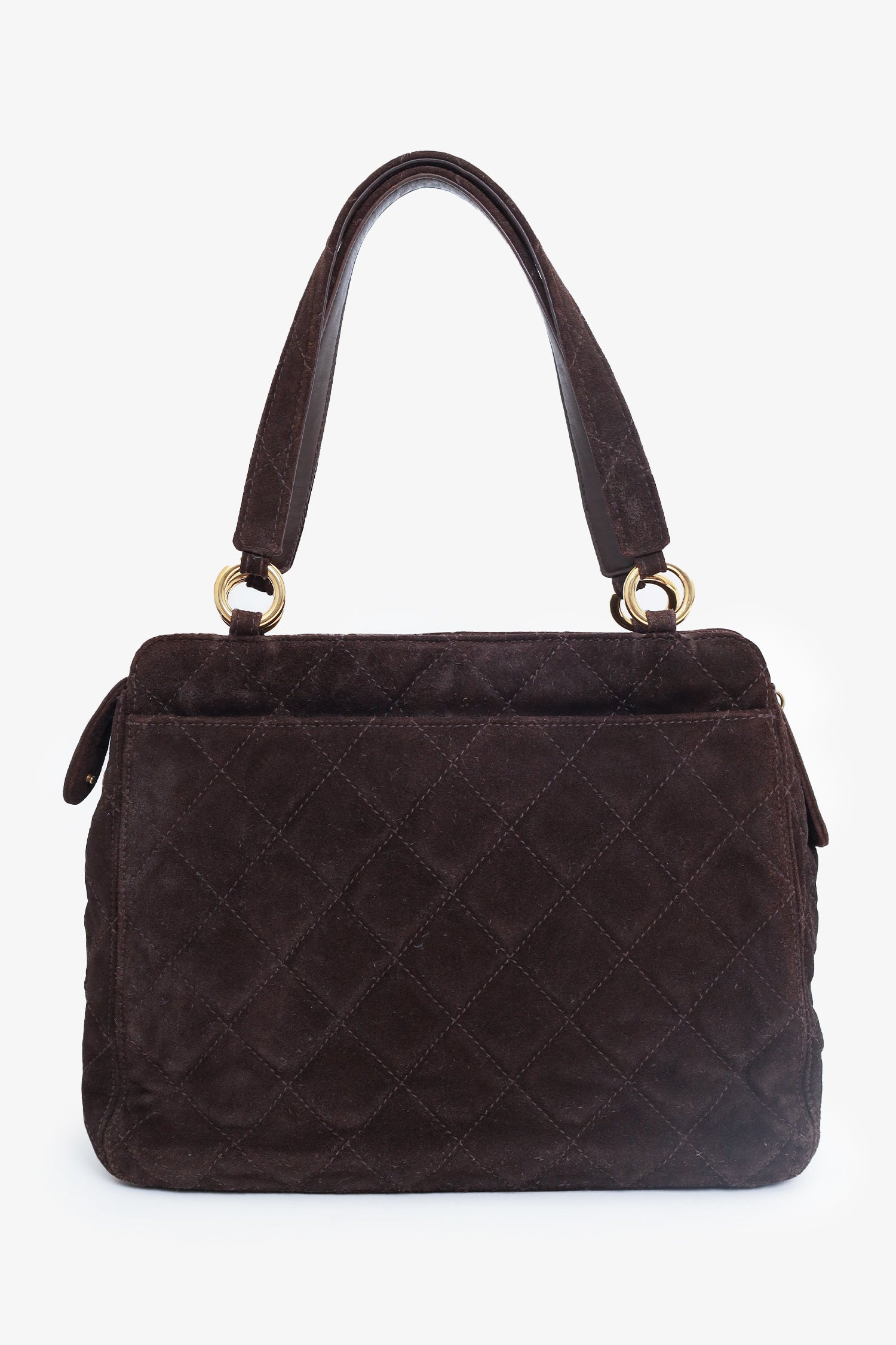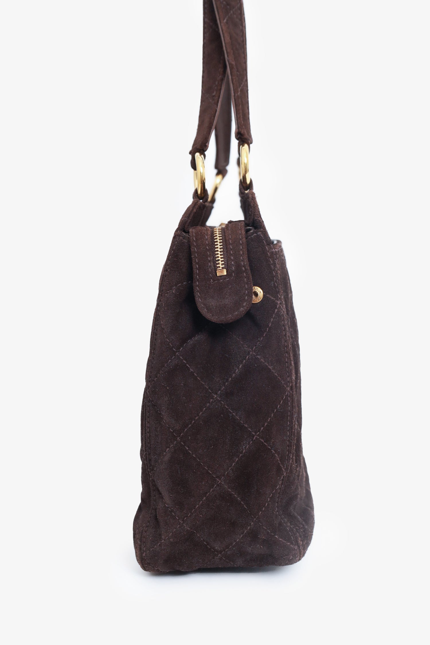 Refresh availabilityPre-Loved Chanel™ 1997-99 Brown Suede Quilted Mini Tote. Top zip closure. 2 interior wall pockets; 1 slip and 1 with zip closure. Exterior slip pocket. Gold tone hardware. Tonal stitching.