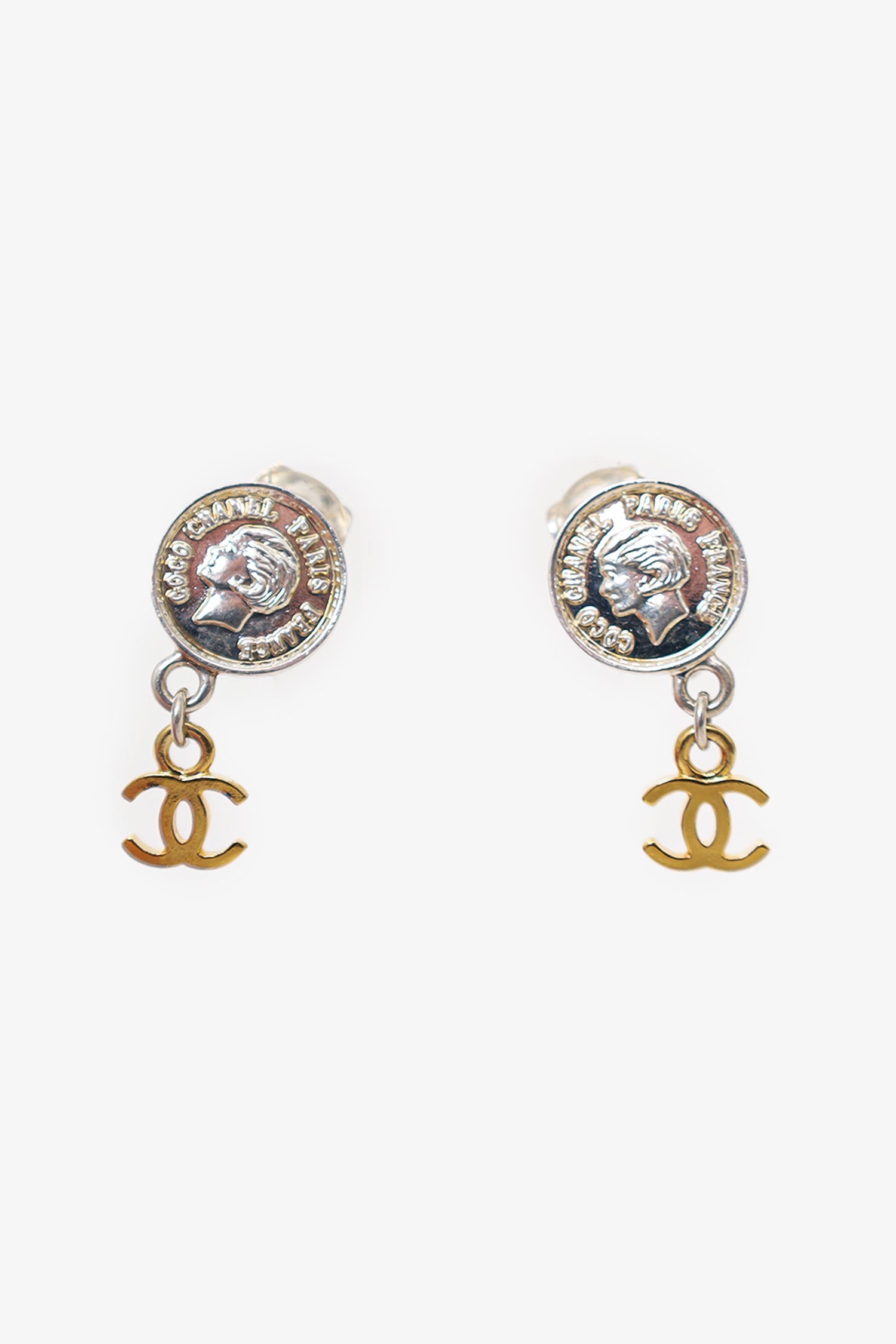 Refresh availabilityPre-Loved Chanel™ 1997 Gold/Silver Tone Mademoiselle Coin CC Dangle Clip-on Earrings. Rear clip on closure with rubber padding. Silver and gold-tone hardware.
