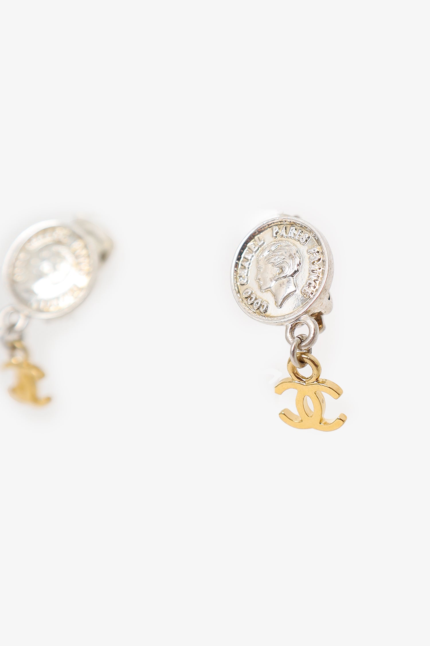 Pre-Loved Chanel™ 1997 Gold/Silver Tone Mademoiselle Coin CC Dangle Clip-on Earrings