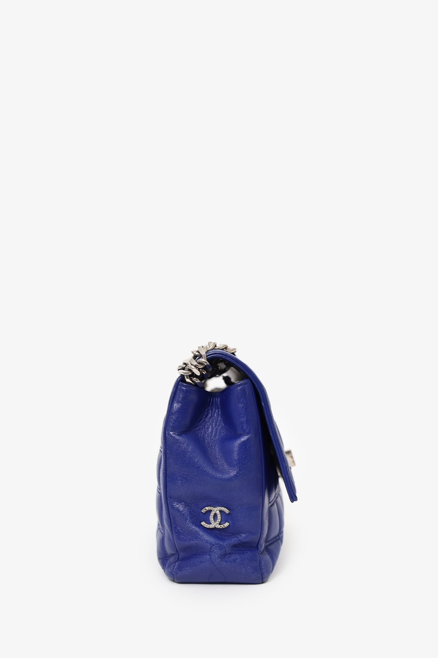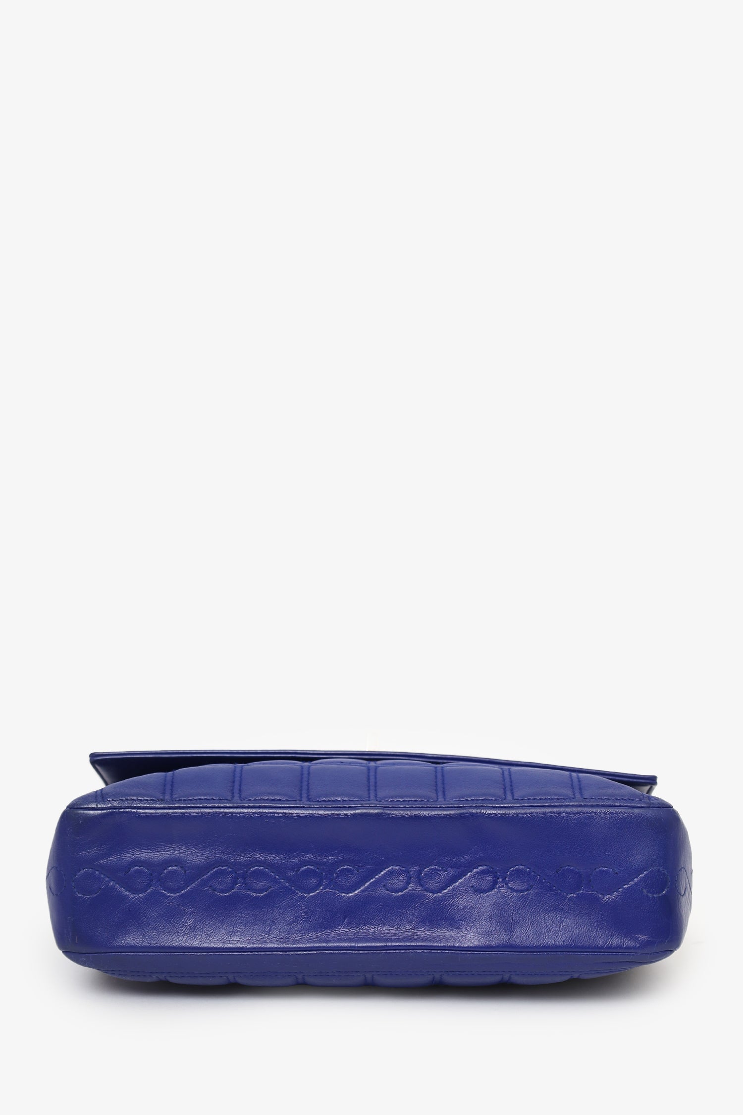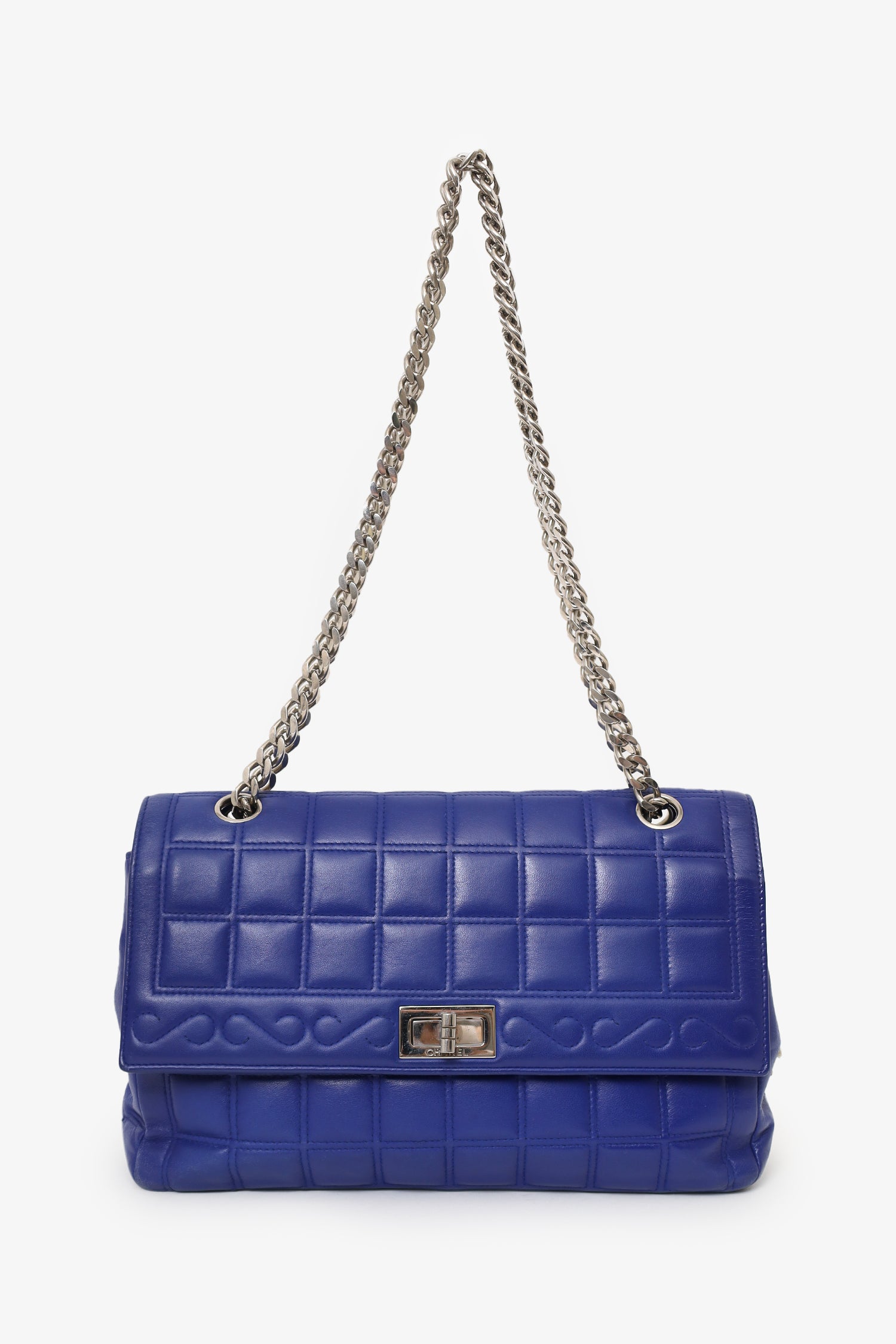 Refresh availabilityPre-Loved Chanel™ 2000-02 Blue Chocolate Bar Mademoiselle 255 Reissue Flap Bag. Front fold-over flap with turn-lock closure. Twin chainlink straps that can be pulled into one long strap. Leather-lined interior. 2 interior pockets; 1 slip and 1 zip. Silver-tone hardware. Tonal stitching.