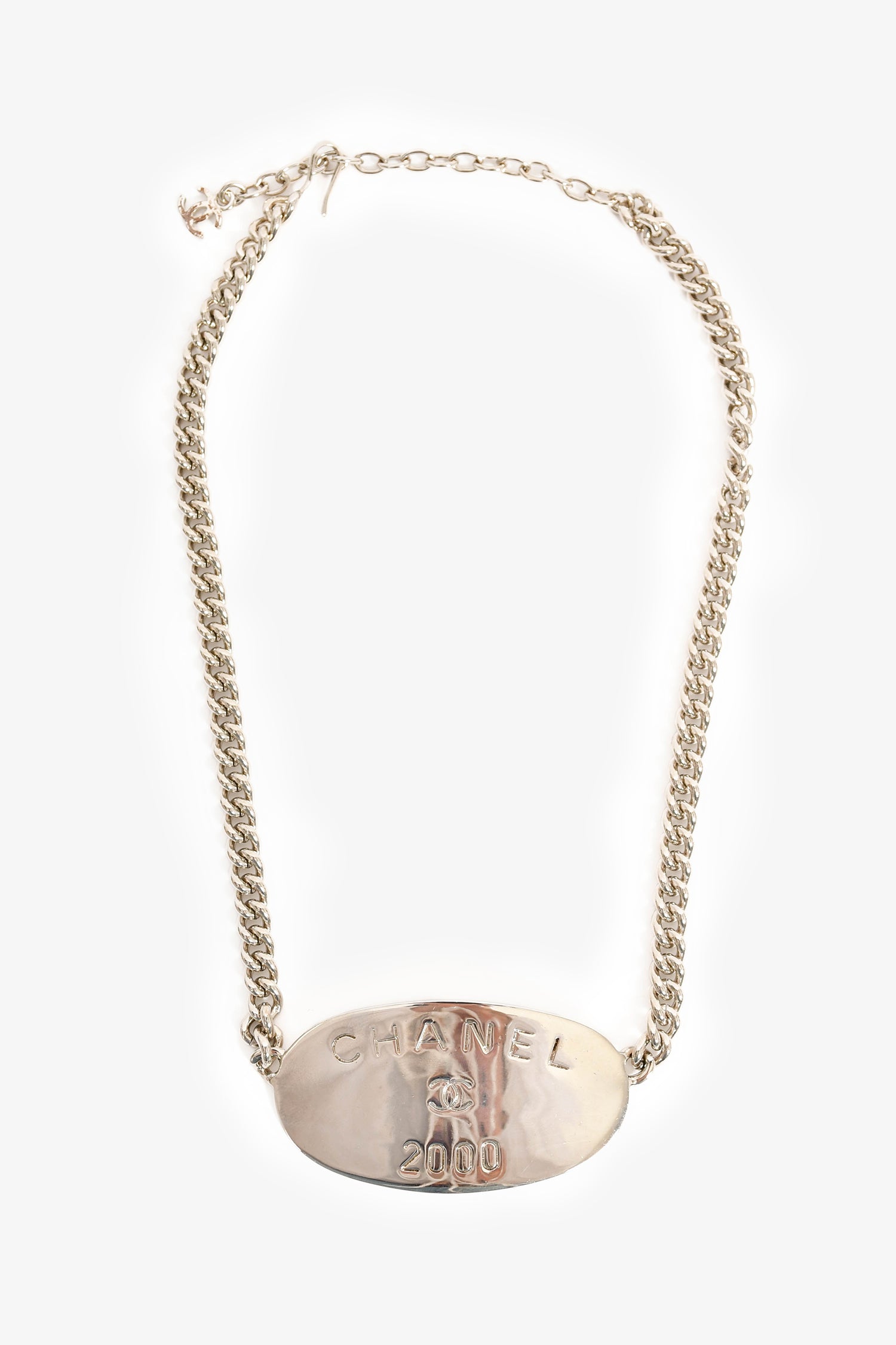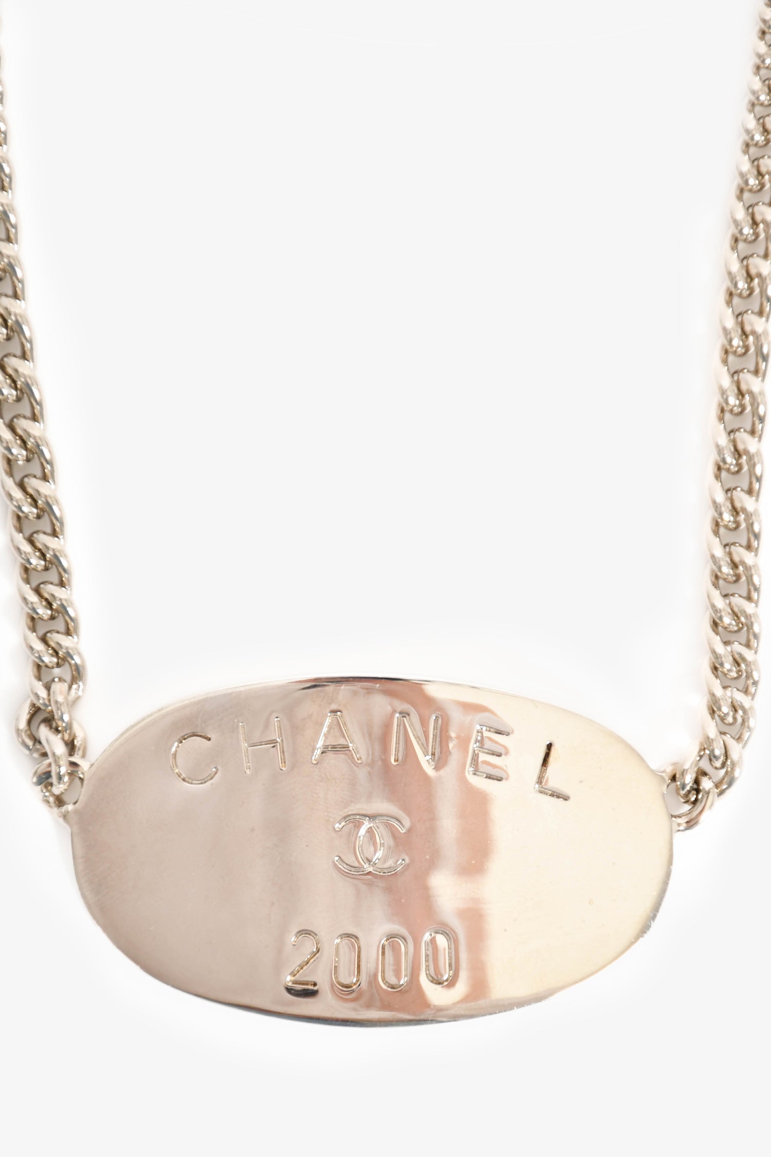 Refresh availabilityPre-Loved Chanel™ 2000 Silver Tone Plaque Choker Necklace. Rounded plaque with front logo engraving. Hook closure. Silver-tone hardware.