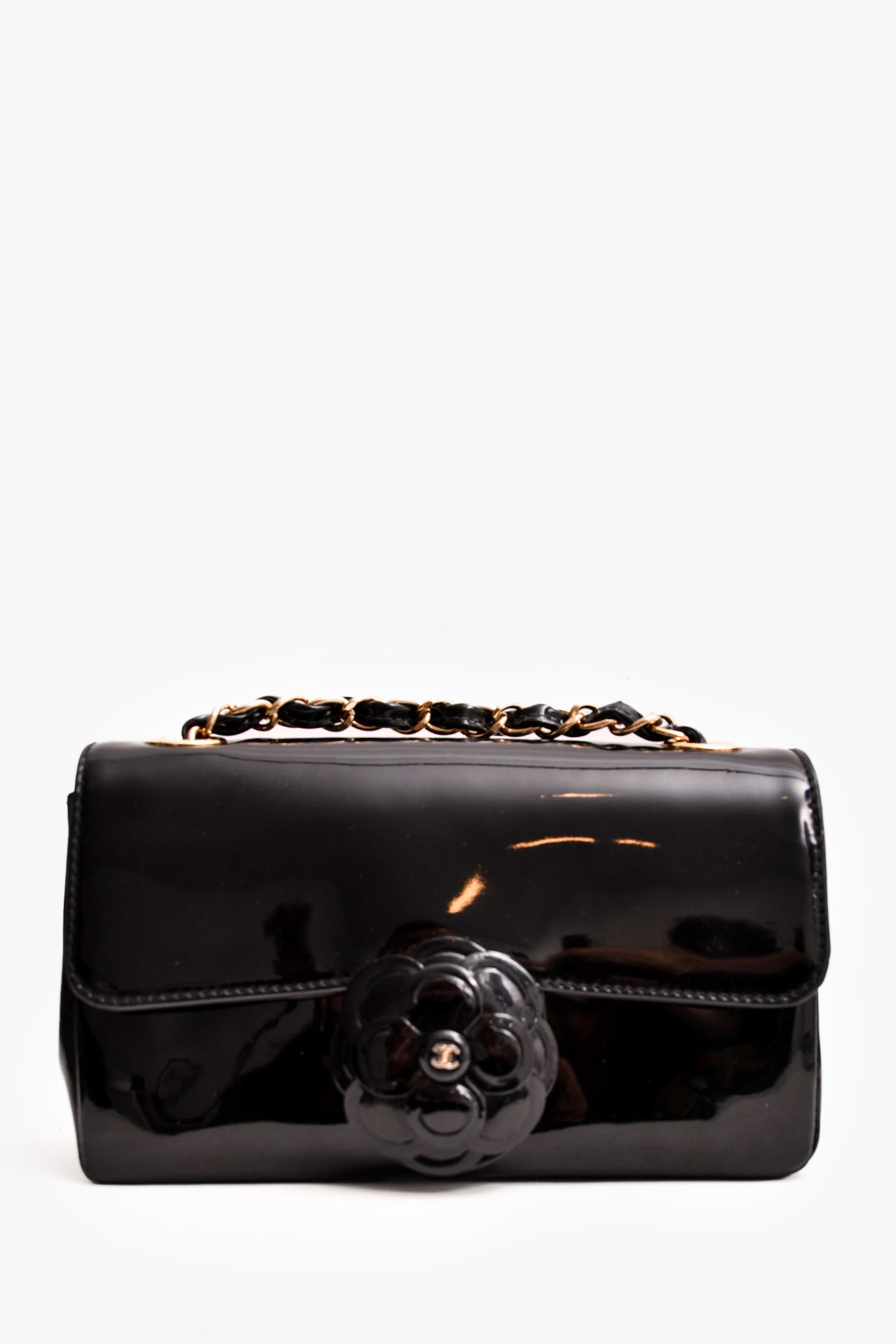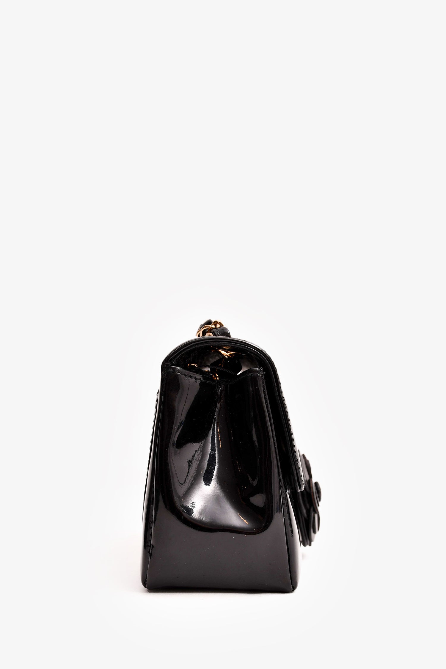 Pre-Loved Chanel™ 2002/03 Black Patent Mini Camellia Flap Crossbody. Tonal stitching. Lacquered patent. Fold-over flap. Snap closure. Gold-tone hardware. Chain-link crossbody strap with leather detail. Single interior compartment.