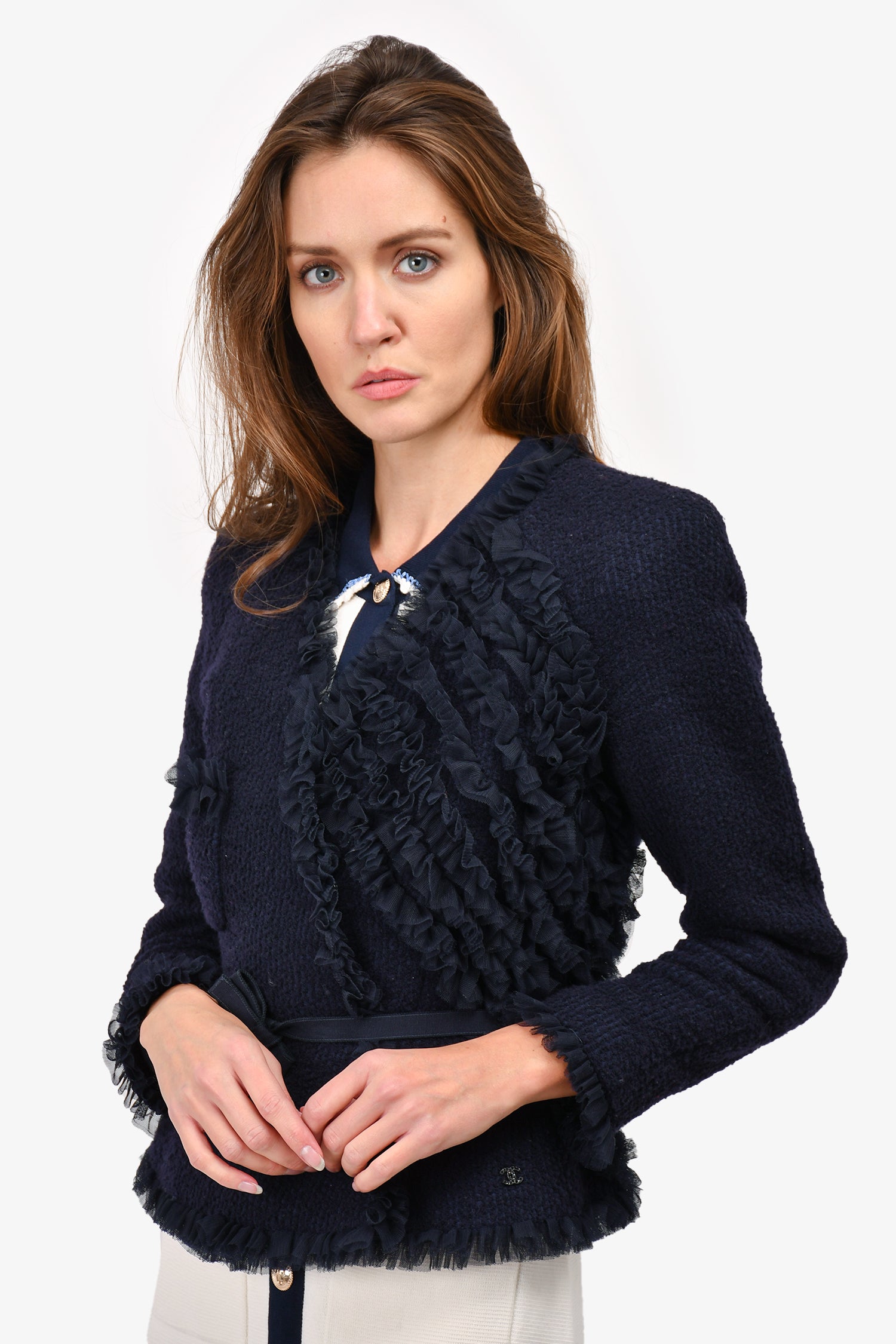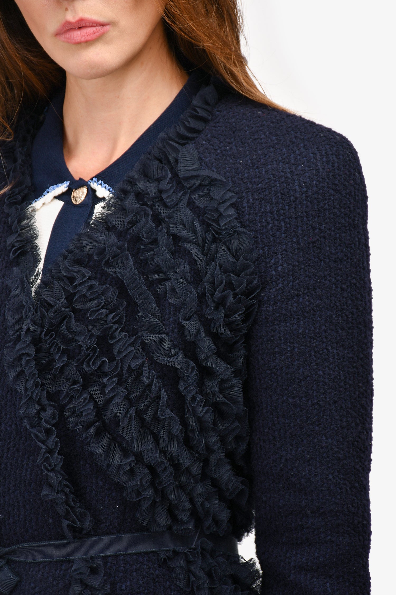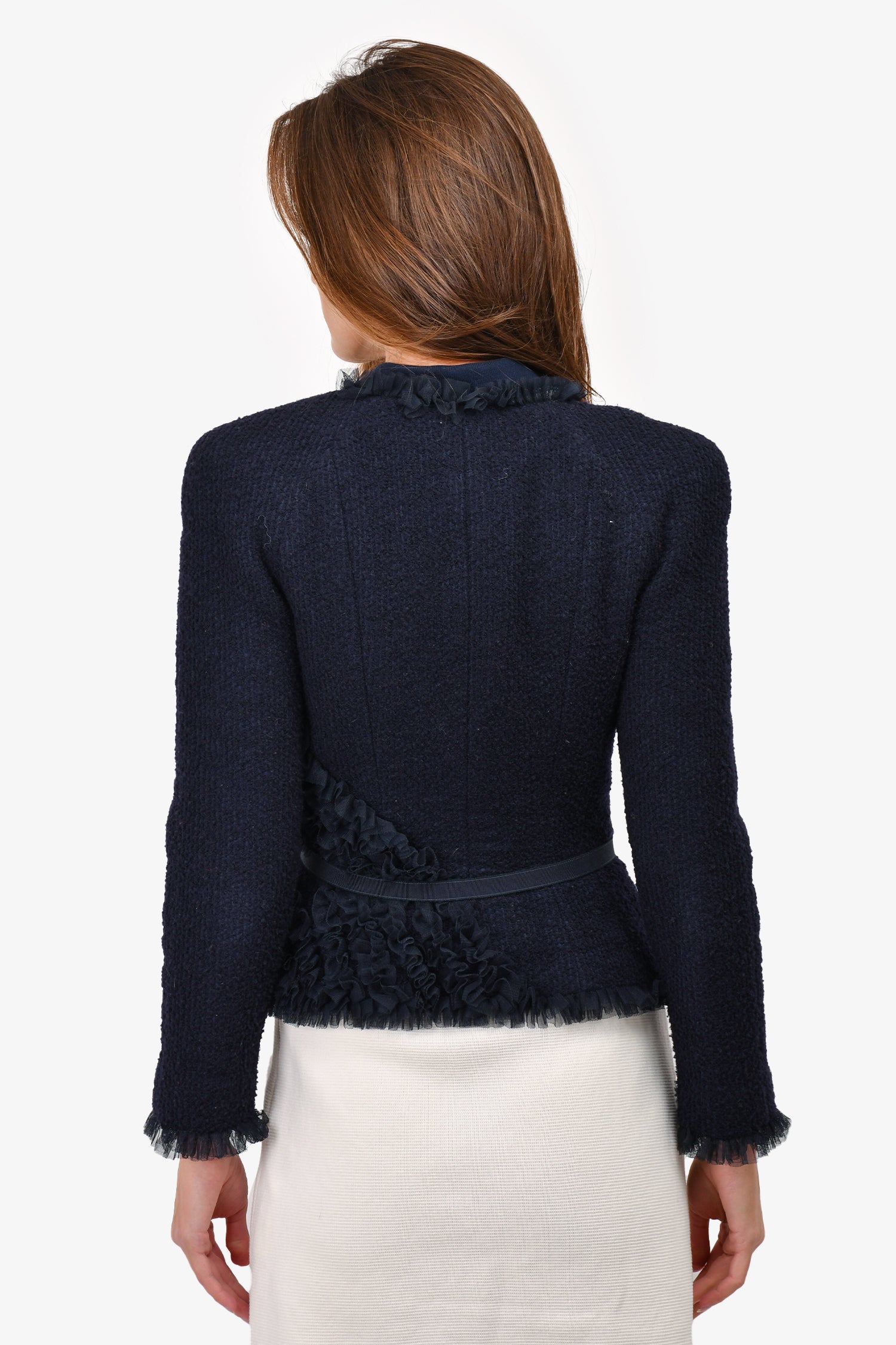 Pre-Loved Chanel™ 2002 Navy Wool Tulle Ruffle Detail Belted Jacket. Two front pocket. Front tie closure. Shoulder pads. Tonal stitching.