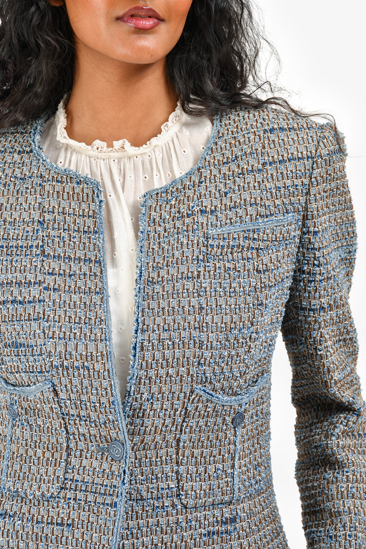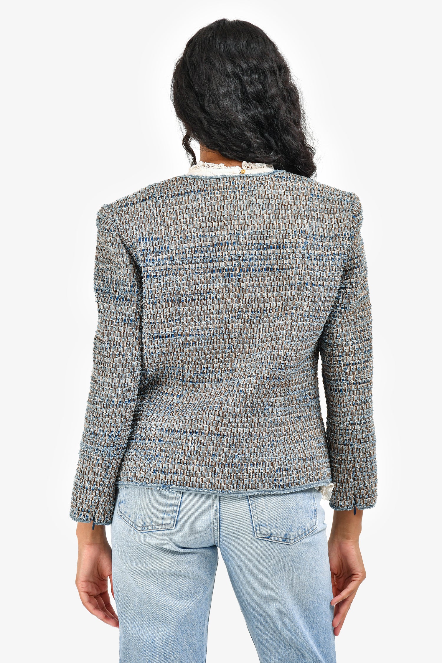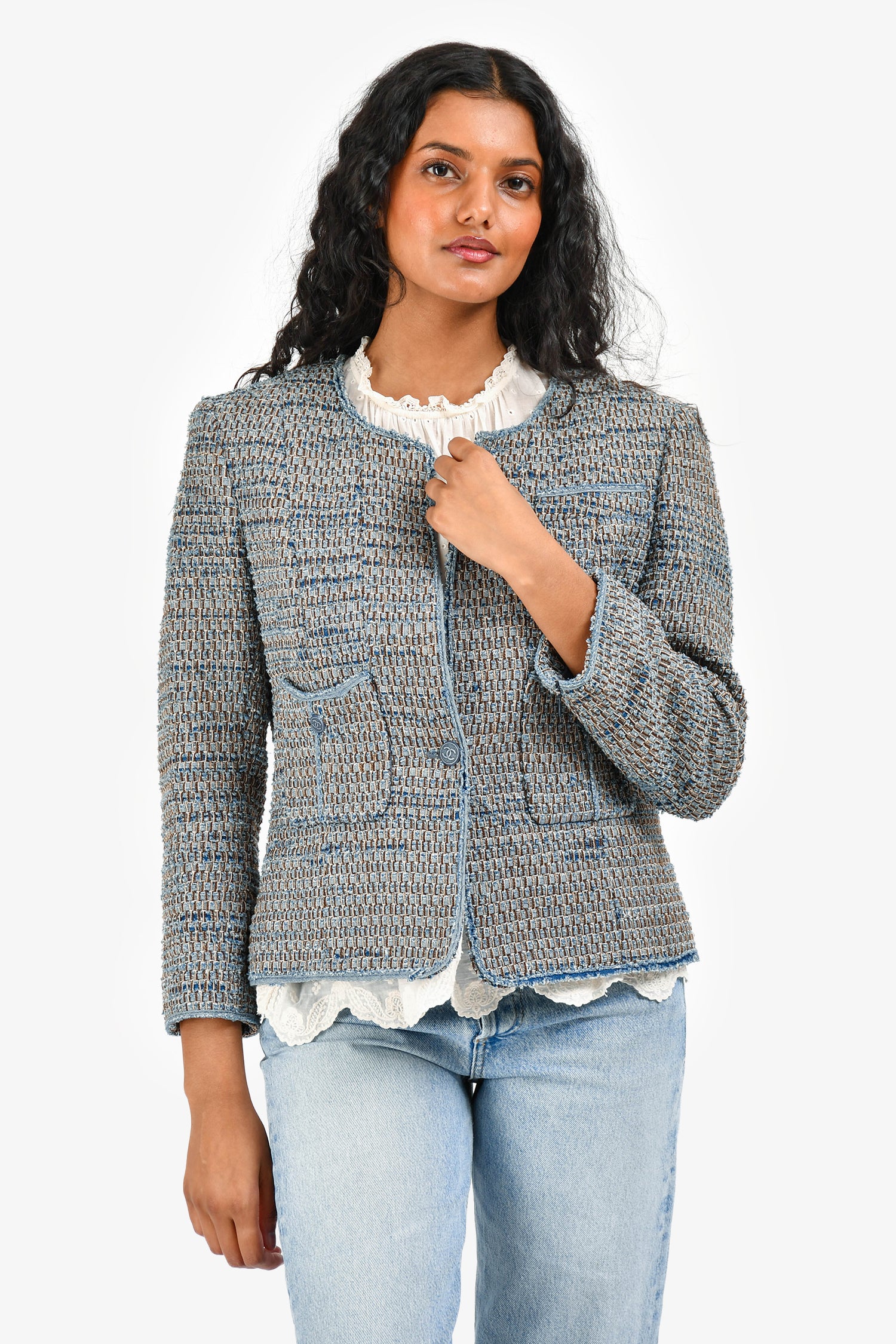 Pre-Loved Chanel™ 2003 Brown/Blue Tweed Metallic CC Blazer. Long sleeves. Front single button closure with CC logo. Two front slip pockets with button closure. Zipped cuffs. Fully lined. Tonal stitching.