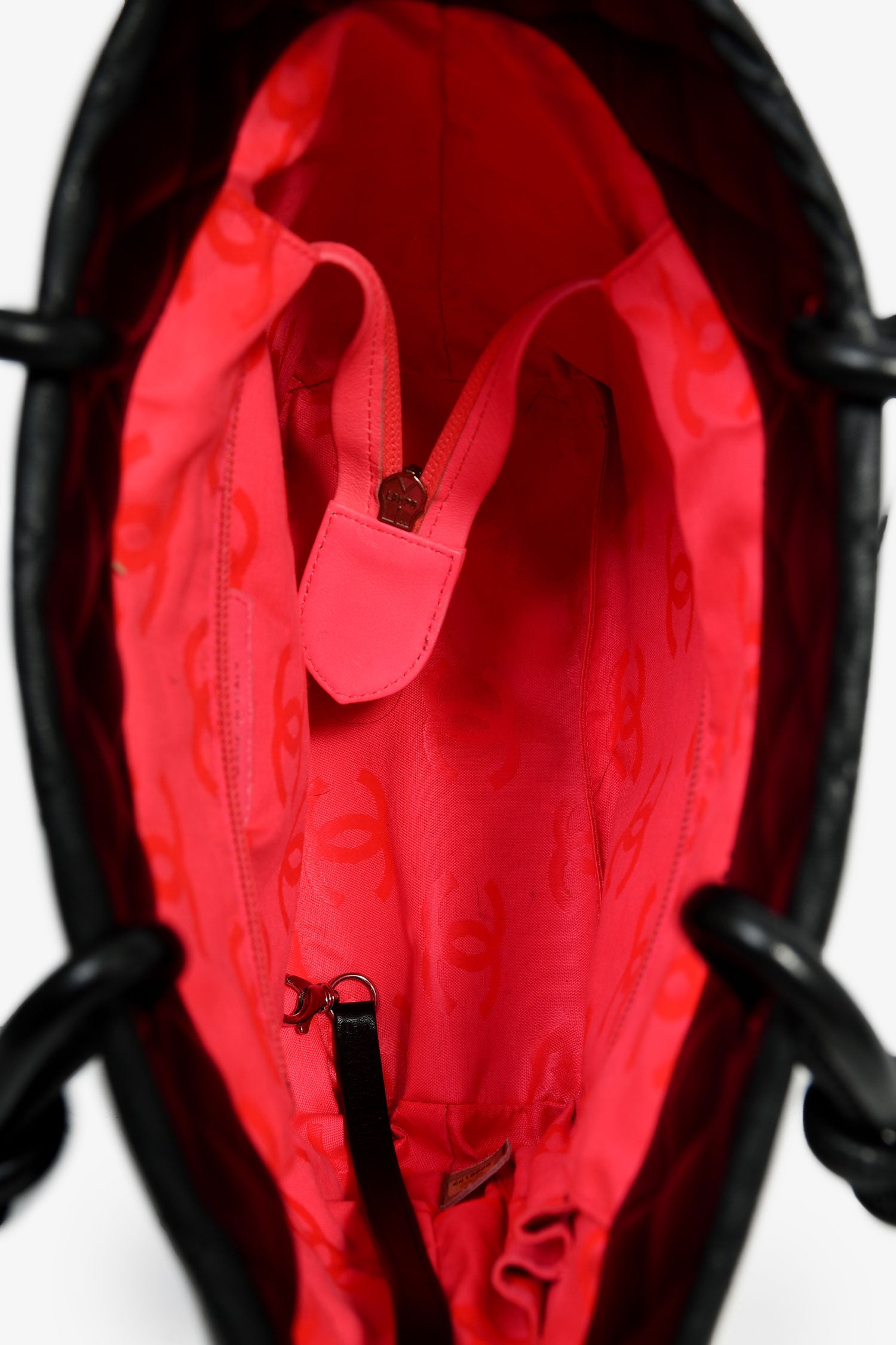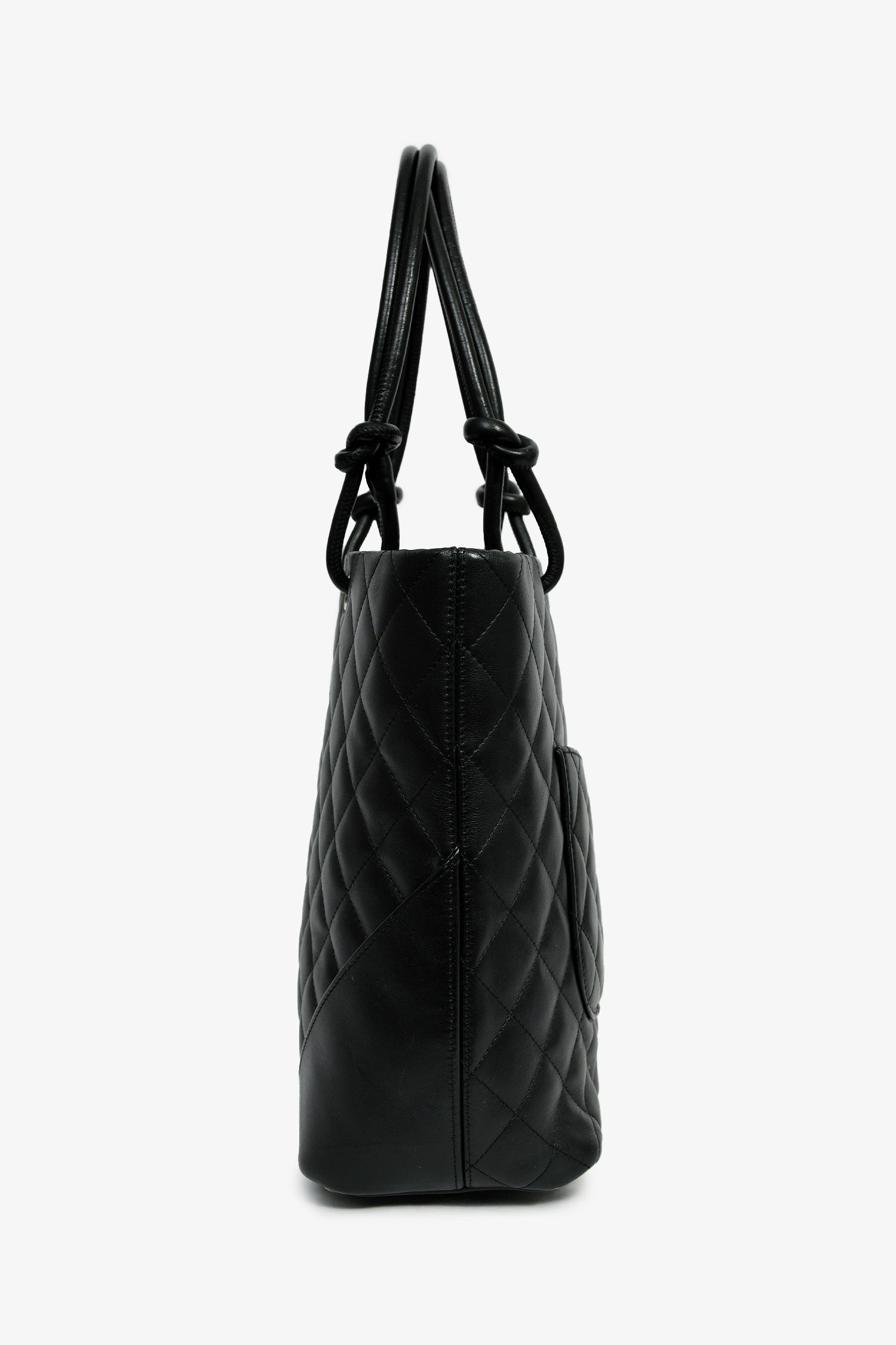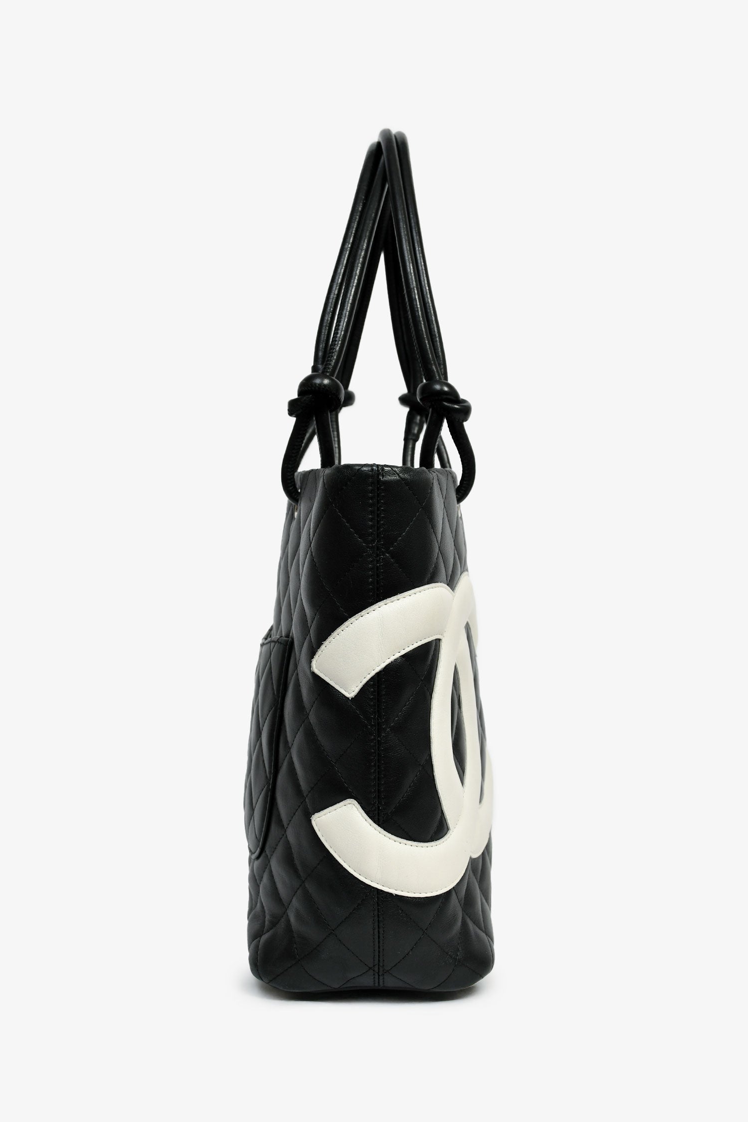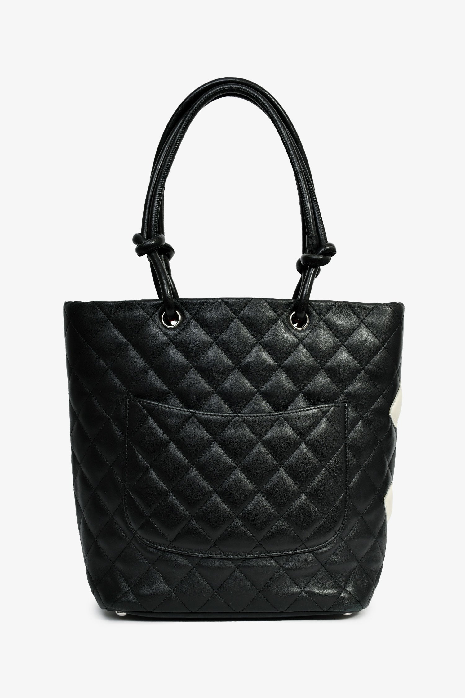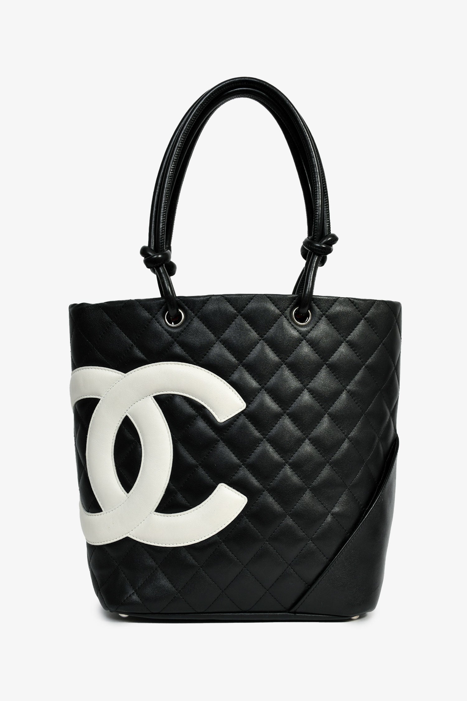Refresh availabilityPre-Loved Chanel™ 2003-04 Black/White Quilted Leather Small Ligne Cambon Bucket Tote. Dual handles. Top interior zip closure. Pink logo'd textile interior lining. Two interior wall zip pockets. Protective metal bottom. Silver-tone hardware. Exterior rear slip pocket.