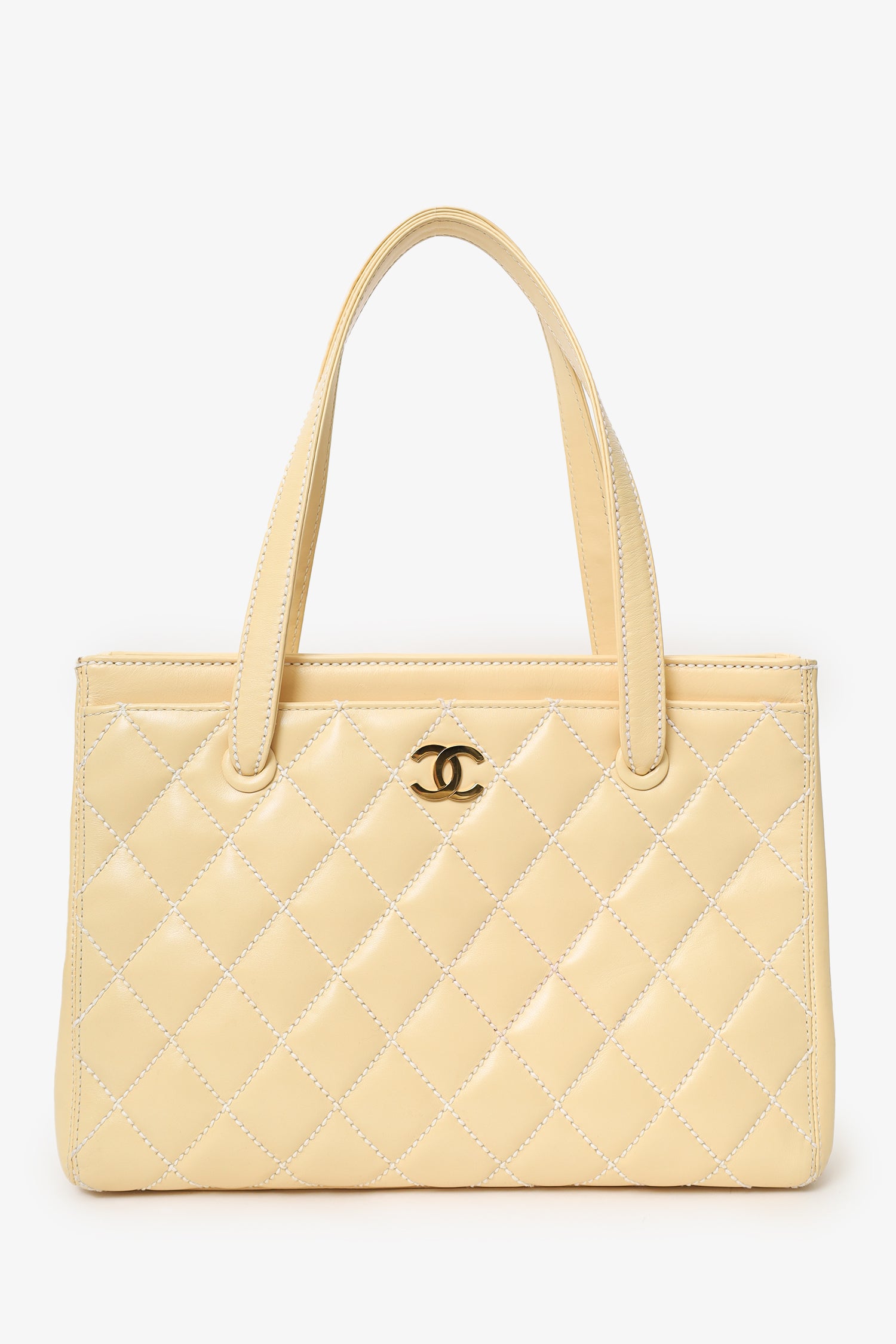 Refresh availabilityPre-Loved Chanel™ 2004-05 Beige Leather Wild Stitch Surpique Tote Bag. Top interior snap-button closure. Twin shoulder straps. Front and rear exterior slip compartment. Protective base studs. Lined interior. 2 interior pockets; 1 slip and 1 zip. Gold-tone hardware. Contrast stitching.