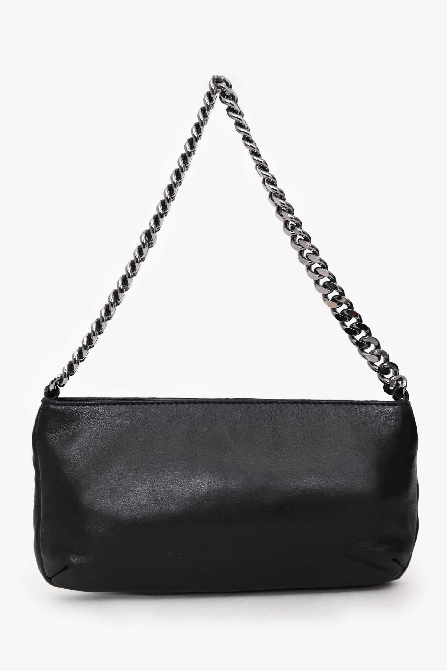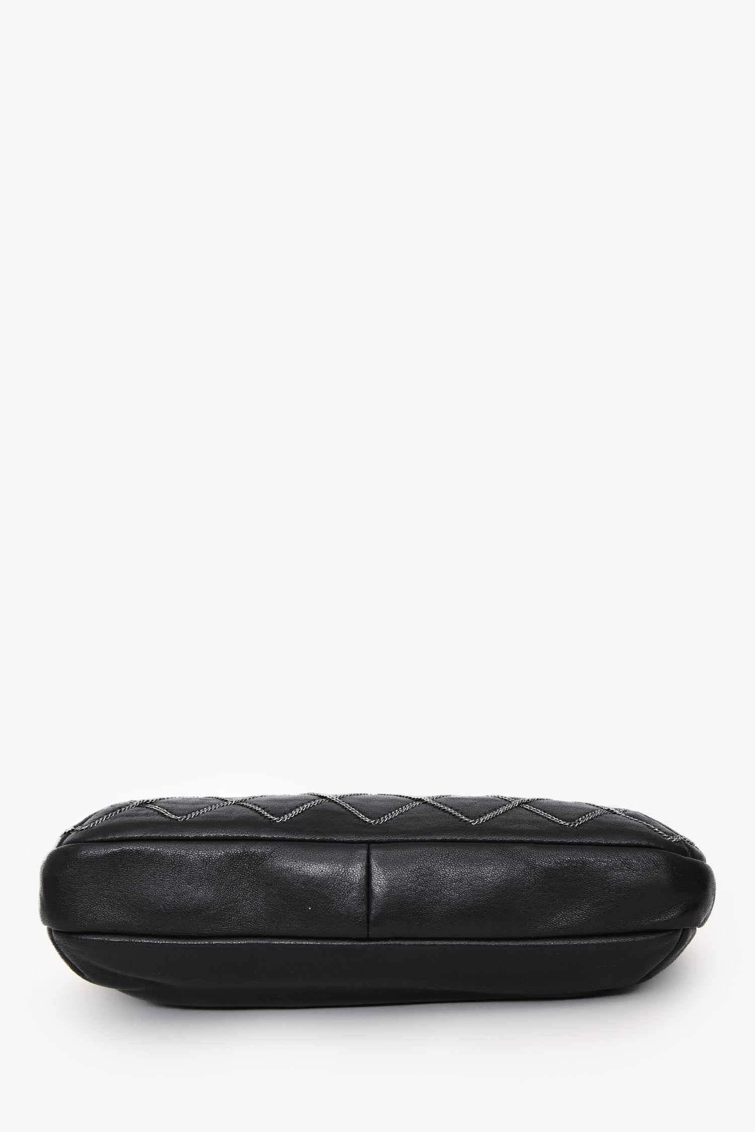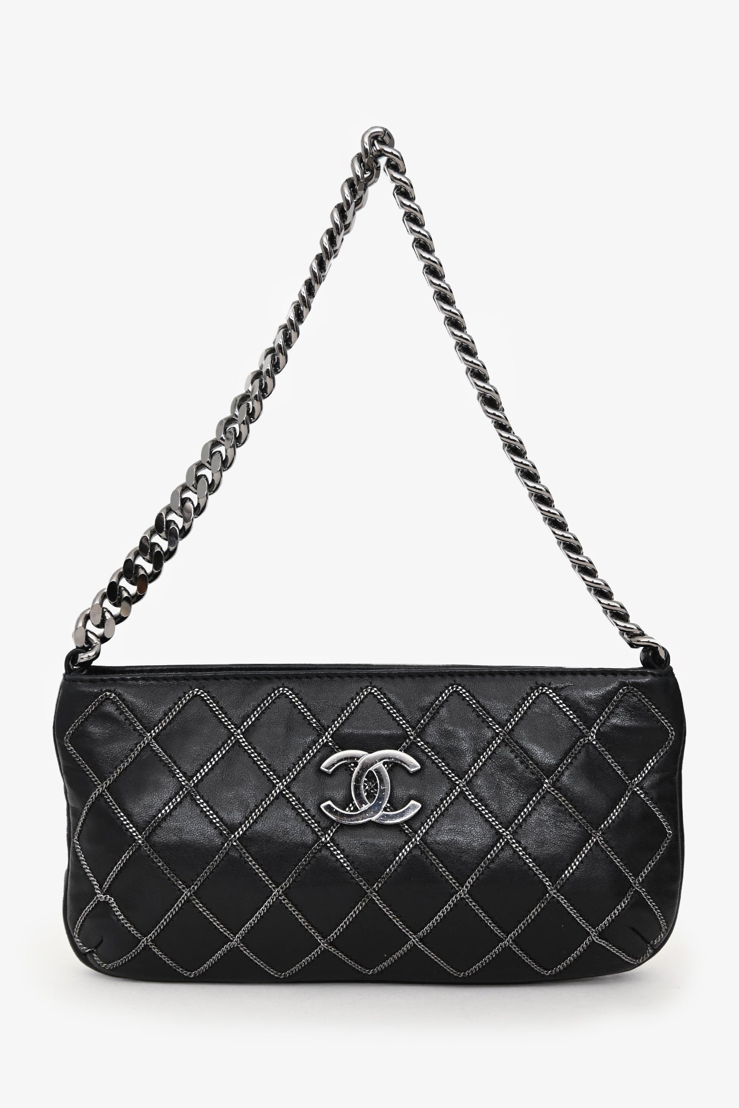 Pre-Loved Chanel™ 2004/05 Black Leather Chain Stitch Pochette Shoulder Bag. Zipper closure at the top. Single chain handle. Single interior wall zip pocket. Textile lined. Silver-tone hardware. Tonal stitching.