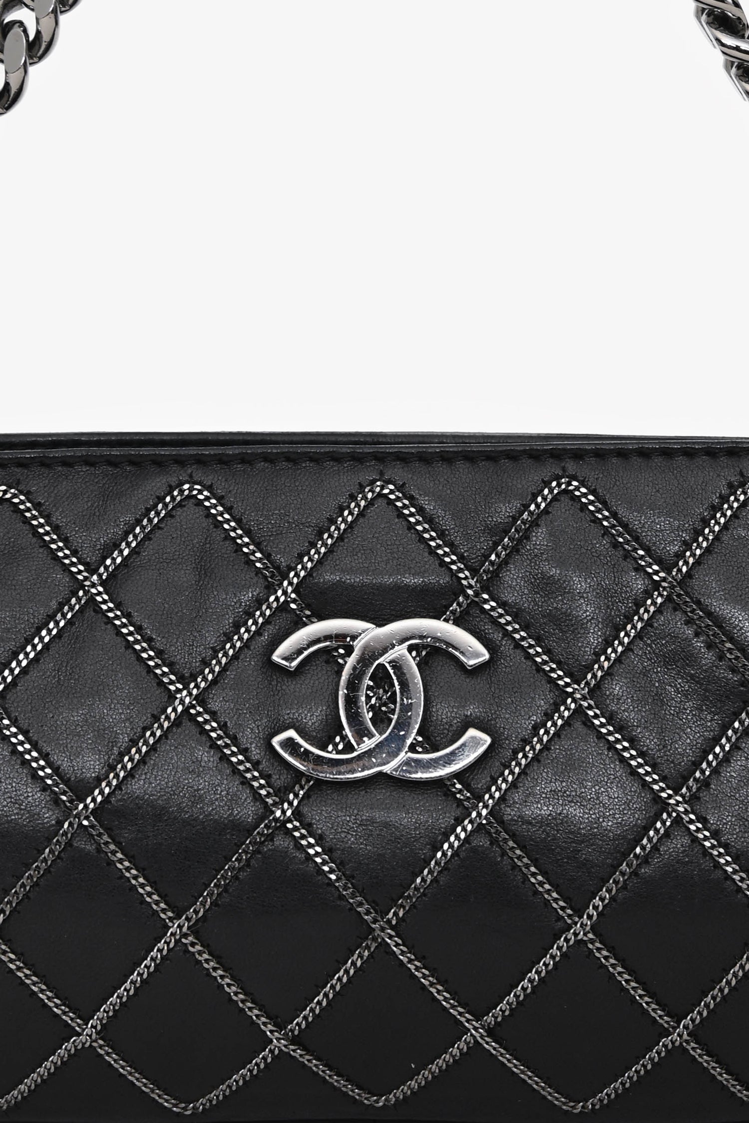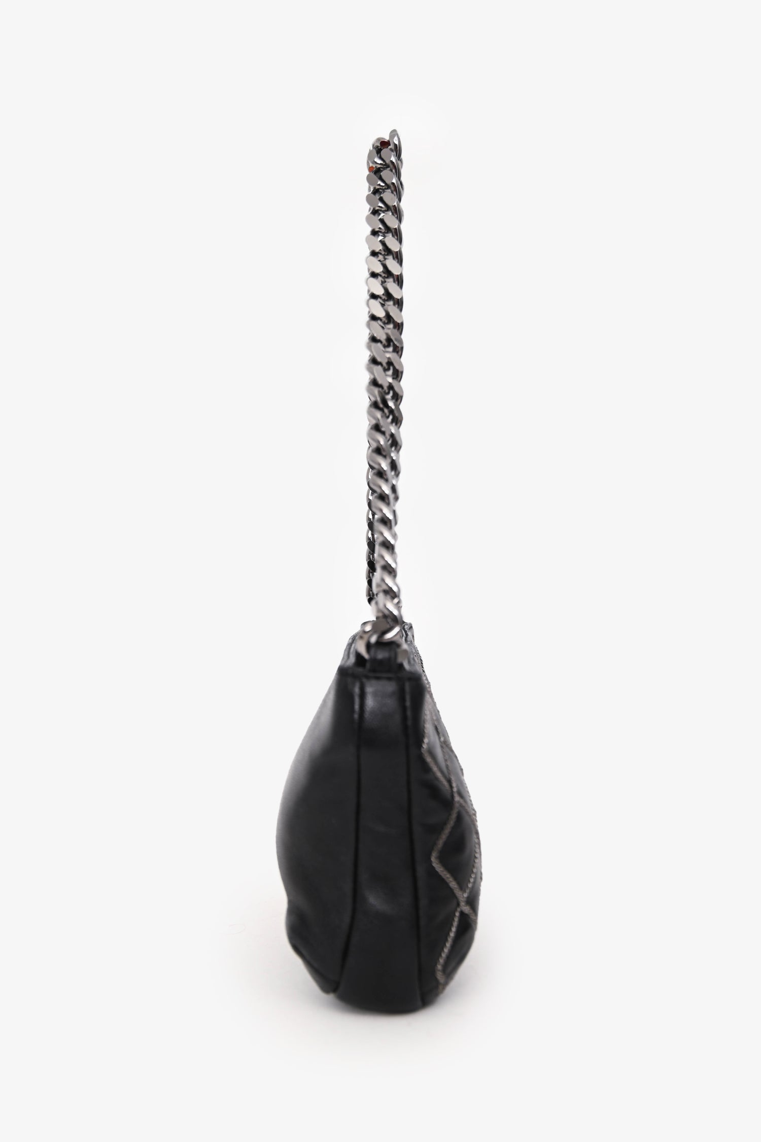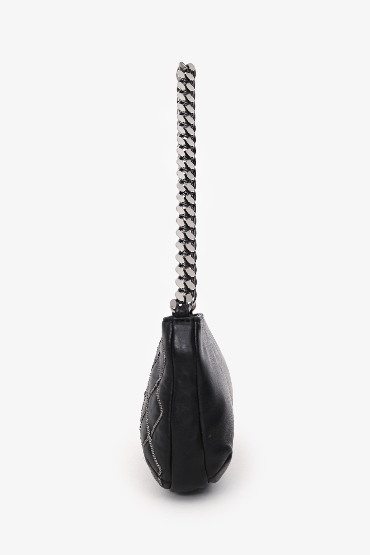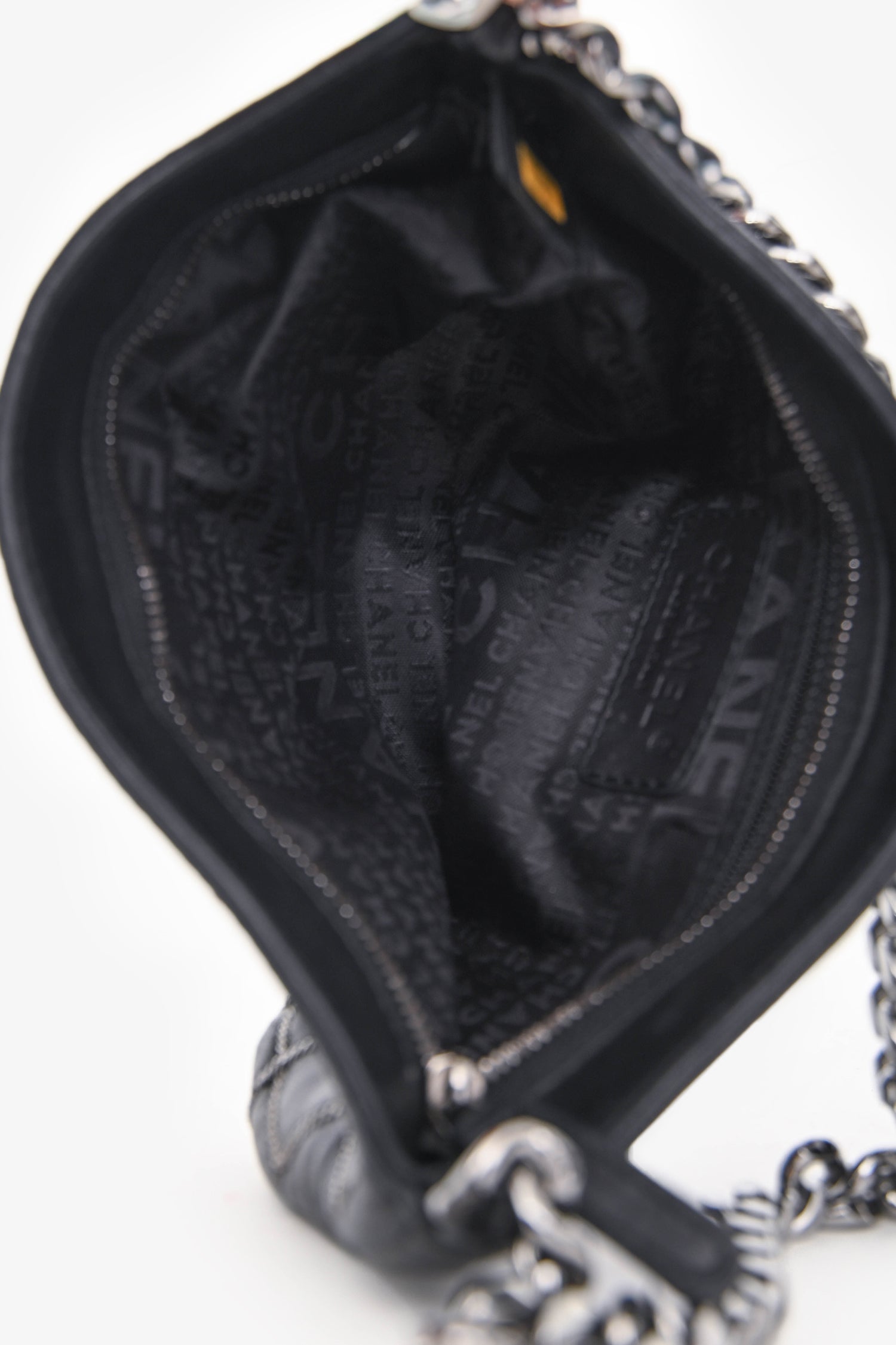 Pre-Loved Chanel™ 2004/05 Black Leather Chain Stitch Pochette Shoulder Bag. Zipper closure at the top. Single chain handle. Single interior wall zip pocket. Textile lined. Silver-tone hardware. Tonal stitching.