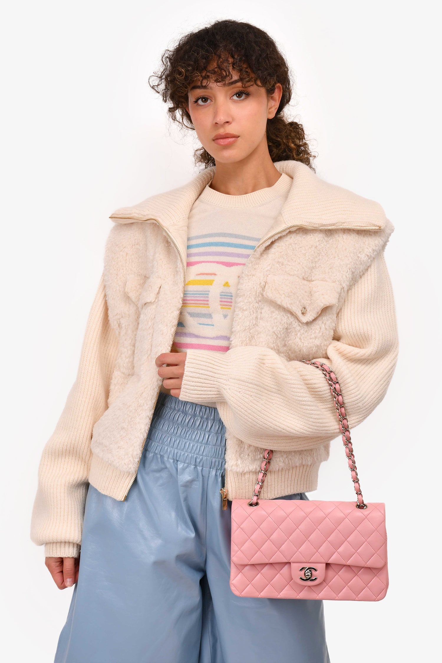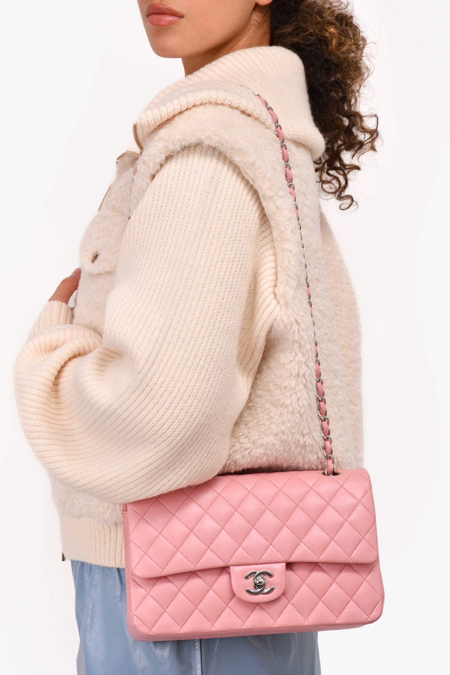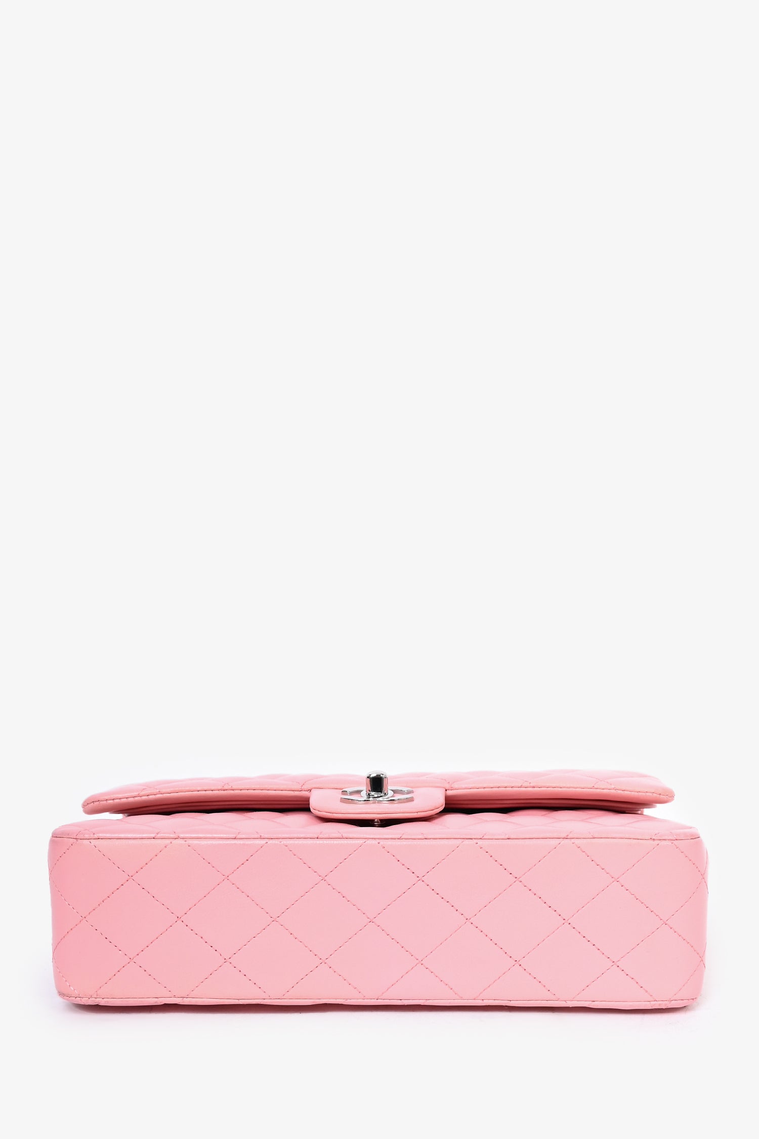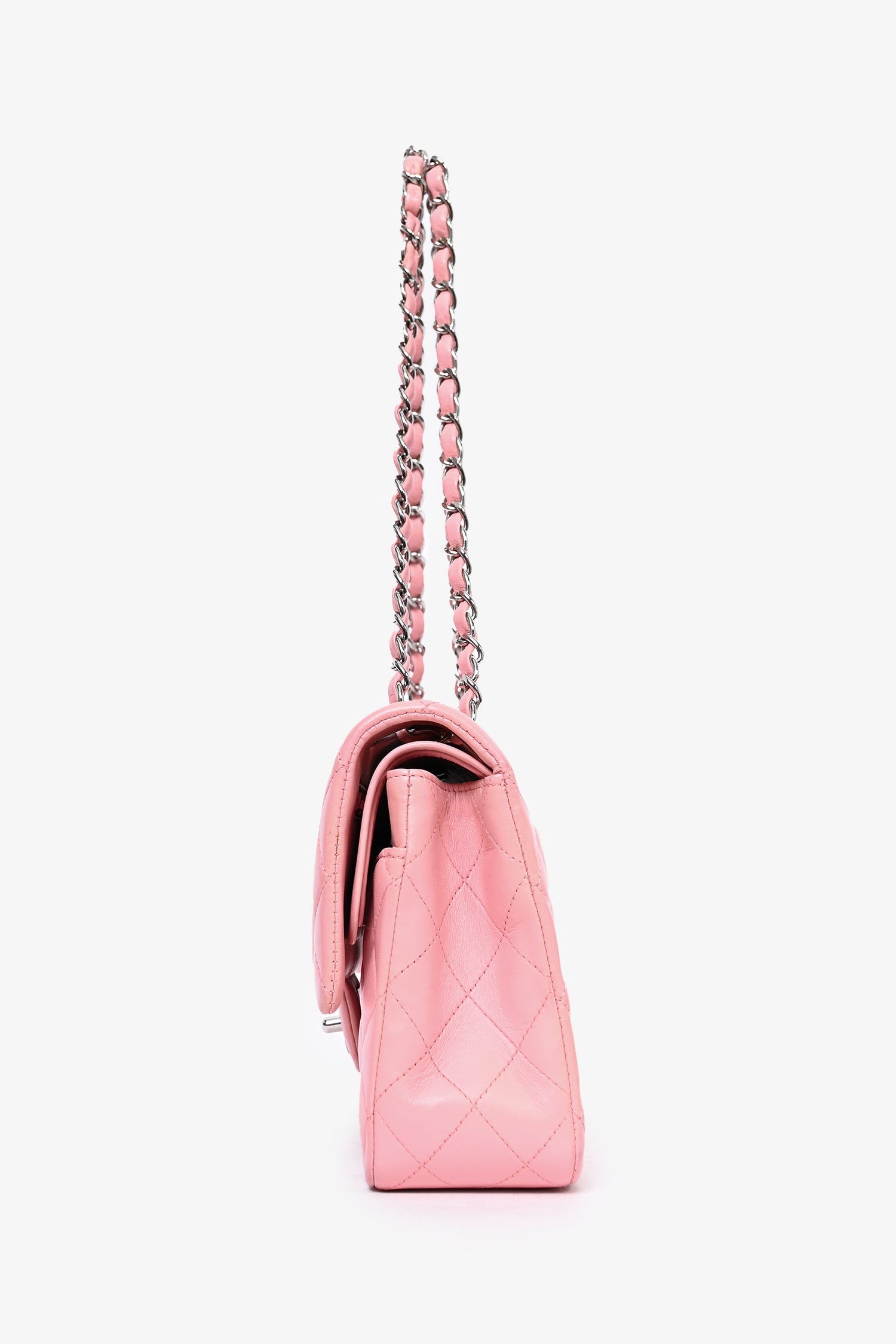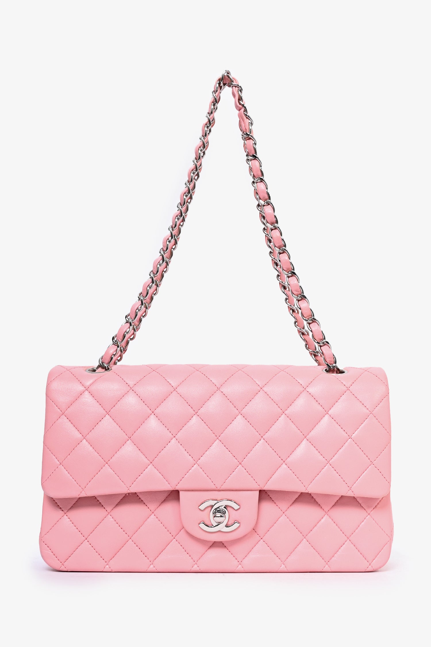 Refresh availabilityPre-Loved Chanel™ 2005/06 Pink Lambskin Medium Double Flap. Front fold-over flap with turn-lock closure. 2 interior wall slip pockets. 1 zippered pocket at the interior of the front flap. Slide-around chain. Silver-tone hardware.