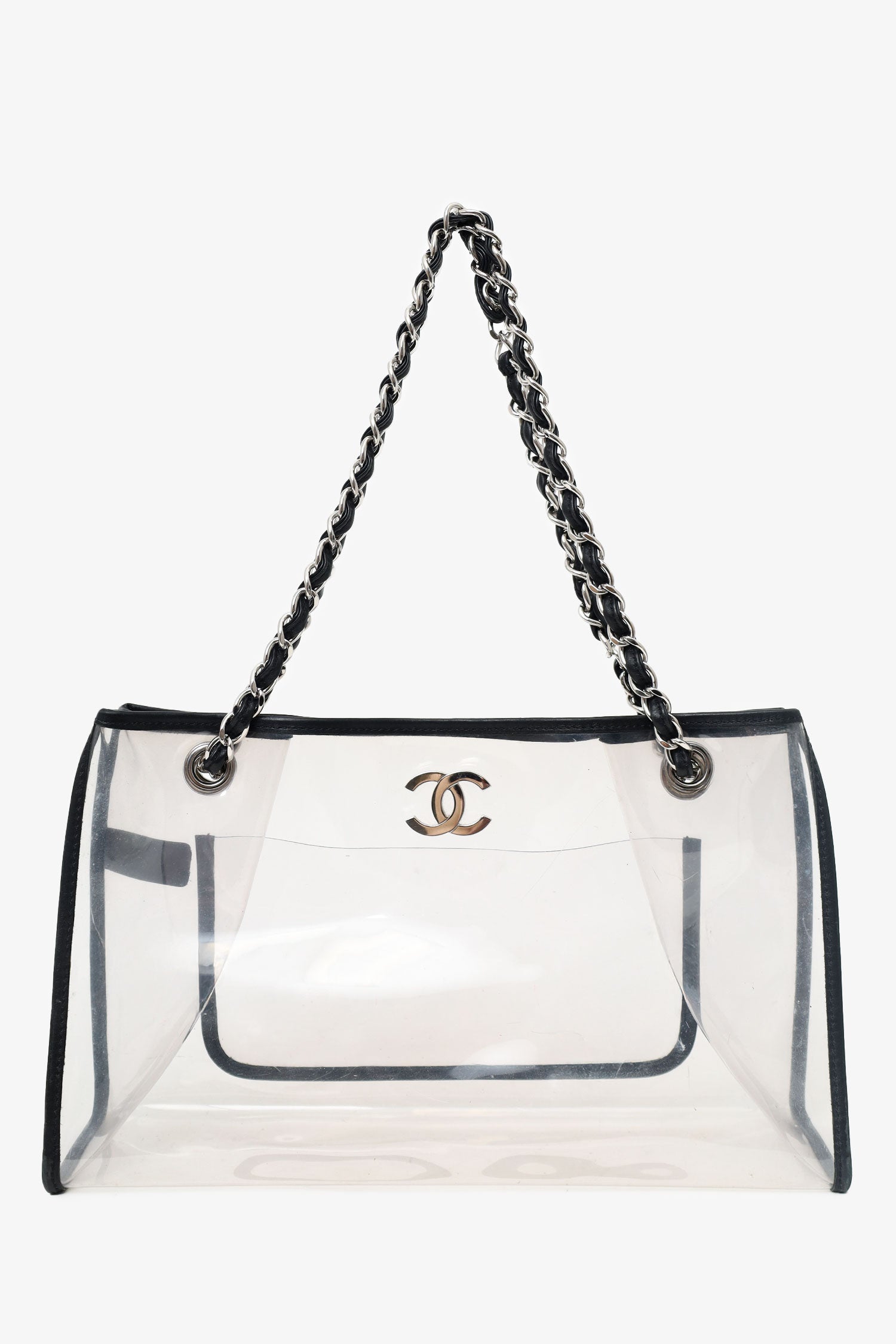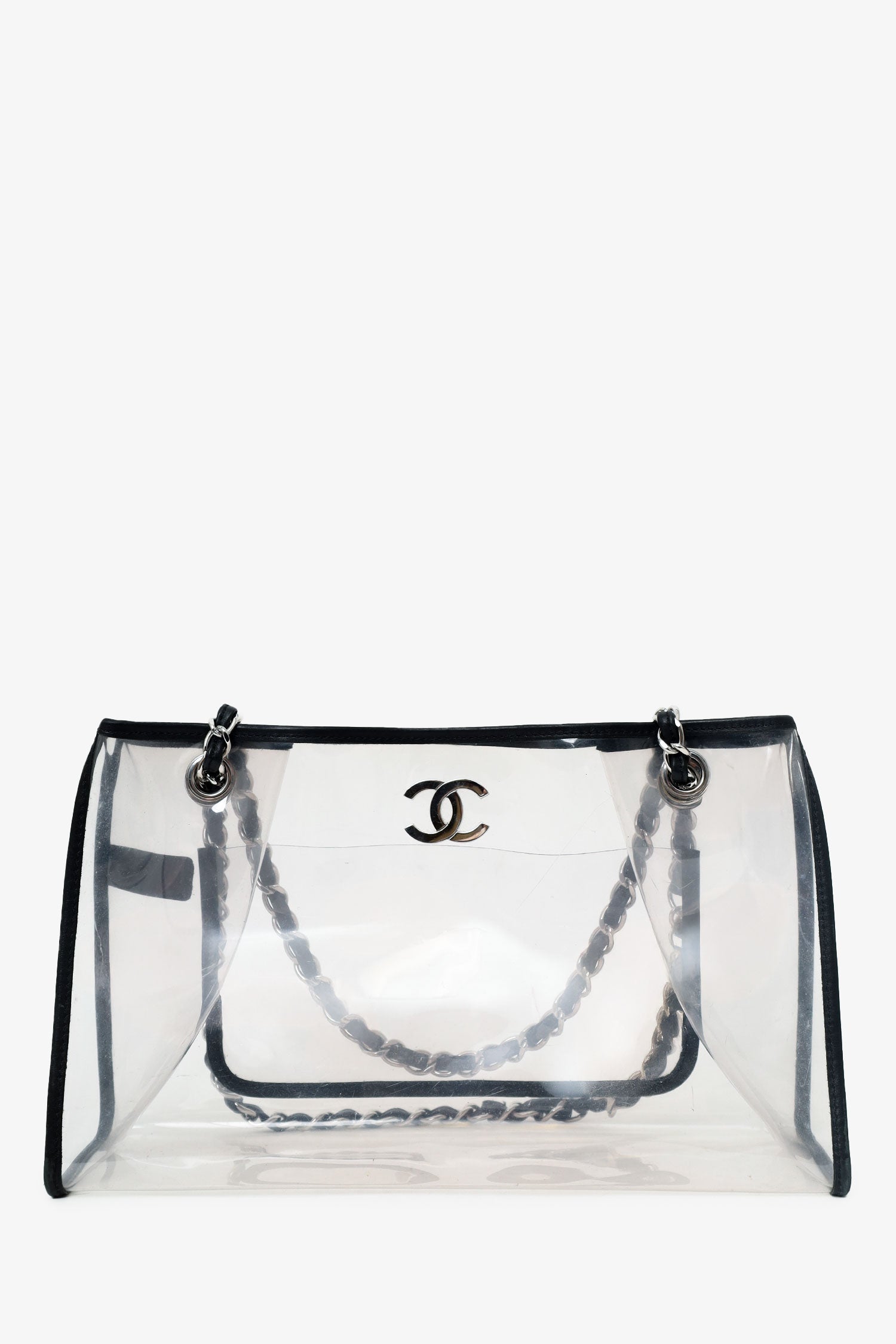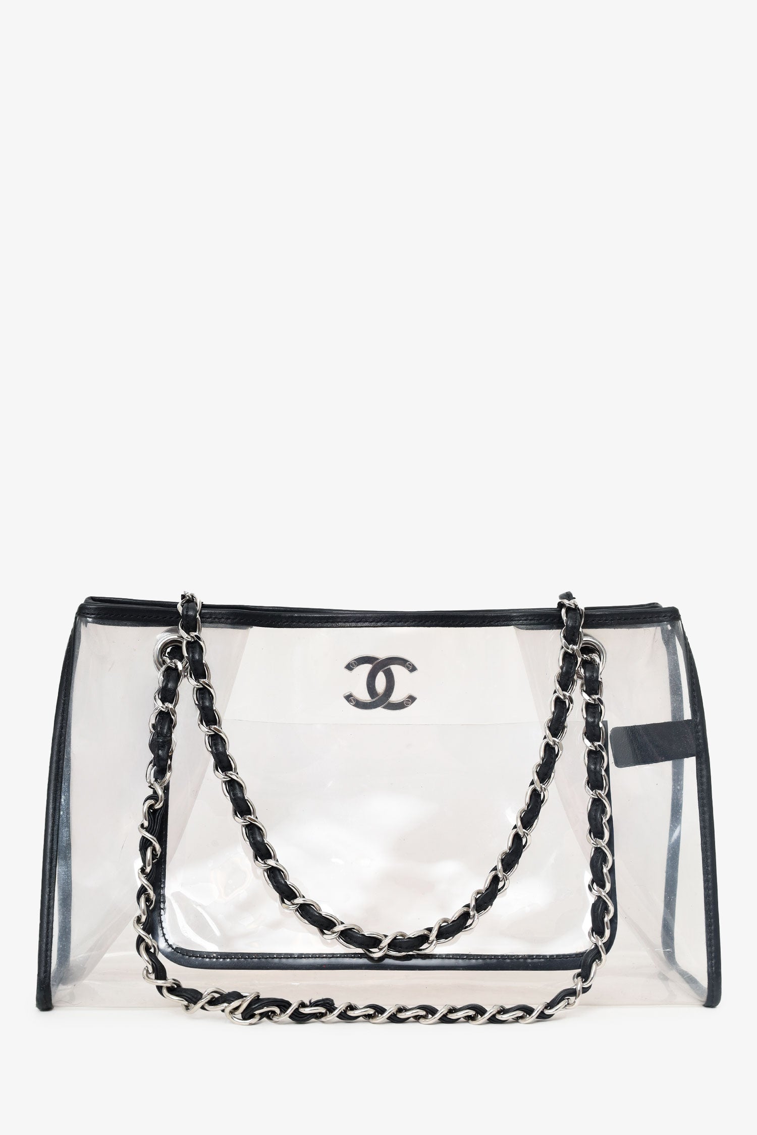 Refresh availabilityPre-Loved Chanel™ 2006-08 Black PVC Leather Trimmed CC Tote. Top opening. Double chainlink straps that can be pulled in and extended into one long strap. Clear body. Single interior slip pocket. Silver-tone hardware. Tonal stitching.