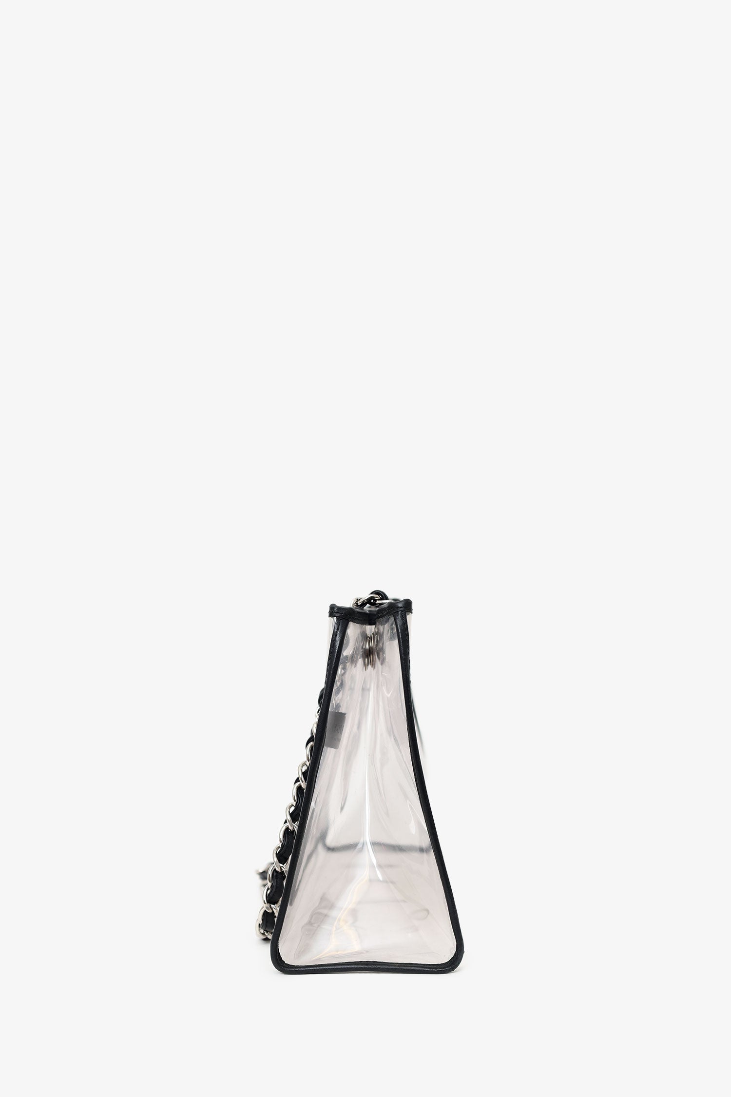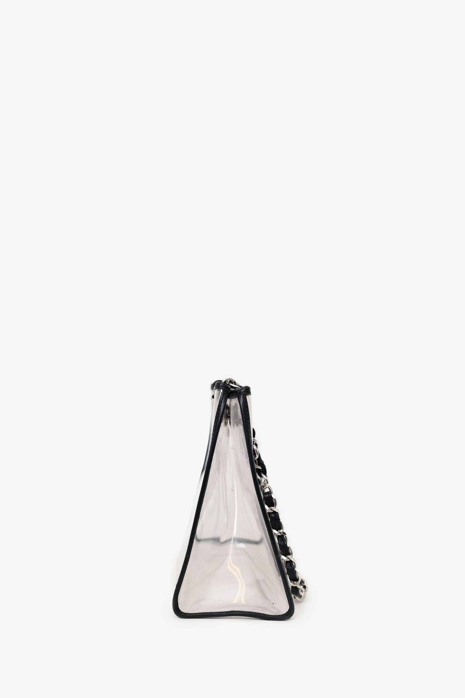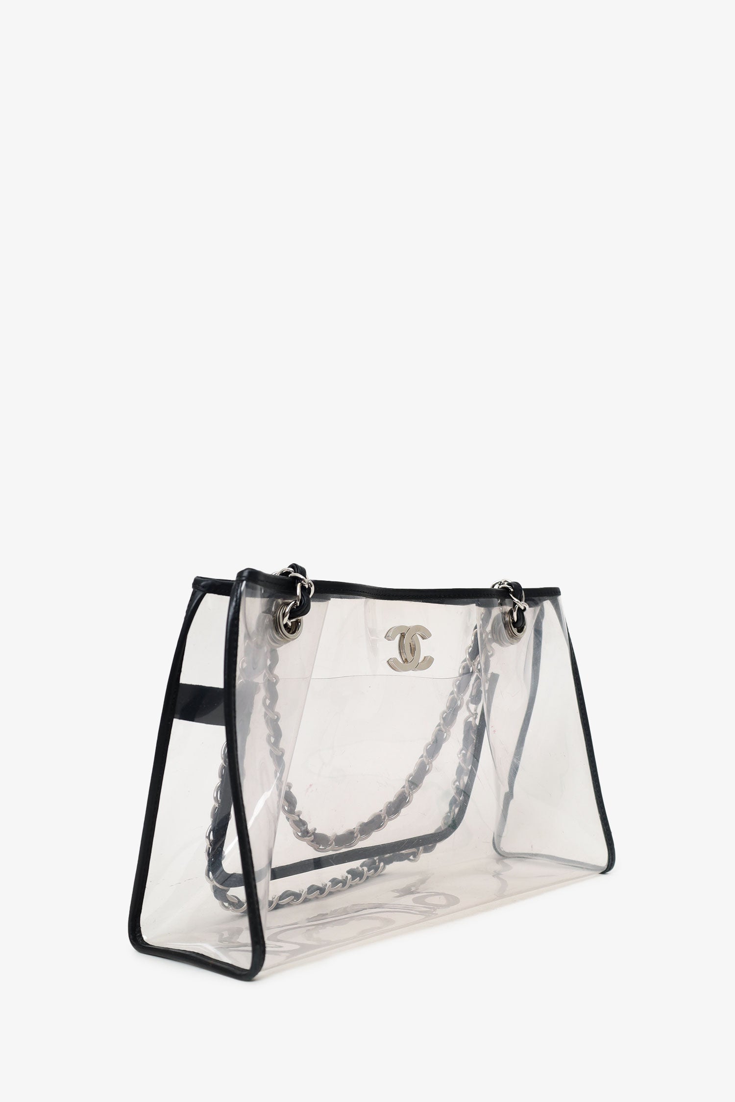 Refresh availabilityPre-Loved Chanel™ 2006-08 Black PVC Leather Trimmed CC Tote. Top opening. Double chainlink straps that can be pulled in and extended into one long strap. Clear body. Single interior slip pocket. Silver-tone hardware. Tonal stitching.